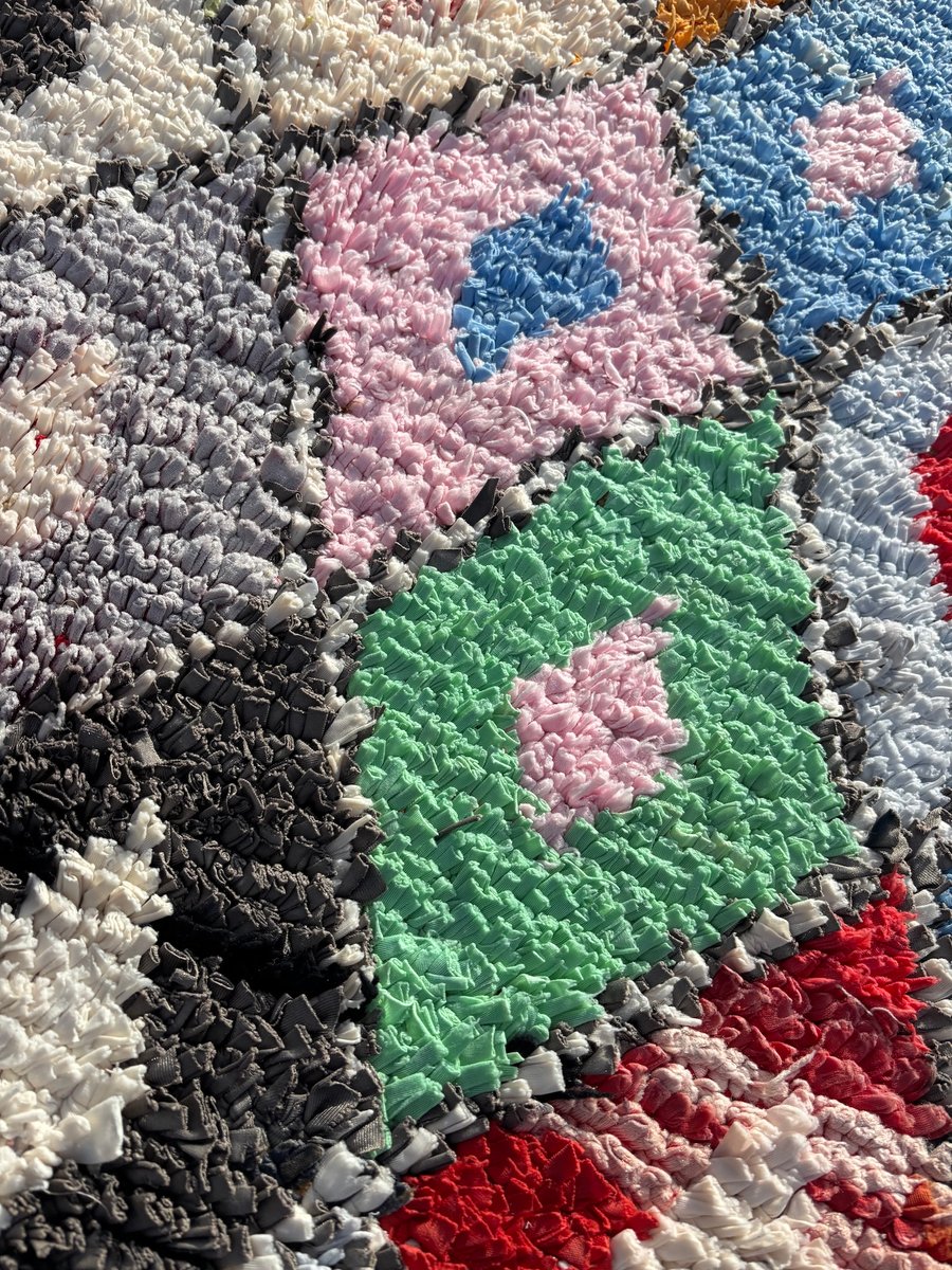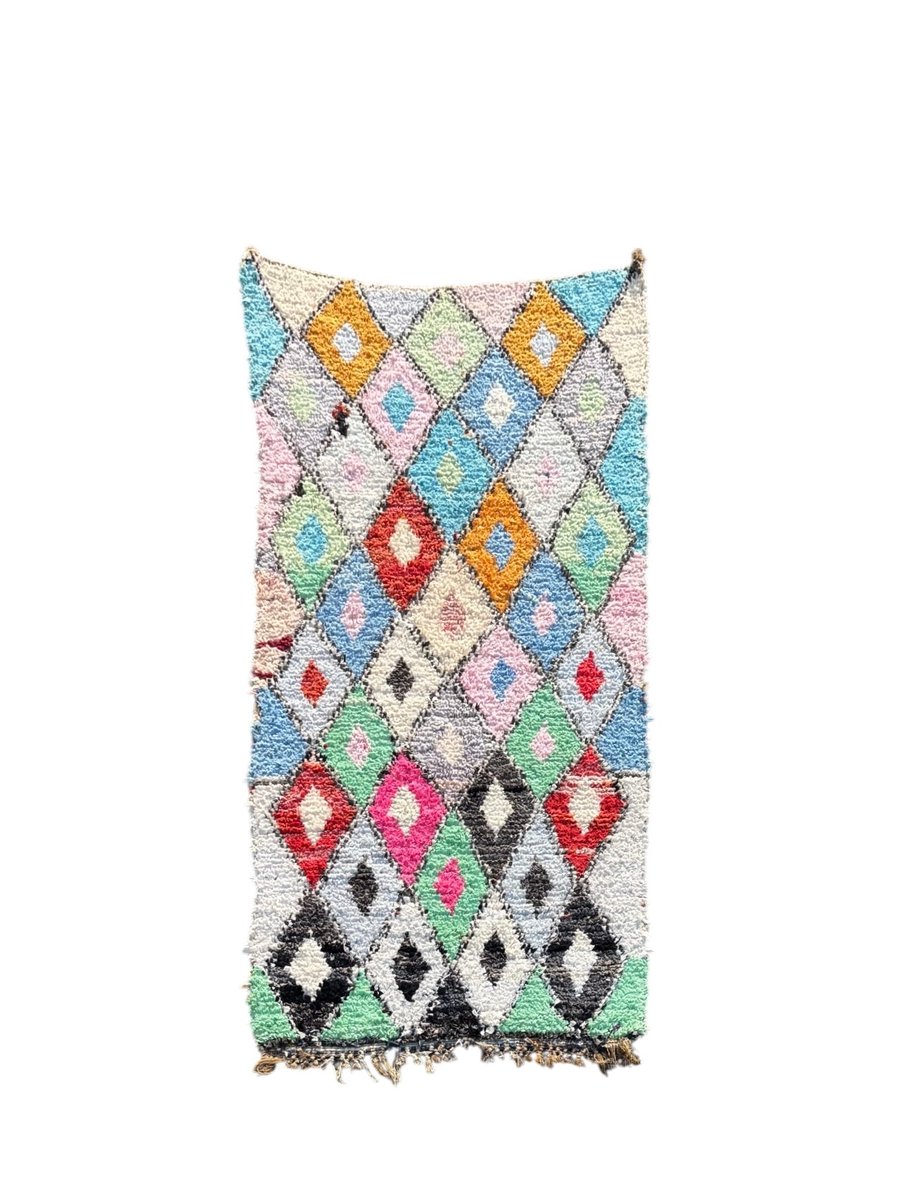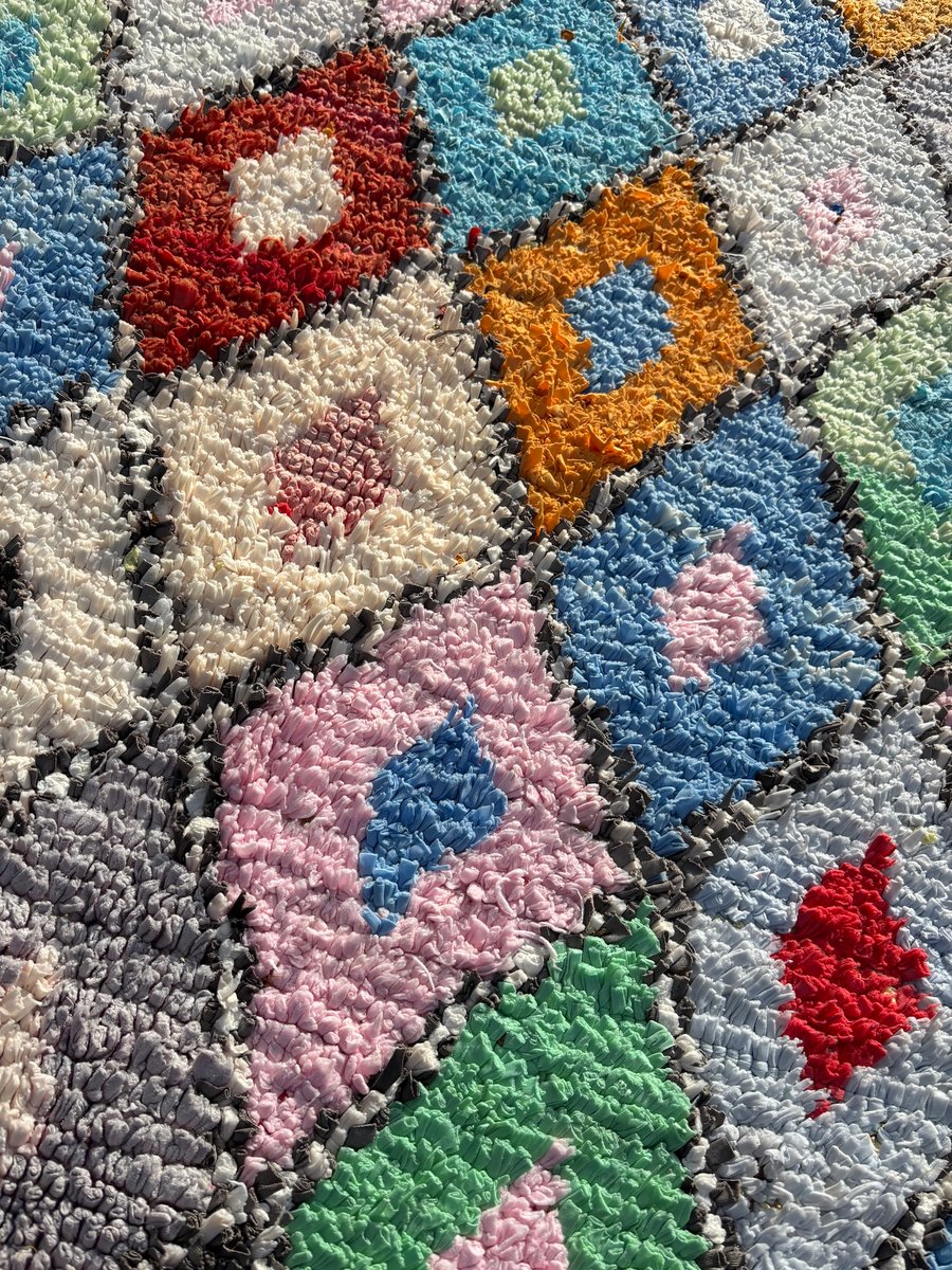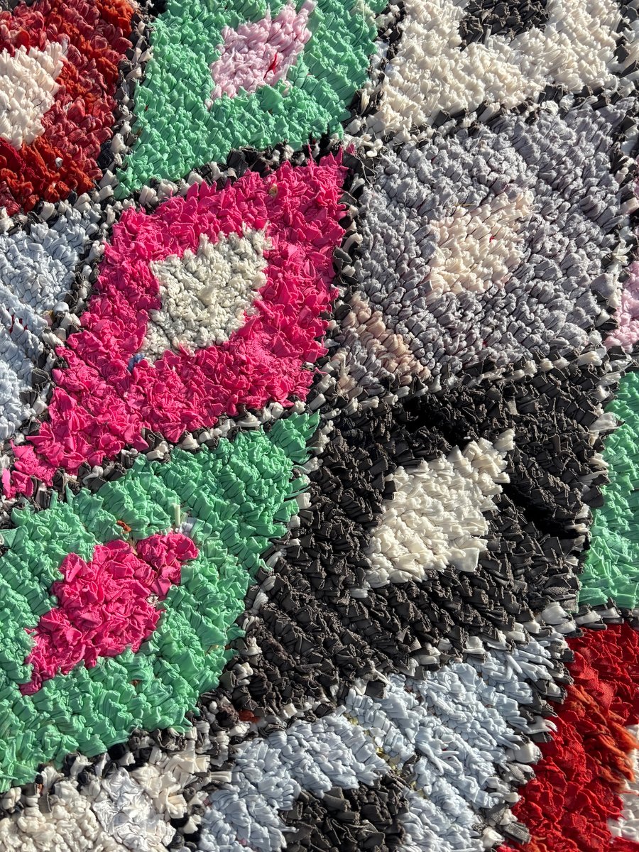 This authentic Moroccan Boucherouite rug is a one-of-a-kind vintage piece, handmade by Berber women in the Middle Atlas Mountains Crafted using a mix of recycled fabrics, this colorful boho rug reflects the creativity and sustainable craftsmanship of Moroccan rural communities