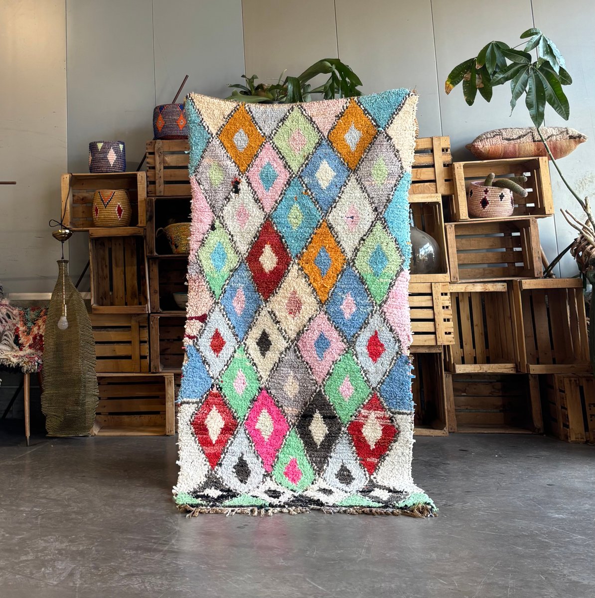 The rug showcases a vibrant palette and iconic diamond patterns, making it an ideal statement piece for eclectic interiors Whether used as a hallway runner, a bedroom accent, or living room decor, this handmade Moroccan rug adds warmth, texture, and artistic charm to any space