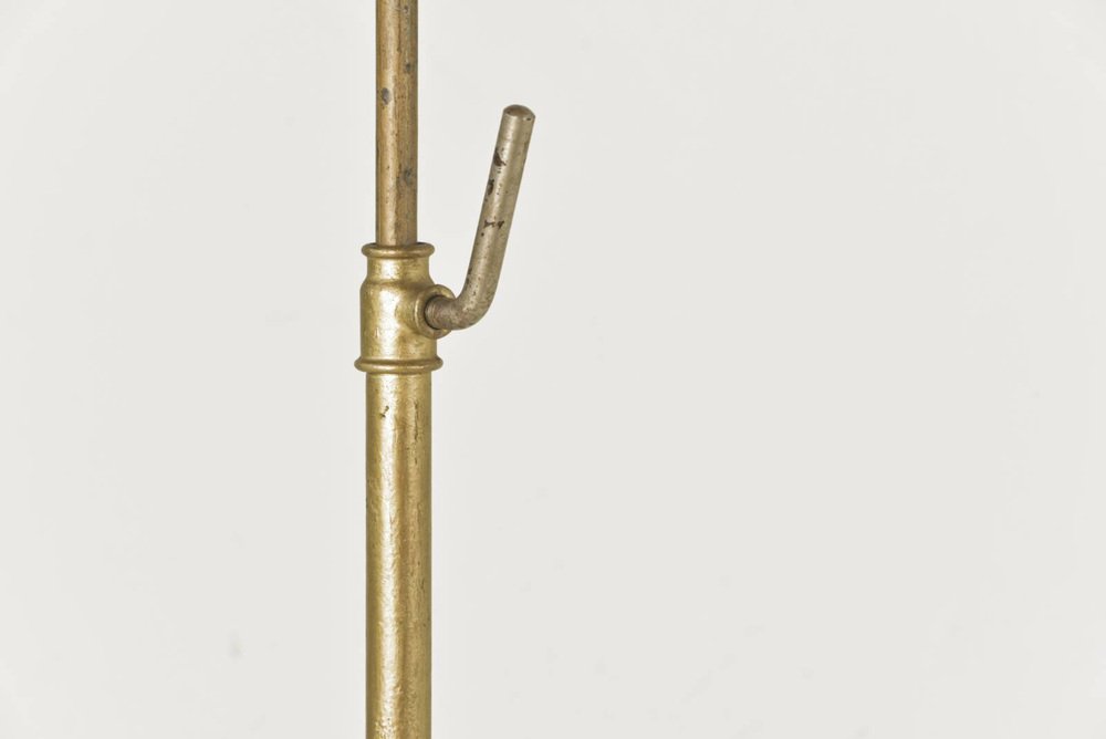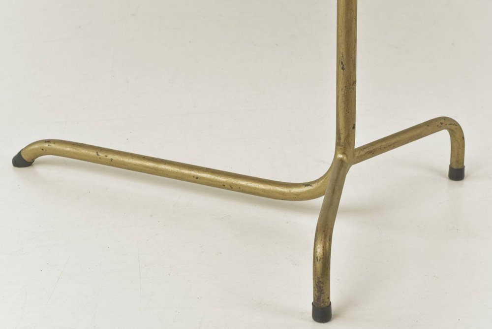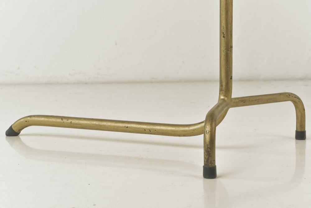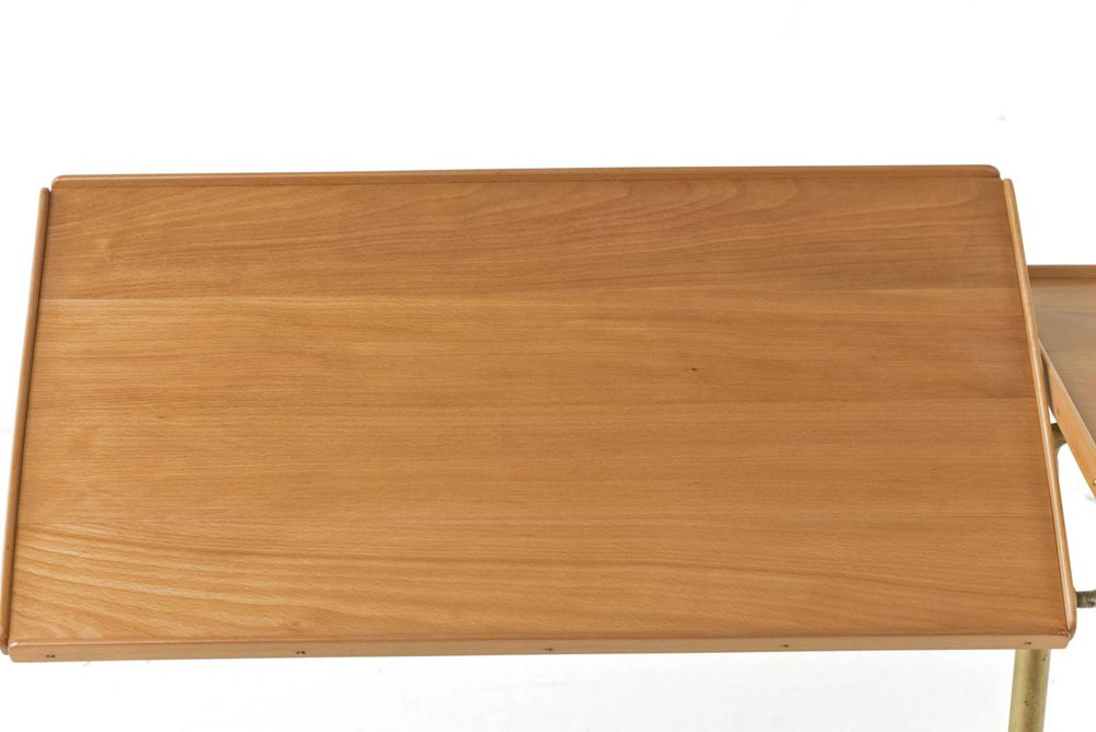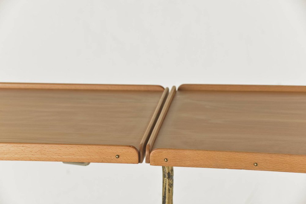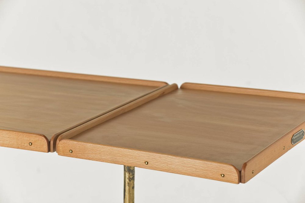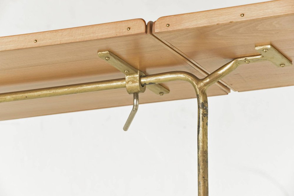 Side table, height adjustable Designer: Factory Design Year: around 1920 Manufacturer: Hausmann A.G., St.Gallen Country: Switzerland Measurements: H 75/100 cm W 100 cm D 38,5 cm Material: Solid beech wood, glued, satin-finished clear lacquer, steel frame old gold-bronzed, plastic caps Condition: good condition Special Remarks: with traces of use. The shelves as well as the side edge consist of solid beech wood strips, glued horizontally in the surface. The fine shelves of the rare side table were professionally stripped, sanded, treated and the semi-gloss clear lacquer was renewed. Now there are no more edges of water. The frame was carefully cleaned.