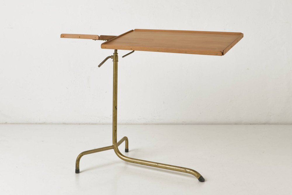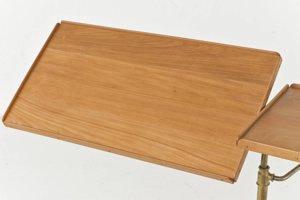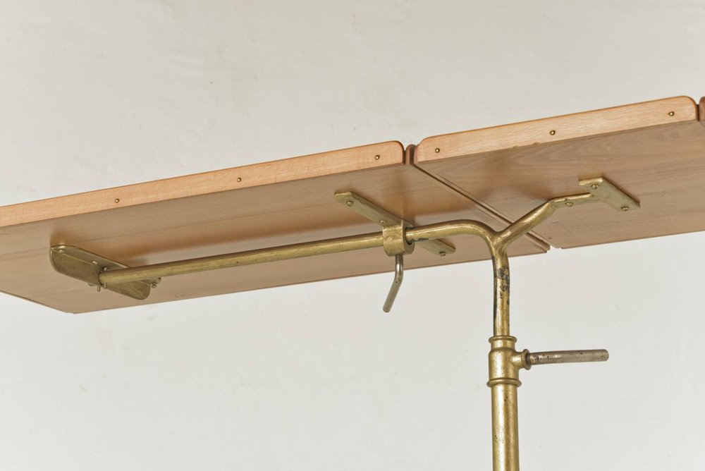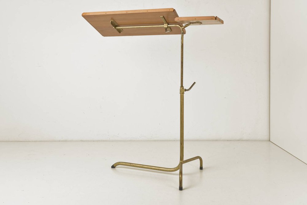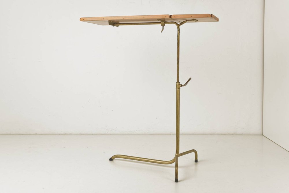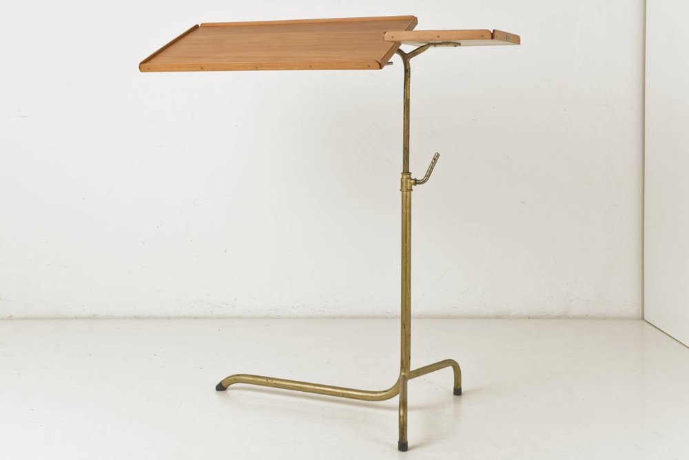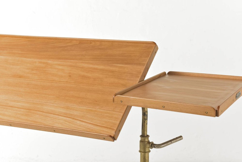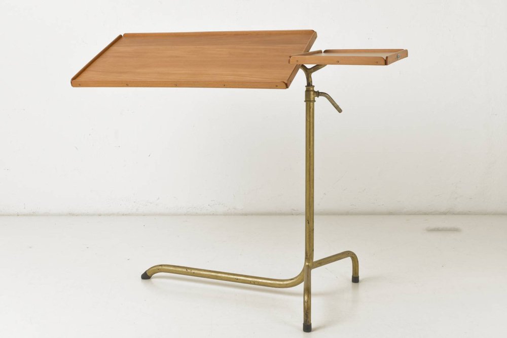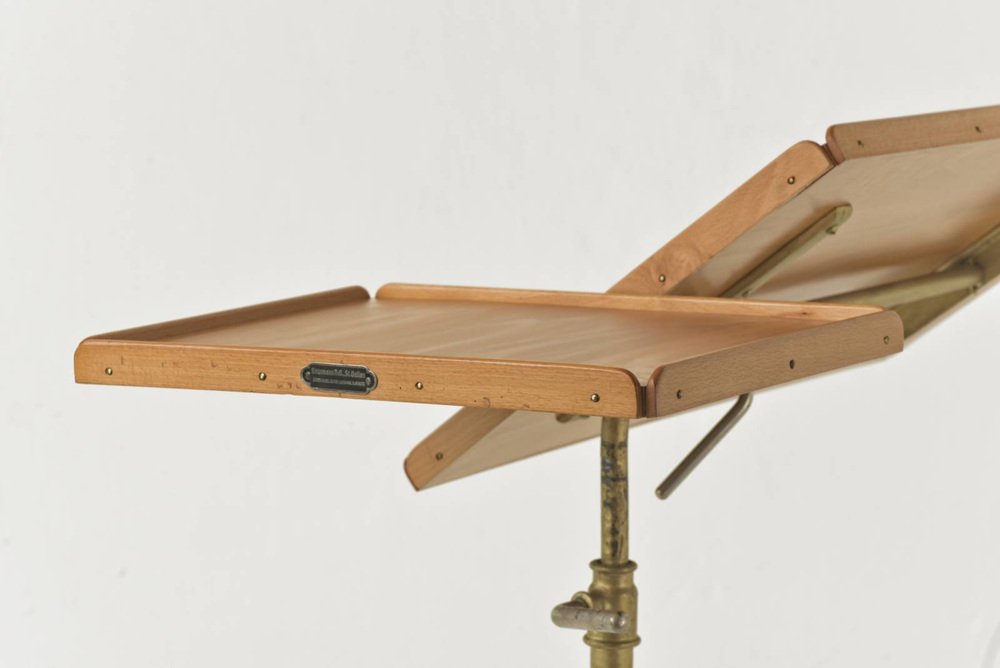 Hausmann AG in St. Gallen was founded in 1872 and produced and sold medicines and medical aids with great success. There were branches in Zurich, Basel, Davos, Lausanne and St.Moritz. The head office was in St. Gallen, where Hausmann AG was the major supplier in this area for more than a century. It is not surprising to find the finest materials in this neat piece of furniture. After careful refurbishment, the furniture can now again fulfill its purpose as an adjustable side table at table height up to a standing desk with stepless adjustment in height and inclination via screw levers. In addition, the table naturally also offers optical qualities!
