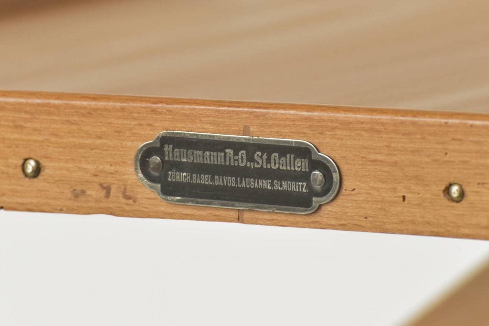 Die Hausmann AG in St. Gallen wurde 1872 gegründet und produzierte und vertrieb mit grossem Erfolg Medikamente und medizinische Hilfsmittel. Es gab Filialen in Zürich, Basel, Davos, Lausanne und St. Moritz. Der Hauptsitz befand sich in St. Gallen, wo die Hausmann AG mehr als ein Jahrhundert lang der wichtigste Anbieter in diesem Bereich war. So ist es nicht verwunderlich, dass in diesem schmucken Möbelstück feinste Materialien verarbeitet wurden. Nach sorgfältiger Aufarbeitung kann das Möbel nun wieder seinen Zweck als verstellbarer Beistelltisch in Tischhöhe bis hin zum Stehpult mit stufenloser Verstellung in Höhe und Neigung über Schraubhebel erfüllen. Darüber hinaus bietet der Tisch natürlich auch optische Qualitäten!