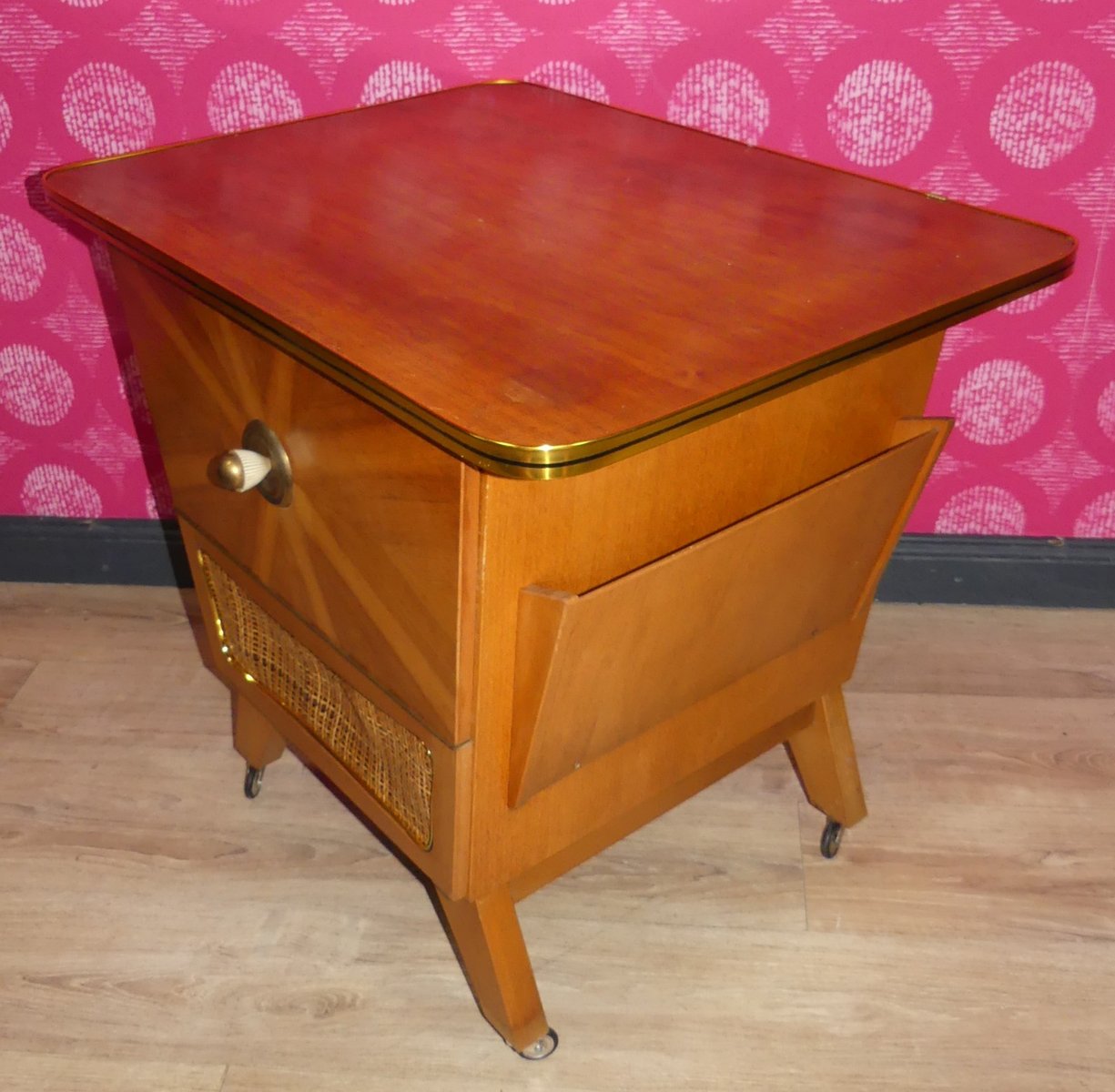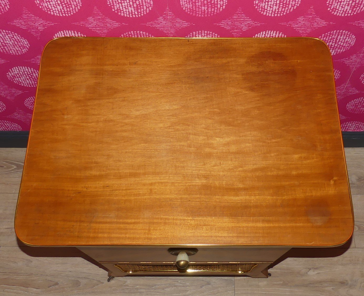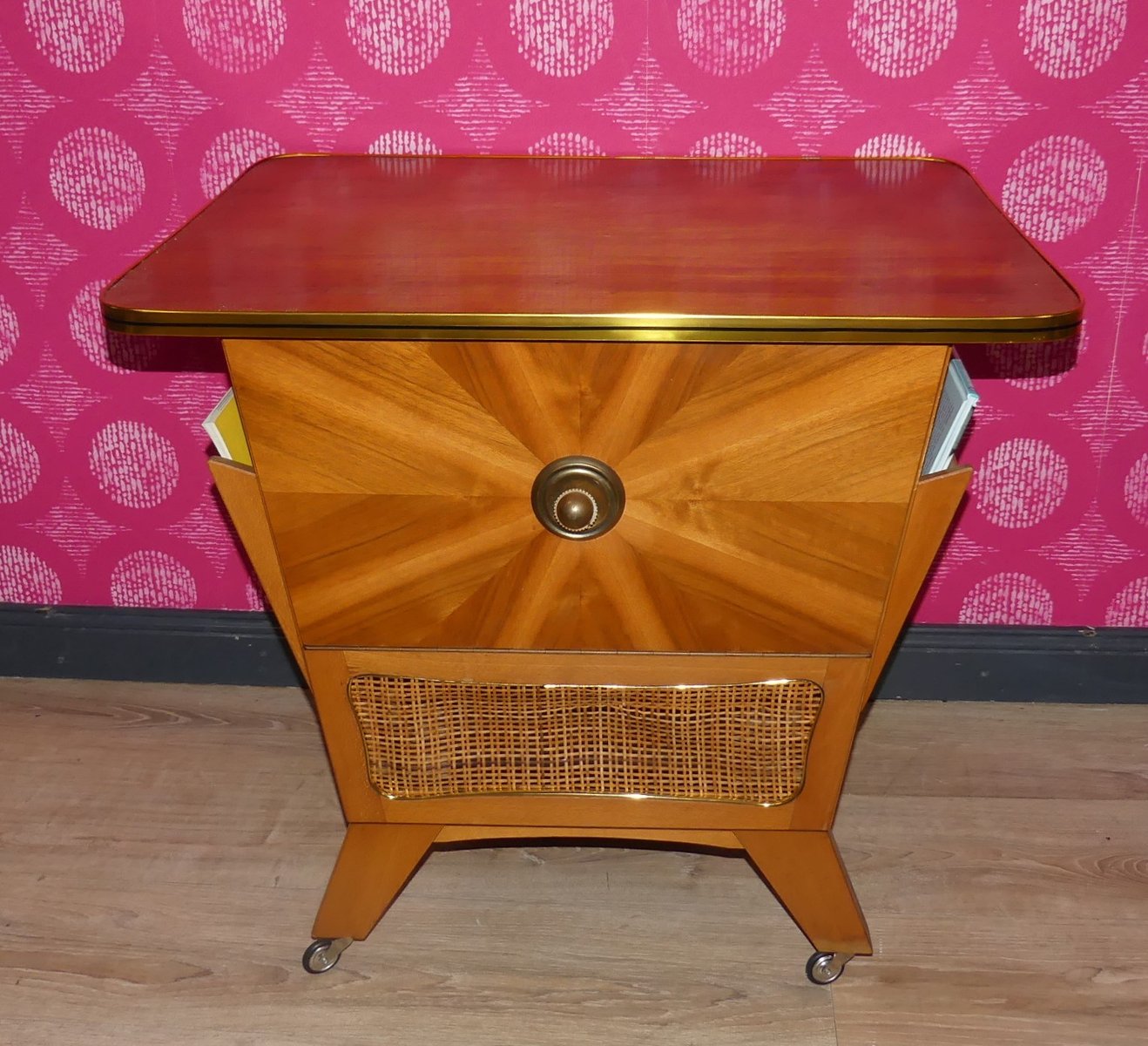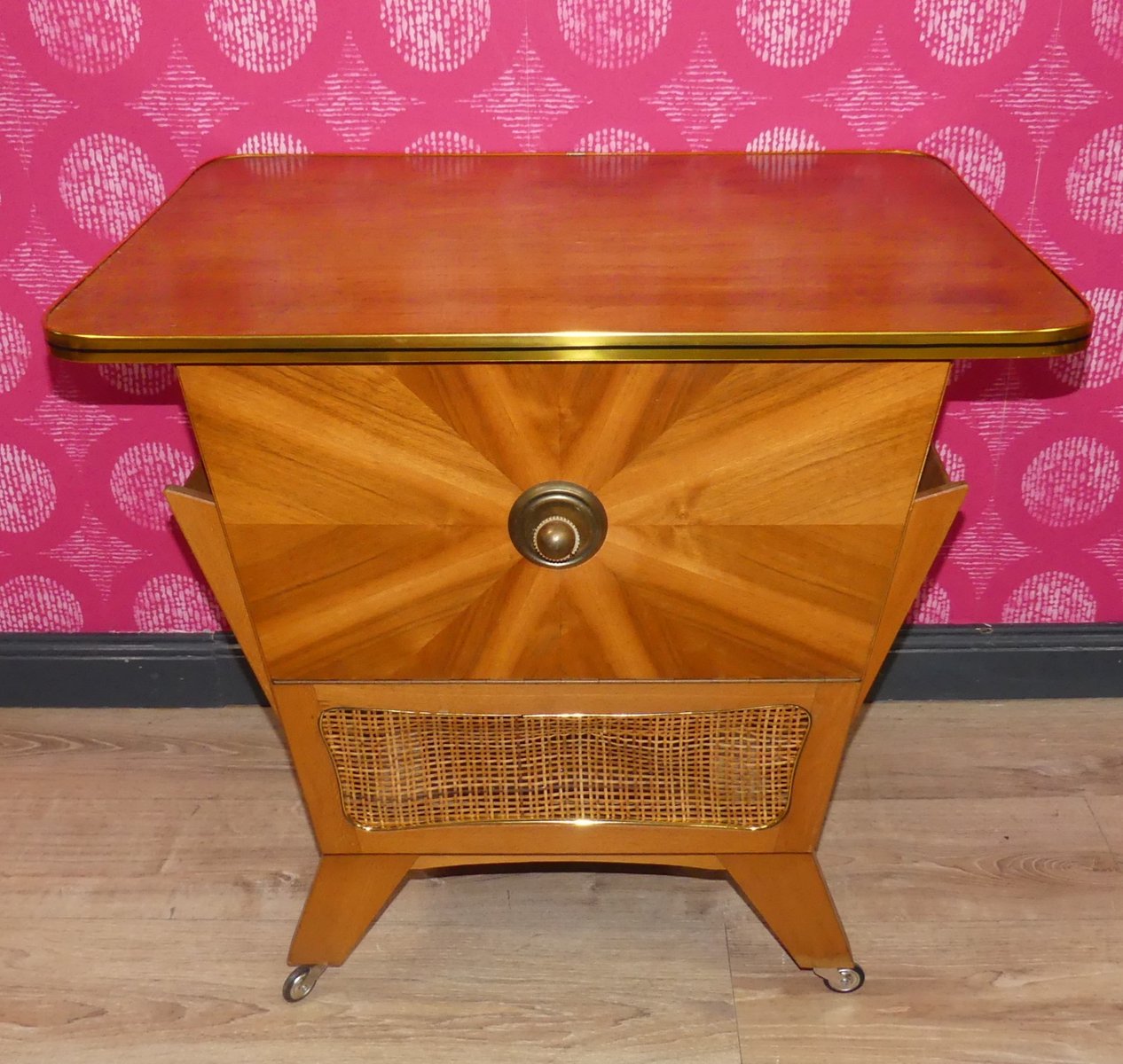 Very good vintage condition, minor signs of wear typical for its age: the shelf has shadow marks and the wickerwork at the bottom is dented.
