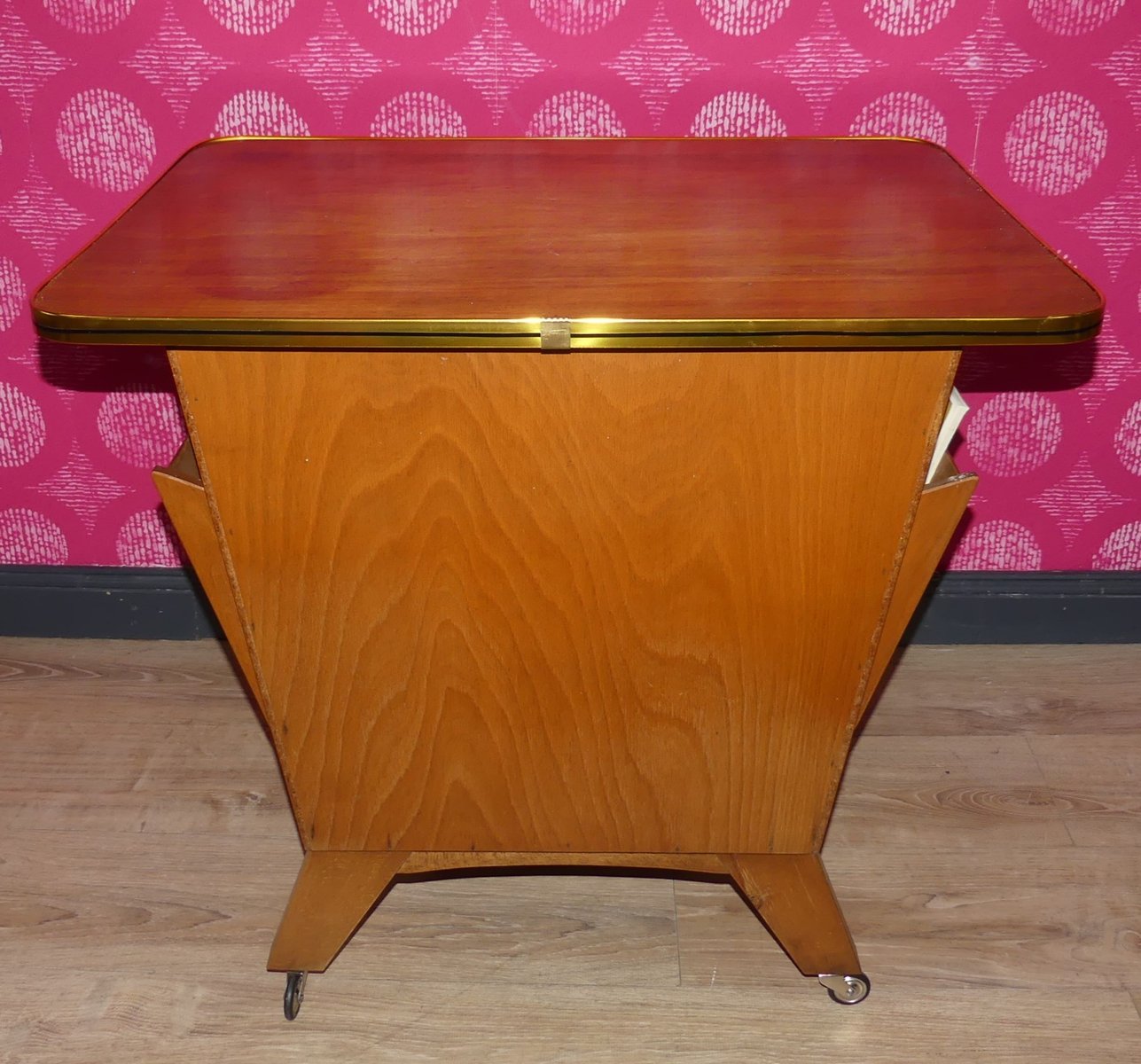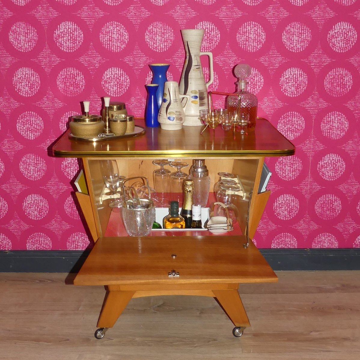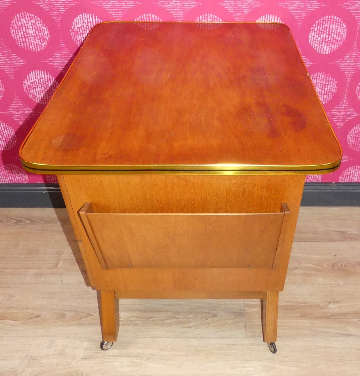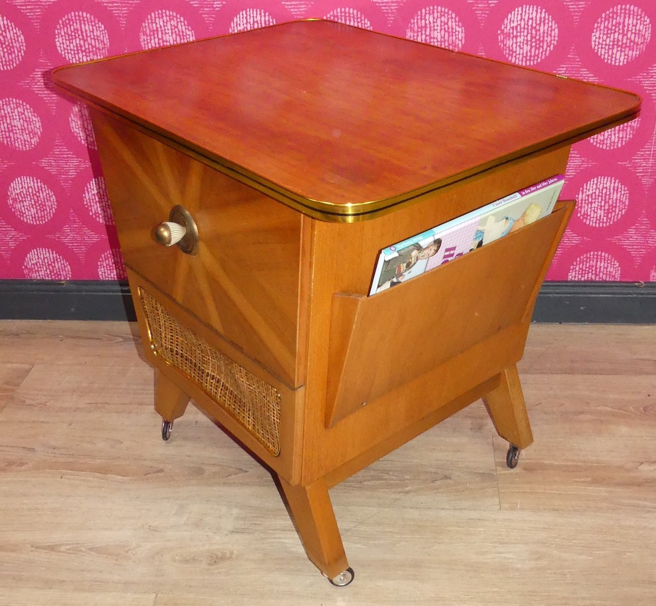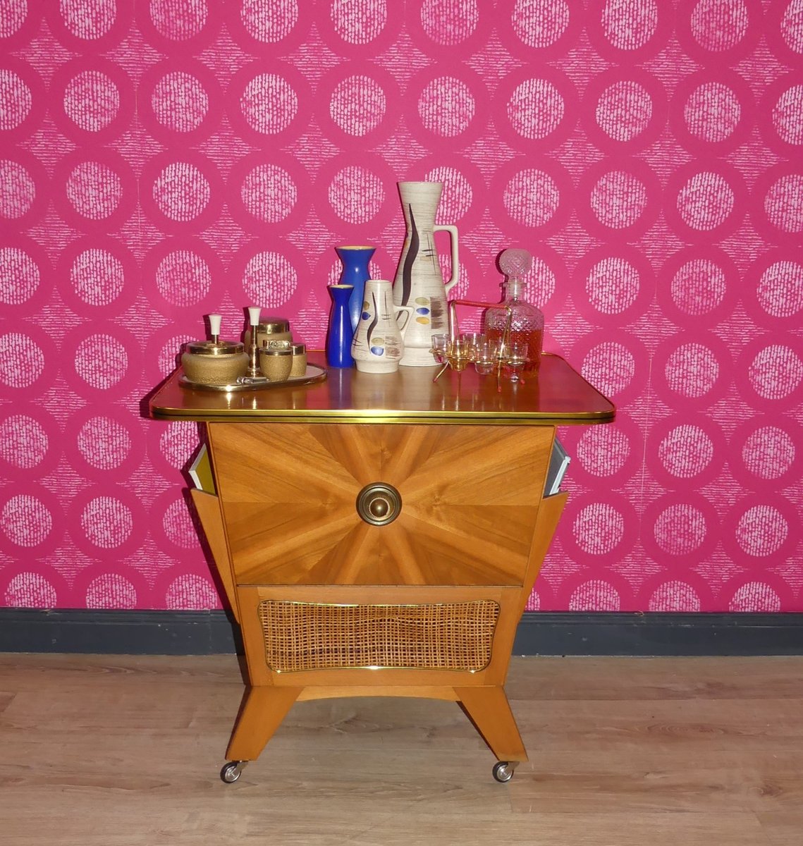 Very good vintage condition, minor signs of wear typical for its age: the shelf has shadow marks and the wickerwork at the bottom is dented.