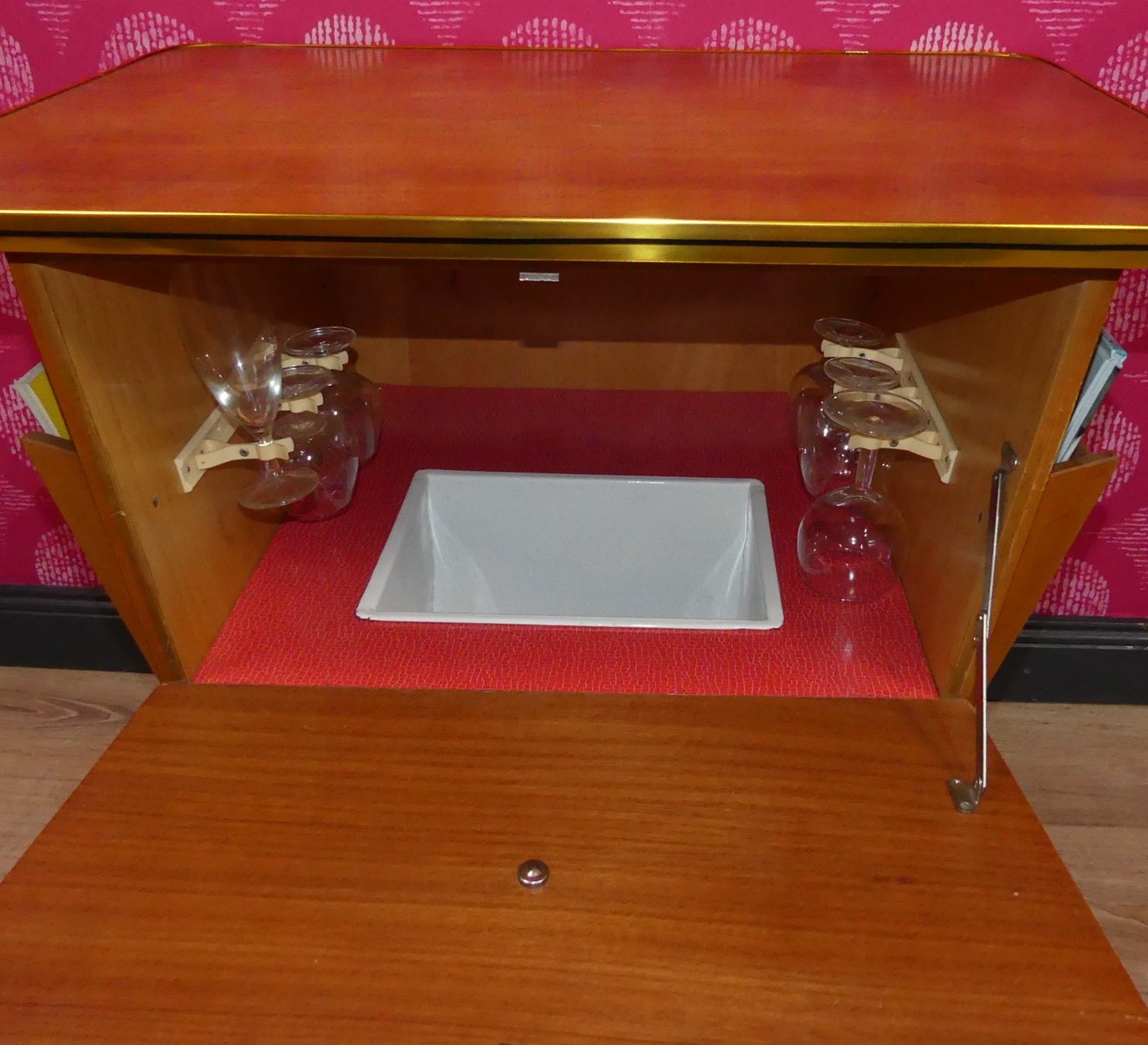 Plastic holders for glasses on each side inside, with a deep, enameled beverage compartment (removable) in the middle. Ice cubes can be added for cooling.