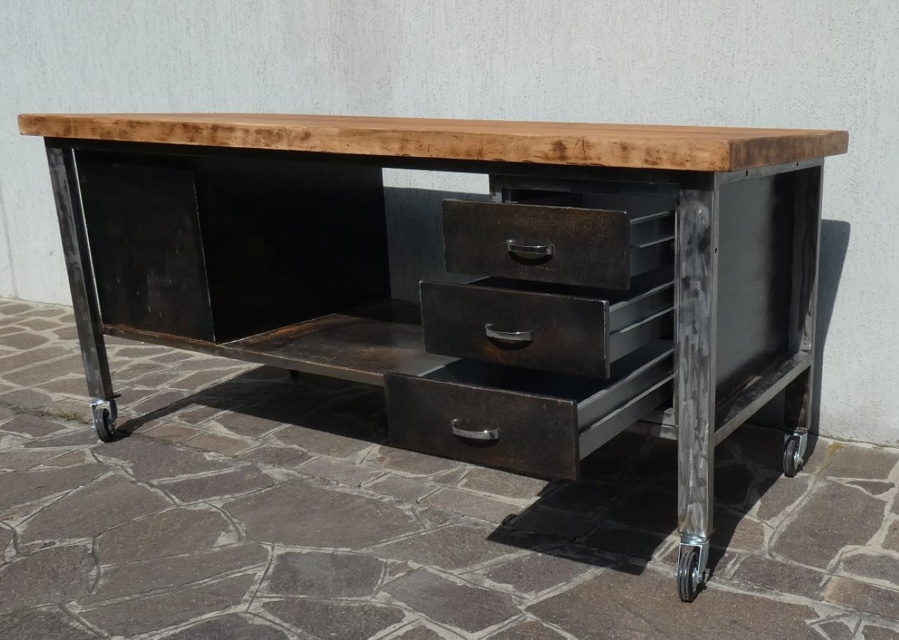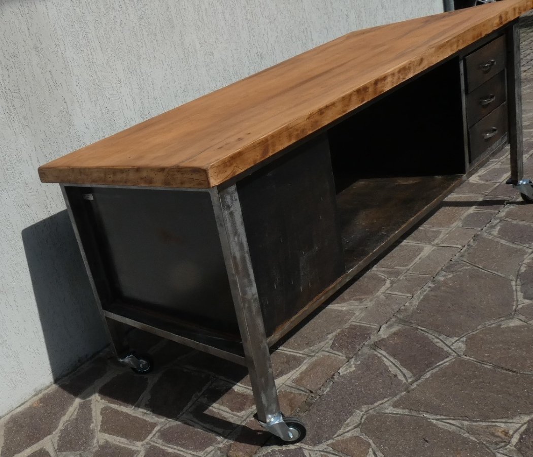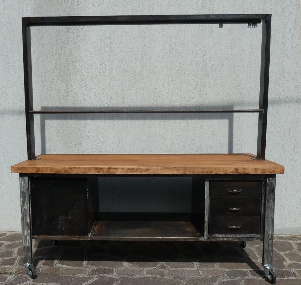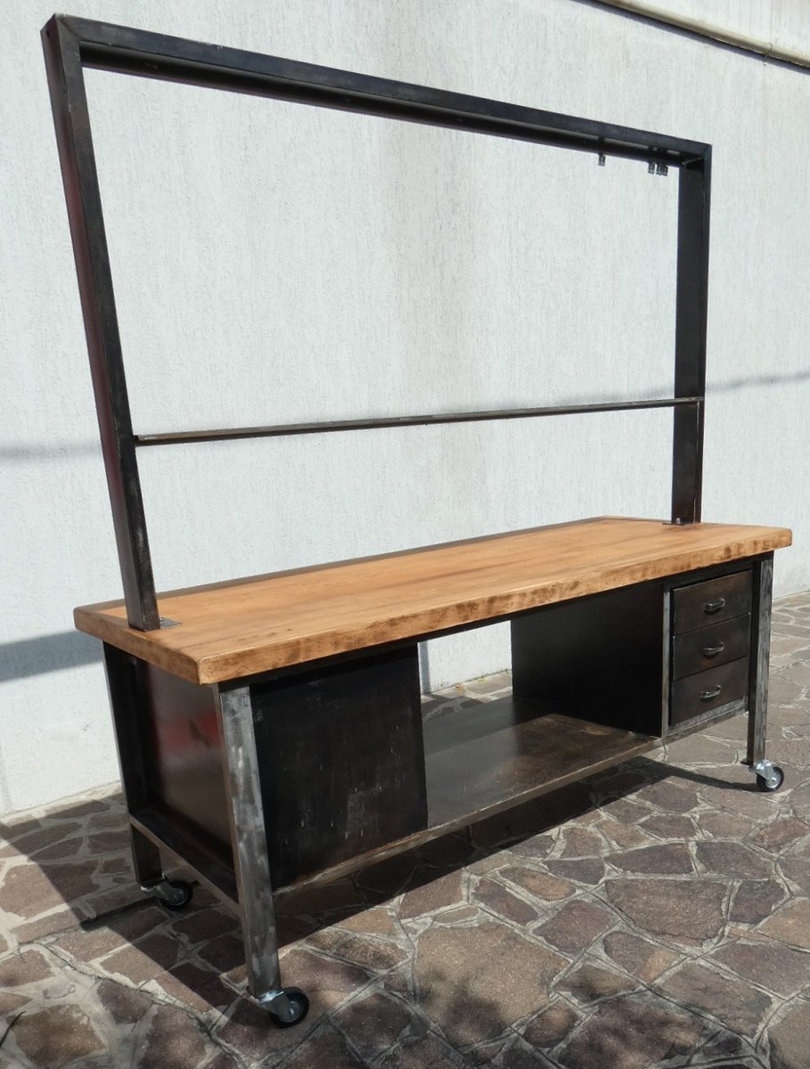 Important industrial island counter, completely restored, with rusty finish and solid blond walnut top. Officina di Ricerca signed the restoration work for this recovery of an industrial work counter, the structure of which was sandblasted and subsequently acid-etched, to obtain a natural rust finish on the iron parts, as well as on the fronts of the six drawers. The profile frame was brushed until shiny, everything was then finished in transparent two-component, so as to permanently block the effect obtained. The three drawers on each front, for a total of six drawers, have original chromed steel handles. The 5 cm thick worktop, of which 2.5 cm in solid blond walnut plank, was taken from a rectory table from the middle of the last century, sanded and finished in black wax which extrapolated its natural grain . The upper bridge with wooden finish shelf support is crossed in the upper part by a longitudinal pulley to which it is possible to attach 8 hooks, and each one can slide along the entire length of the counter... This part was called the "overhead crane".