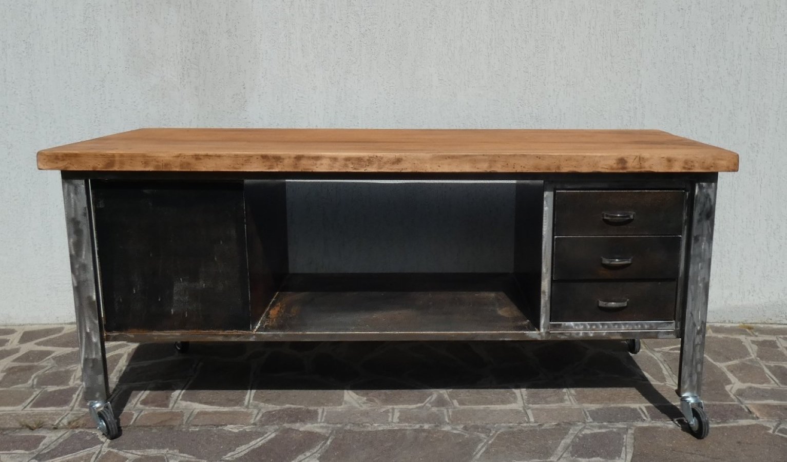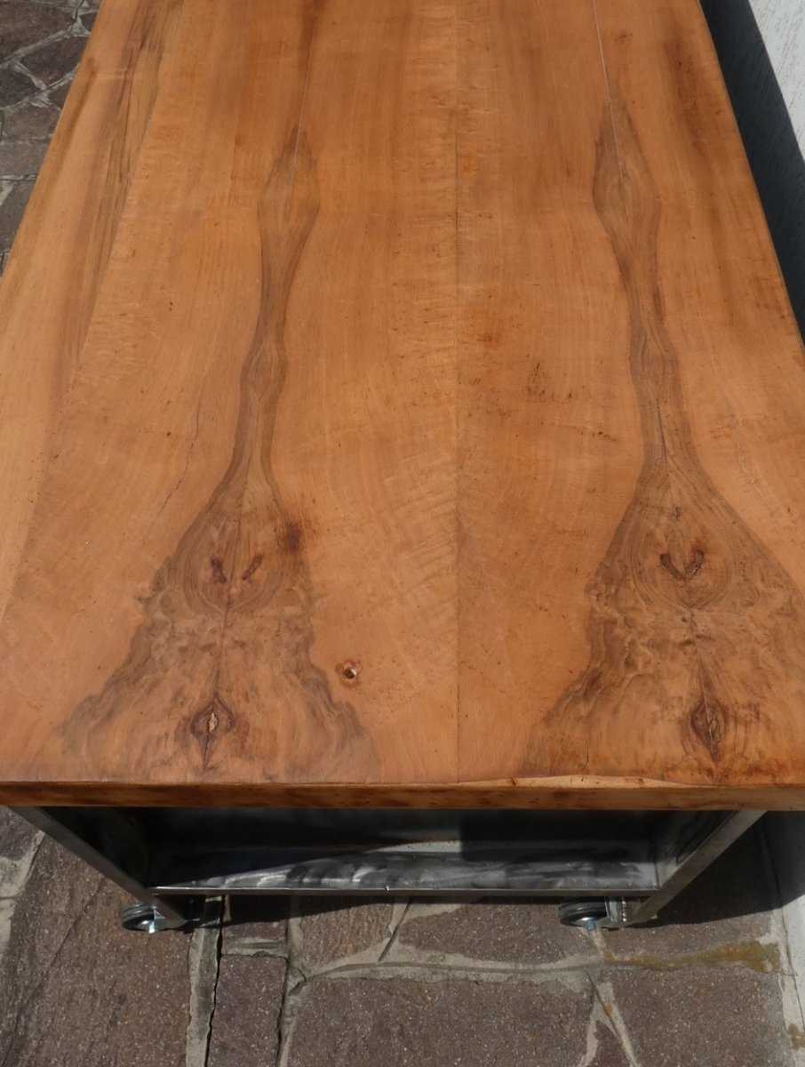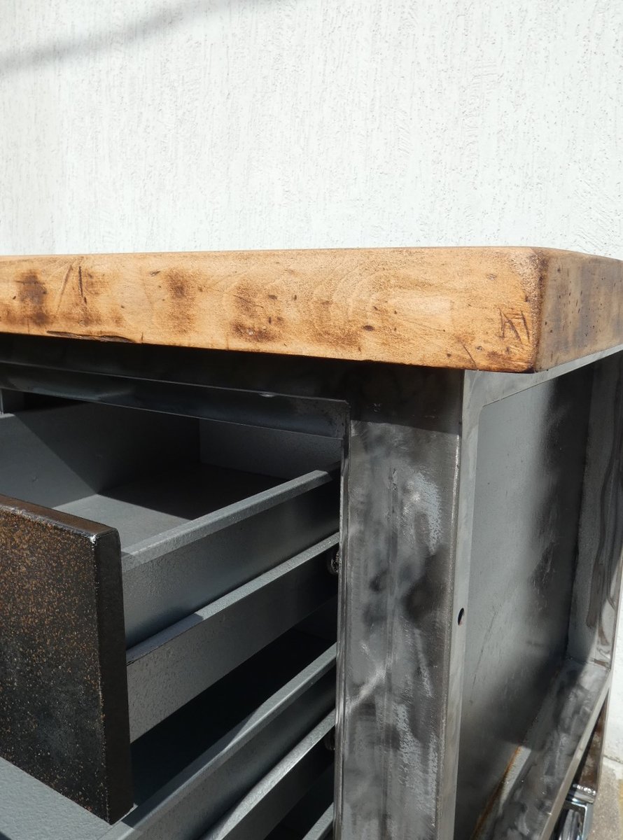 Important industrial island counter, completely restored, with rusty finish and solid blond walnut top. Officina di Ricerca signed the restoration work for this recovery of an industrial work counter, the structure of which was sandblasted and subsequently acid-etched, to obtain a natural rust finish on the iron parts, as well as on the fronts of the six drawers. The profile frame was brushed until shiny, everything was then finished in transparent two-component, so as to permanently block the effect obtained. The three drawers on each front, for a total of six drawers, have original chromed steel handles. The 5 cm thick worktop, of which 2.5 cm in solid blond walnut plank, was taken from a rectory table from the middle of the last century, sanded and finished in black wax which extrapolated its natural grain . The upper bridge with wooden finish shelf support is crossed in the upper part by a longitudinal pulley to which it is possible to attach 8 hooks, and each one can slide along the entire length of the counter... This part was called the "overhead crane".