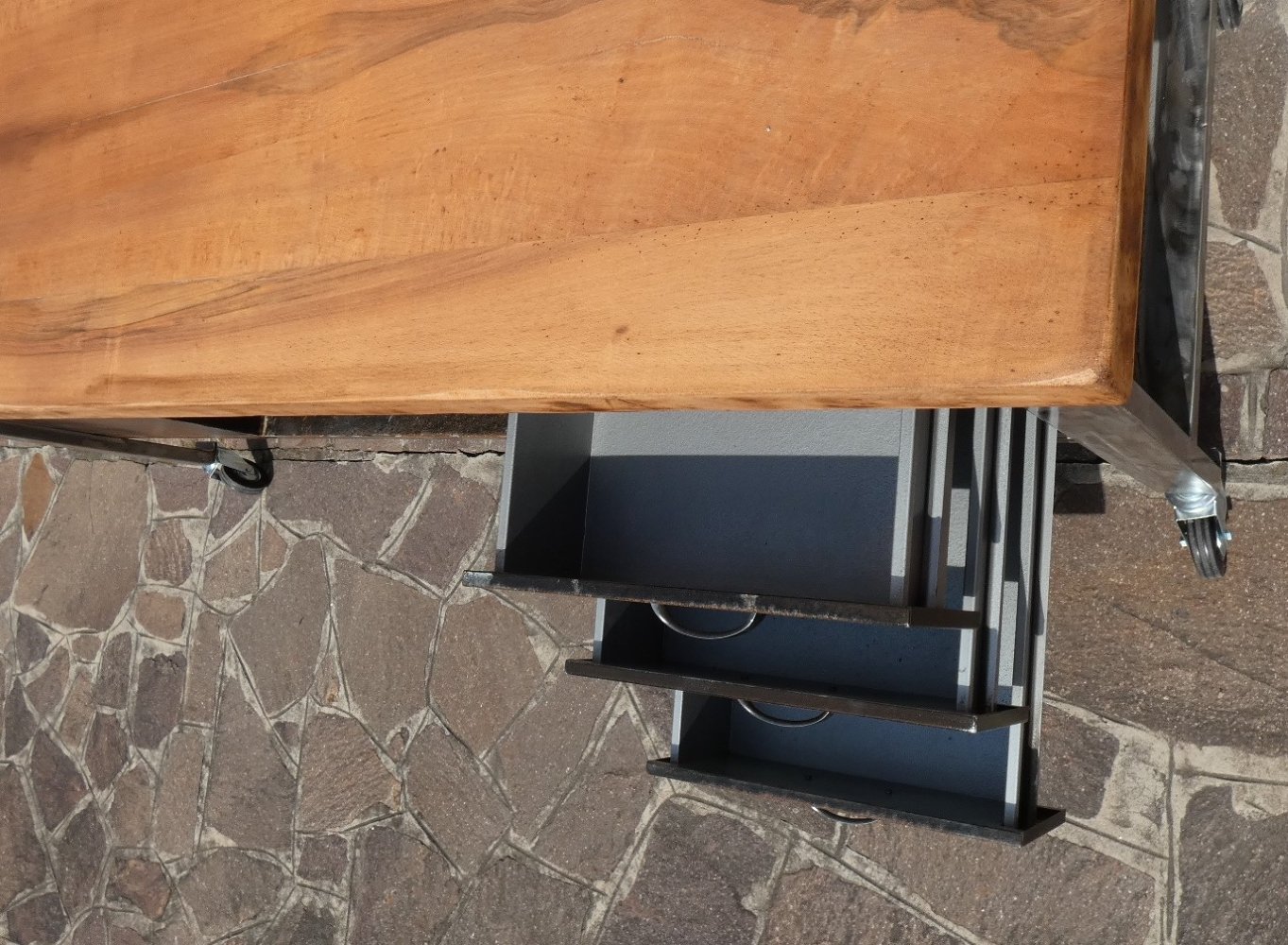 Bedeutende, vollständig restaurierte Industrie-Insel-Theke mit rostiger Oberfläche und massiver Platte aus blondem Nussbaum. Officina di Ricerca hat die Restaurierungsarbeiten für diese Wiederherstellung eines industriellen Arbeitstresens übernommen, dessen Struktur sandgestrahlt und anschließend mit Säure geätzt wurde, um eine natürliche Rostoberfläche auf den Eisenteilen sowie auf den Fronten der sechs Schubladen zu erhalten. Der Profilrahmen wurde gebürstet, bis er glänzt, dann wurde alles mit transparenter Zweikomponentenfarbe lackiert, um den erzielten Effekt dauerhaft zu verdecken. Die drei Schubladen jeder Front, also insgesamt sechs Schubladen, haben verchromte Originalgriffe aus Stahl. Die 5 cm dicke Arbeitsplatte, davon 2,5 cm aus massivem, blondem Nussbaumholz, stammt von einem Pfarrhaustisch aus der Mitte des letzten Jahrhunderts, wurde abgeschliffen und mit schwarzem Wachs behandelt, um die natürliche Maserung hervorzuheben. Der obere Steg mit der hölzernen Regalauflage wird im oberen Teil von einer länglichen Rolle gekreuzt, an der man 8 Haken befestigen kann, die jeweils über die gesamte Länge der Theke gleiten können... Dieser Teil wurde als "Brückenkran" bezeichnet.