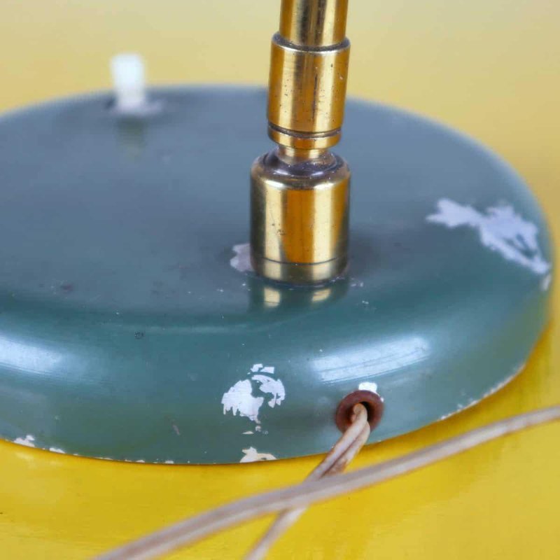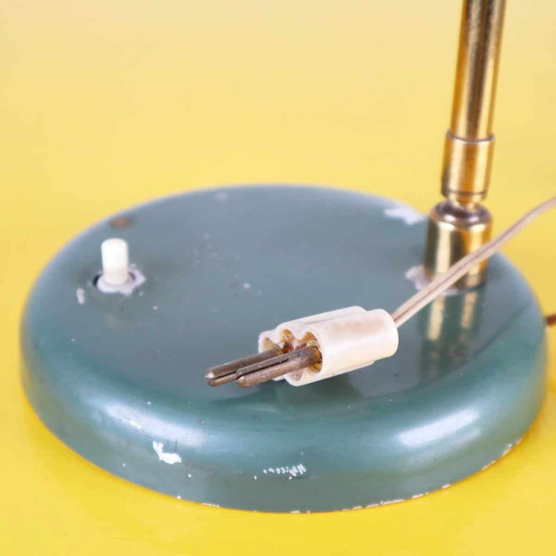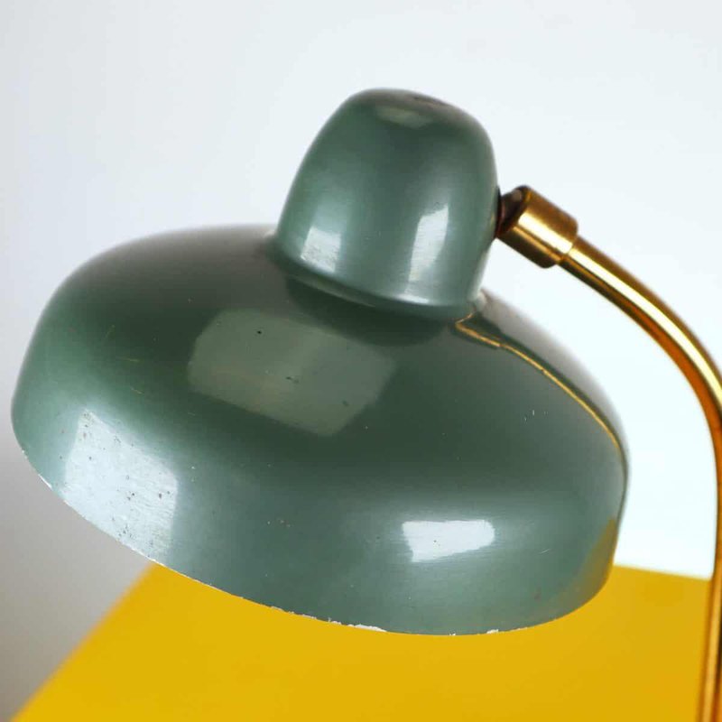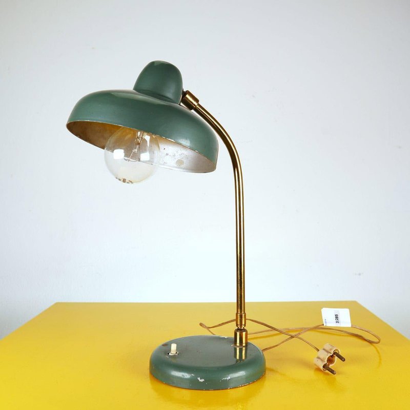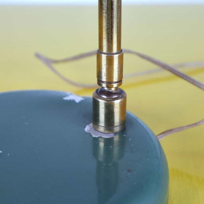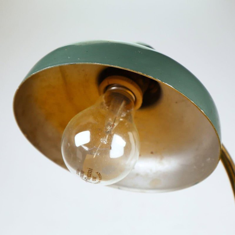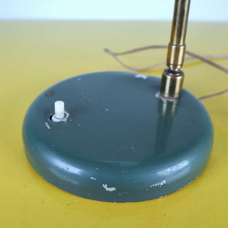 This vintage table lamp features an elegant and functional design that recalls classic industrial style. Crafted with a circular green-painted metal base and a brass arm, this lamp stands out for its bell-shaped metal shade, which creates a warm and welcoming light. with minor signs of wear, the green color offers a charming contrast when lit. Ideal for studies, desks, or as a decorative element in modern living rooms, this lamp is a perfect addition for those seeking a unique piece with character. Other Information: - has imperfections Measurements (cm): Height: 34 Diameter: 17 Other Information: Style: VINTAGE Production Period: 1960 - 1969 Design Period: 1960 - 1969 Country of Production: Italy Material: METAL Color: GREEN Weight: Standard - Between 40 kg and 80 kg Detailed Condition: Good - This vintage/antique item may show some signs of wear such as scratches and other signs of aging. Restoration and condition in detail: Patina due to age and use document.