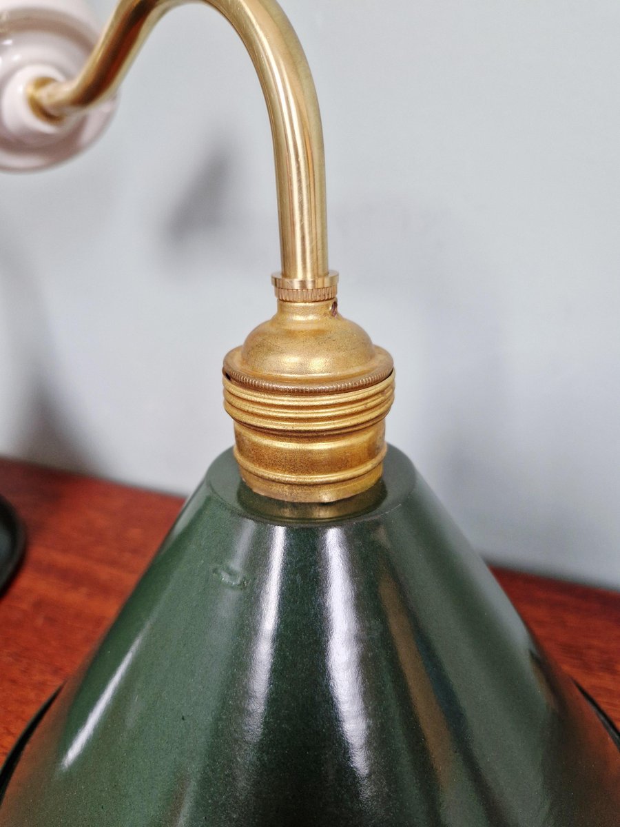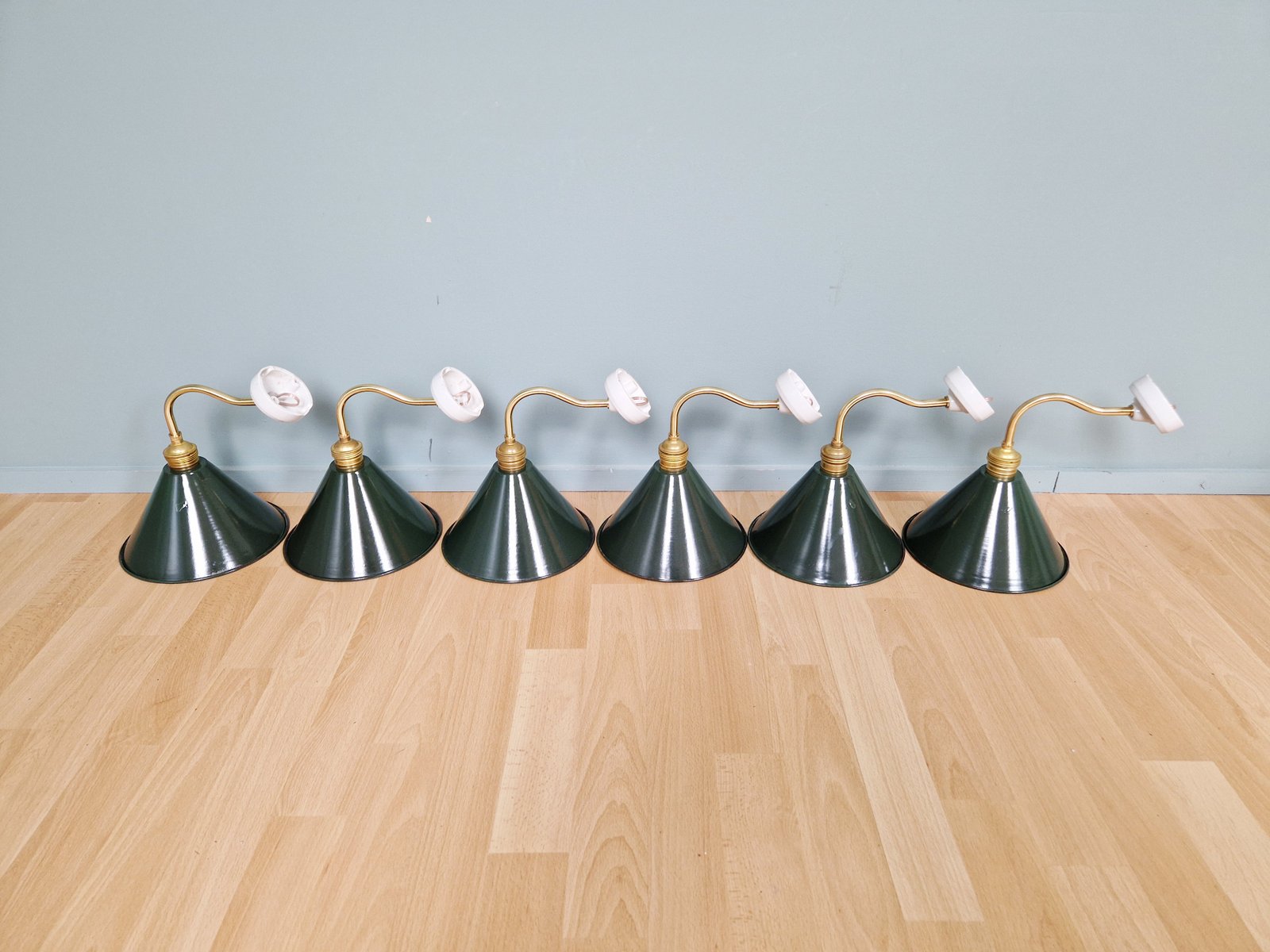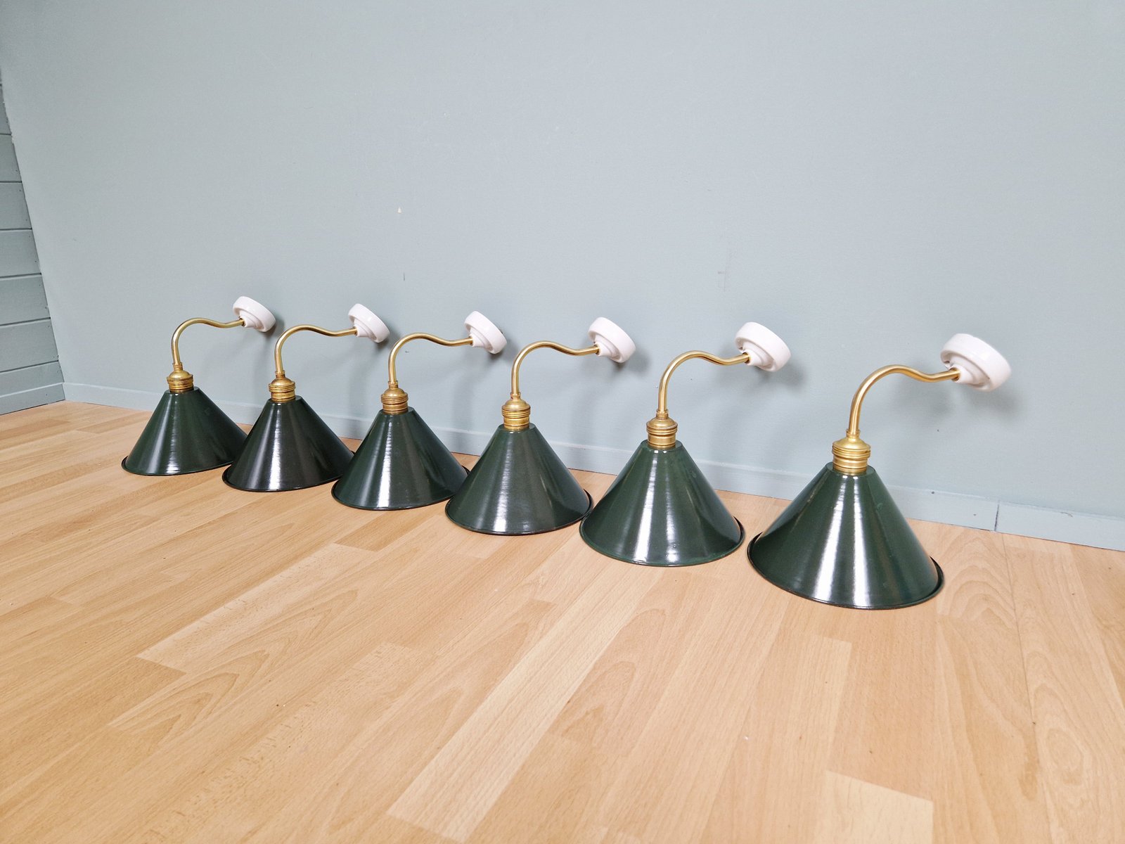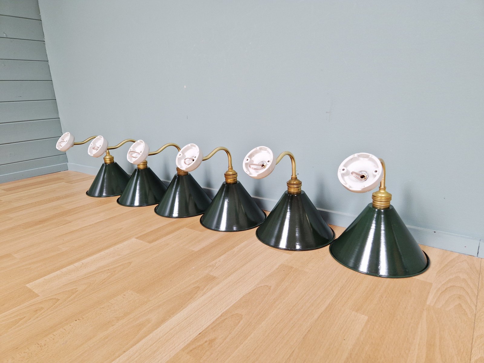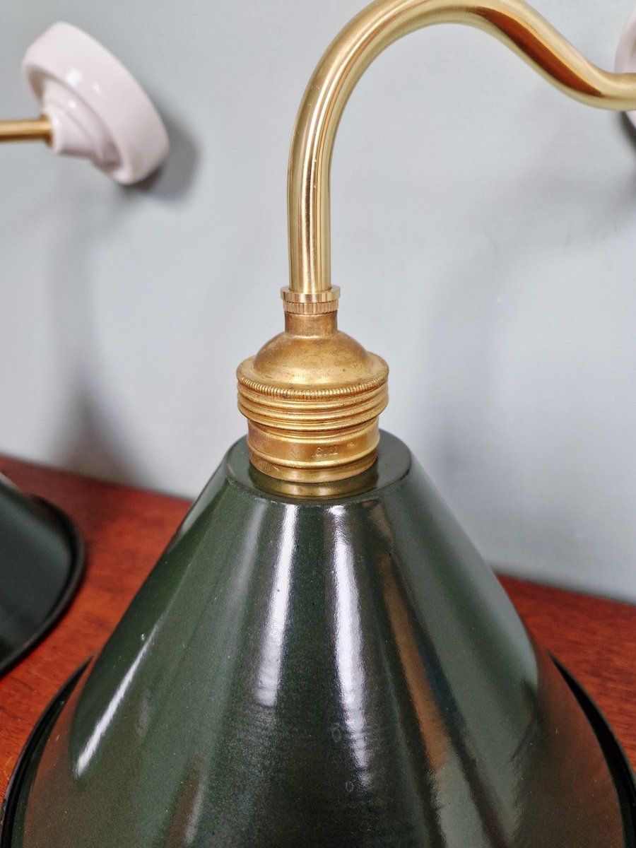 Industrielle Wandlampen aus Messing & Grün emailliertem Blech, 1950er, 6 . Set
