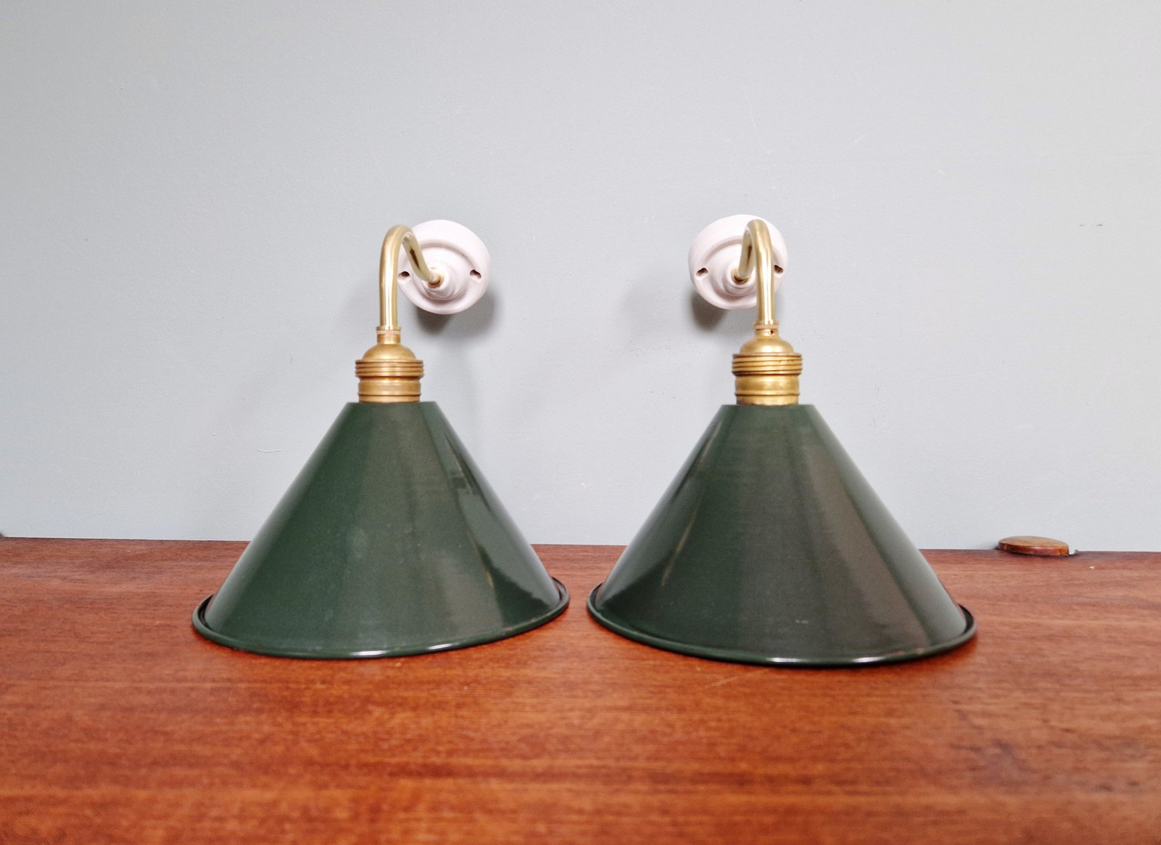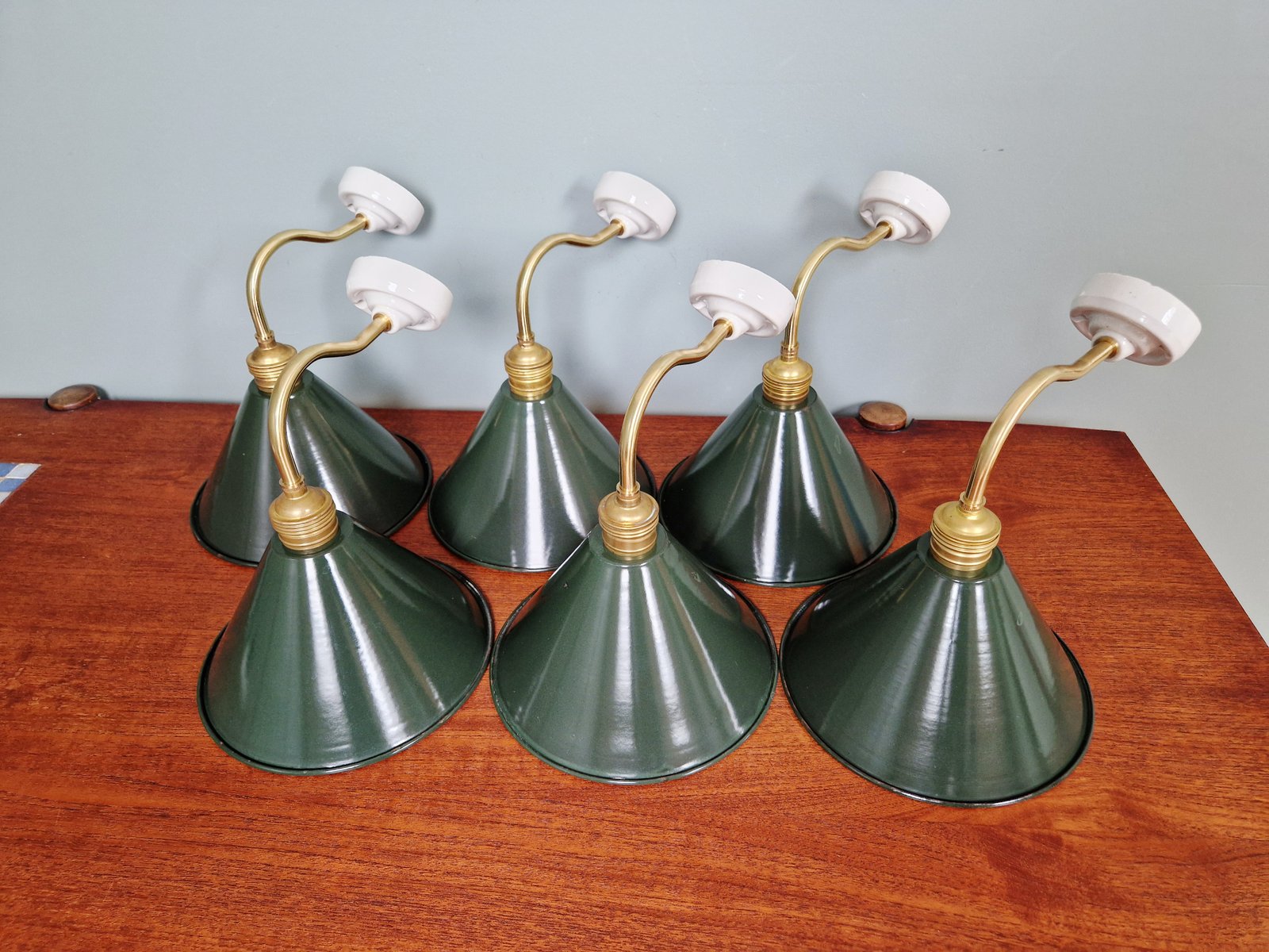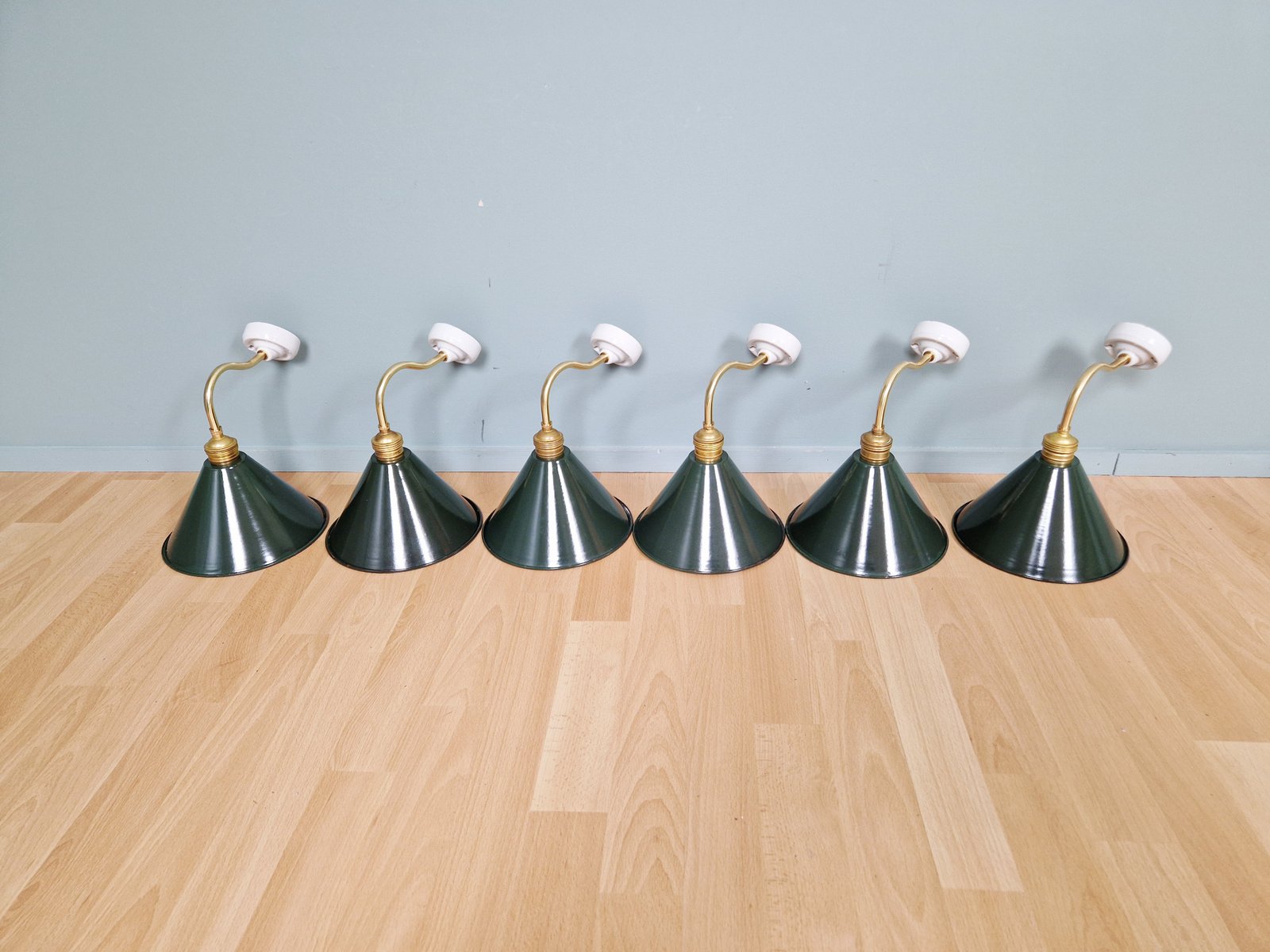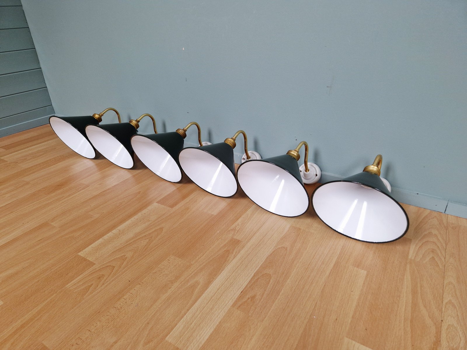 Industrielle Wandlampen aus Messing & Grün emailliertem Blech, 1950er, 6 . Set