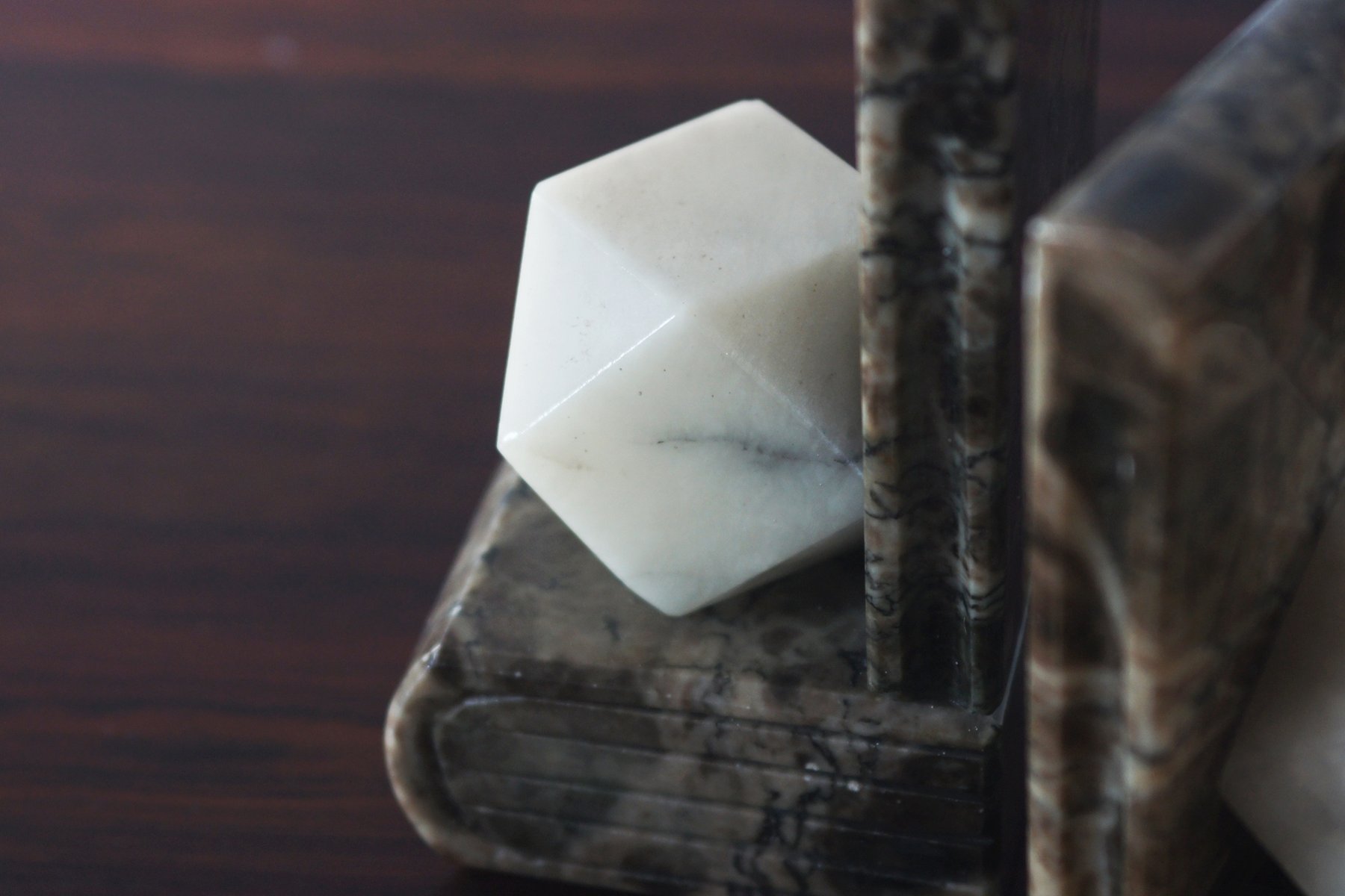 The bookends look like miniature forms of modernist architecture — austere, balanced, and elegant. They are perfect for classic, modernist, and mid-century interiors, serving as both a practical library accessory and a decorative object made of natural stone.