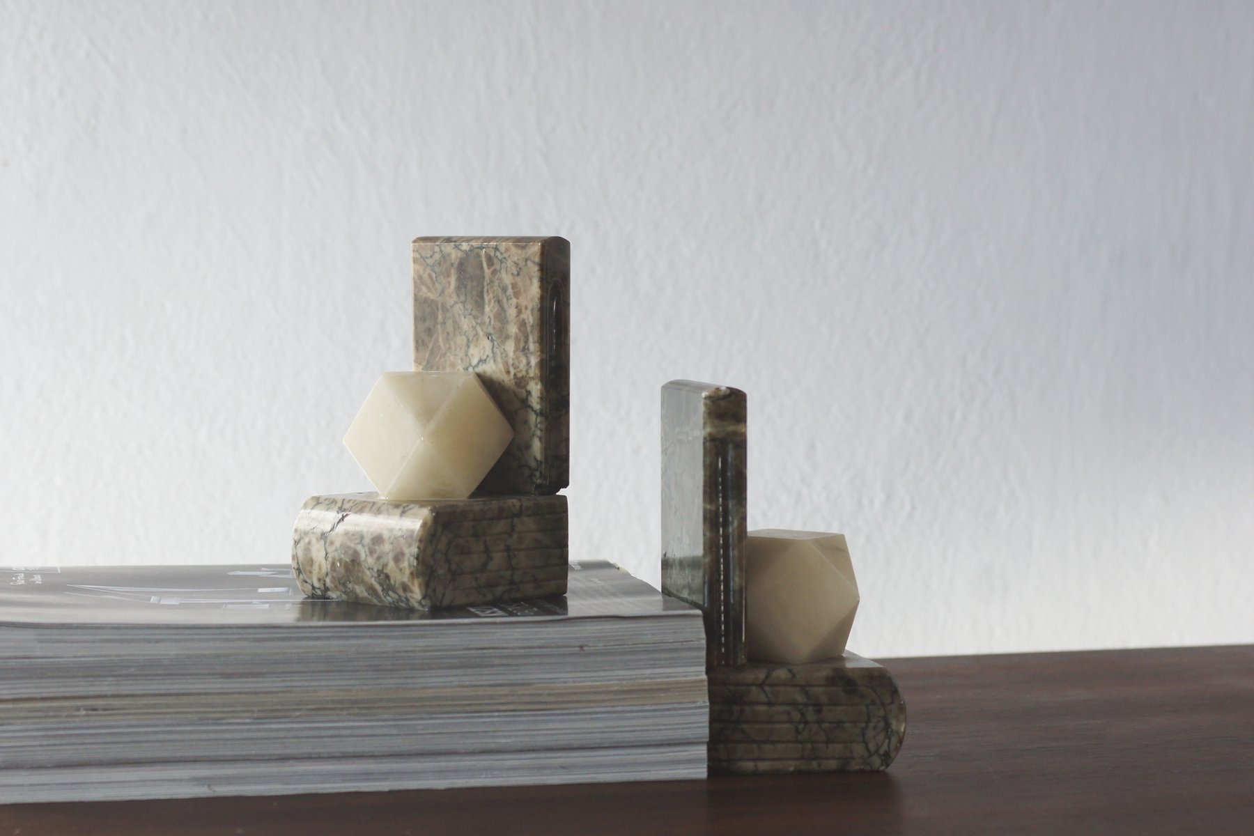 Jede Buchstütze besteht aus einem rechteckigen Sockel und einer vertikalen Platte, die das Buch stabilisiert. Die Vorderseite wird durch einen geometrischen Block aus hellem, milchig-beigem Alabaster mit fein abgeschrägten Kanten ergänzt. Dieser Kontrast zwischen dem hellen, glatten Element und dem dunkleren, reich gemaserten Stein verleiht dem Ganzen einen raffinierten, dekorativen Rhythmus.