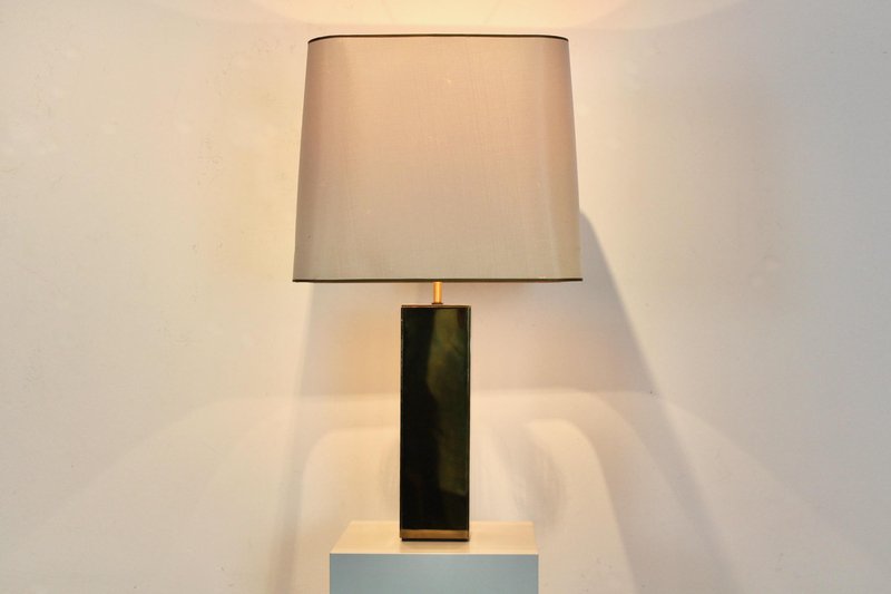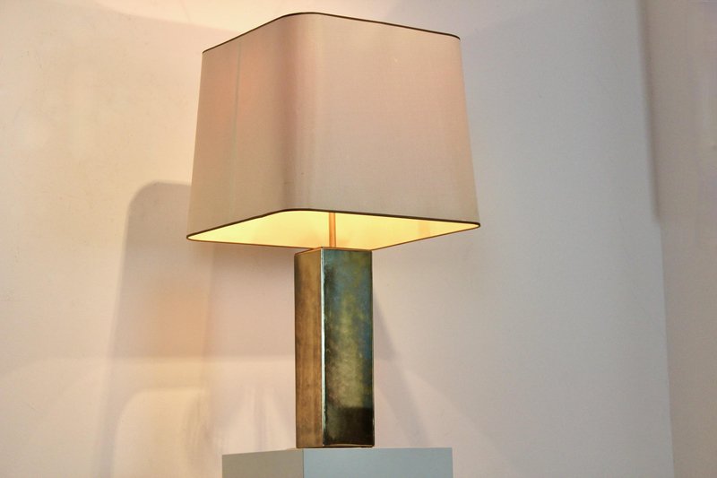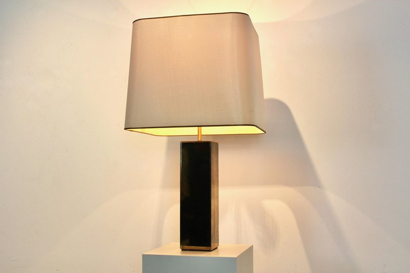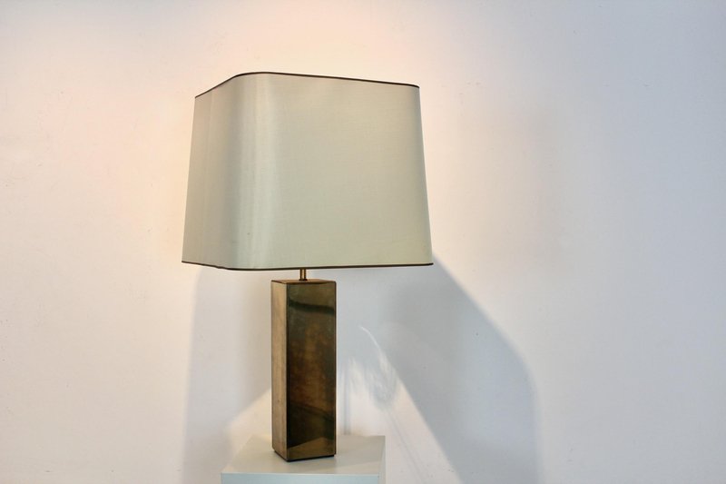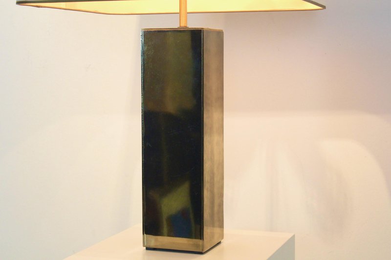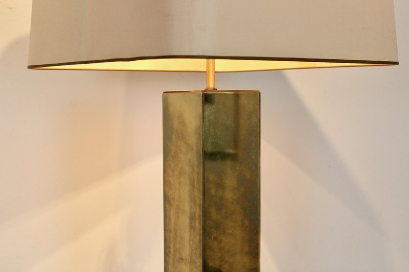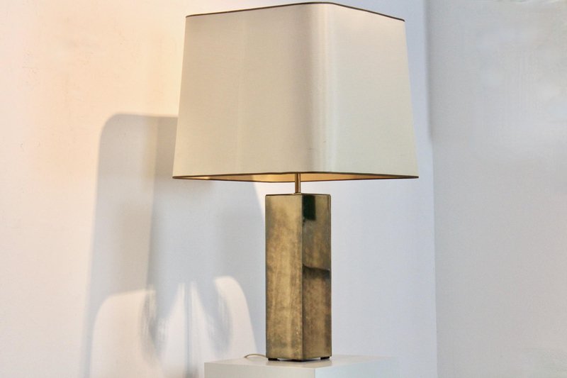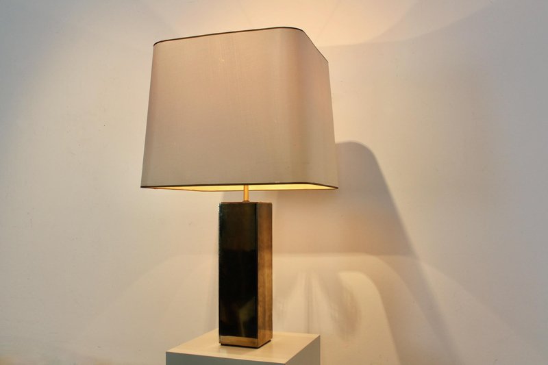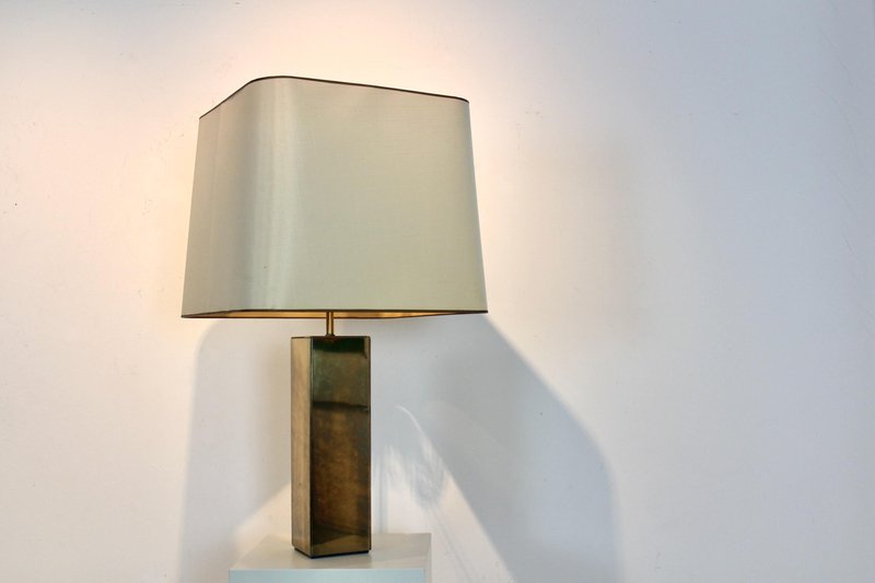 Diese raffinierte italienische Tischlampe im Mid-Century-Modern-Stil verkörpert die Meisterschaft dieser Epoche in Bezug auf Proportionen, Materialien und zurückhaltende Eleganz. Die Lampe wurde Mitte des 20. Jahrhunderts in Italien hergestellt und verfügt über einen auffälligen architektonischen Sockel mit einer klaren rechteckigen Form, der mit reich patiniertem Messing verkleidet ist. Die Oberfläche hat im Laufe der Zeit eine warme, nuancierte Patina entwickelt, die ihr Tiefe und Charakter verleiht und gleichzeitig ihre klaren, modernistischen Linien bewahrt. Der skulpturale Sockel wird durch einen maßgeschneiderten, sanft konisch zulaufenden Stoffschirm ergänzt, der die Geometrie abmildert und ein warmes, stimmungsvolles Licht verbreitet. Diese Balance zwischen starker Struktur und subtiler Raffinesse ist charakteristisch für das italienische Lichtdesign dieser Zeit, in der Handwerkskunst und moderne Ästhetik nahtlos miteinander verschmolzen. Die Höhe des Schirms ist zwischen 62 und 76 cm verstellbar. Elegant und dennoch zurückhaltend, eignet sich die Lampe hervorragend als Blickfang auf einer Konsole, einem Schreibtisch oder einem Beistelltisch. Ihr zeitloses Design passt sowohl zu Interieurs aus der Mitte des Jahrhunderts als auch zu modernen Räumen, die einen Hauch von authentischer Vintage-Raffinesse suchen. Ein überzeugendes Beispiel für italienische moderne Beleuchtung, das funktionale Beleuchtung mit skulpturaler Präsenz verbindet.