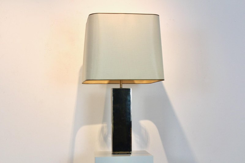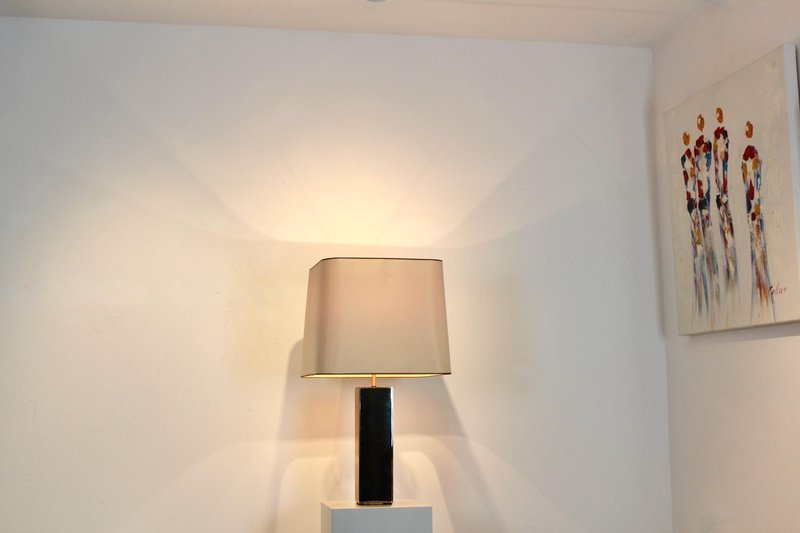 This refined Italian mid-century modern table lamp embodies the era’s mastery of proportion, material, and understated elegance. Crafted in Italy during the mid-20th century, the lamp features a striking architectural base with a clean rectangular form, clad in richly patinated brass. The surface has developed a warm, nuanced finish over time, lending depth and character while preserving its crisp modernist lines. The sculptural base is paired with a tailored, gently tapered fabric shade that softens the geometry and casts a warm, atmospheric light. This balance between strong structure and subtle refinement is characteristic of Italian lighting design of the period, where craftsmanship and modern aesthetics were seamlessly united. The height of the shade is adjustable between 62-76 cm. Elegant yet restrained, the lamp works beautifully as a statement piece on a console, desk, or side table. Its timeless design allows it to complement both mid-century interiors and contemporary spaces seeking a touch of authentic vintage sophistication. A compelling example of Italian modern lighting, combining functional illumination with sculptural presence.