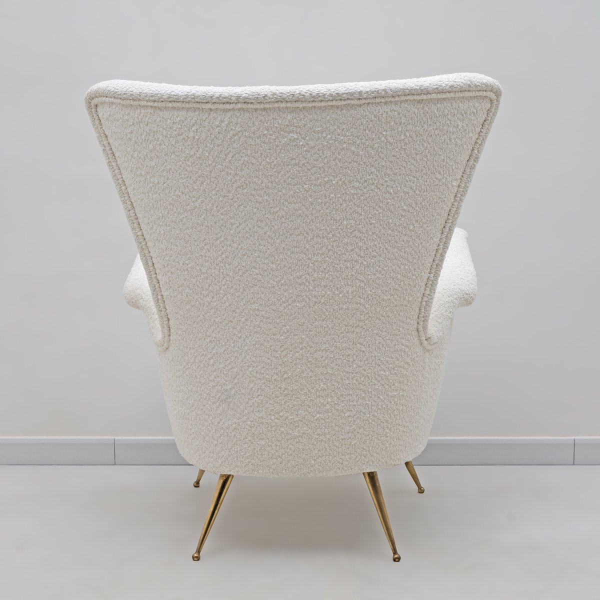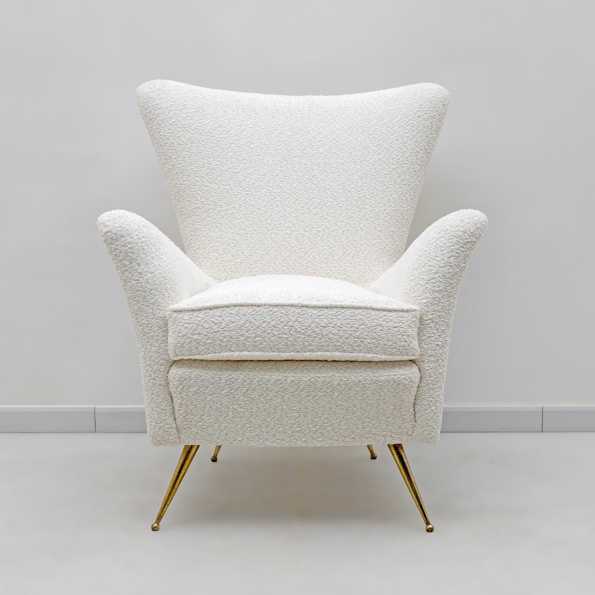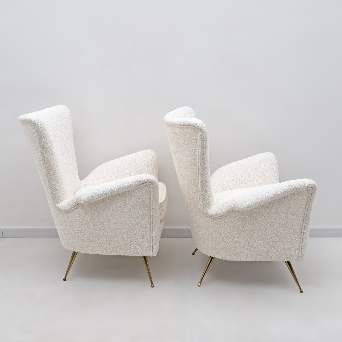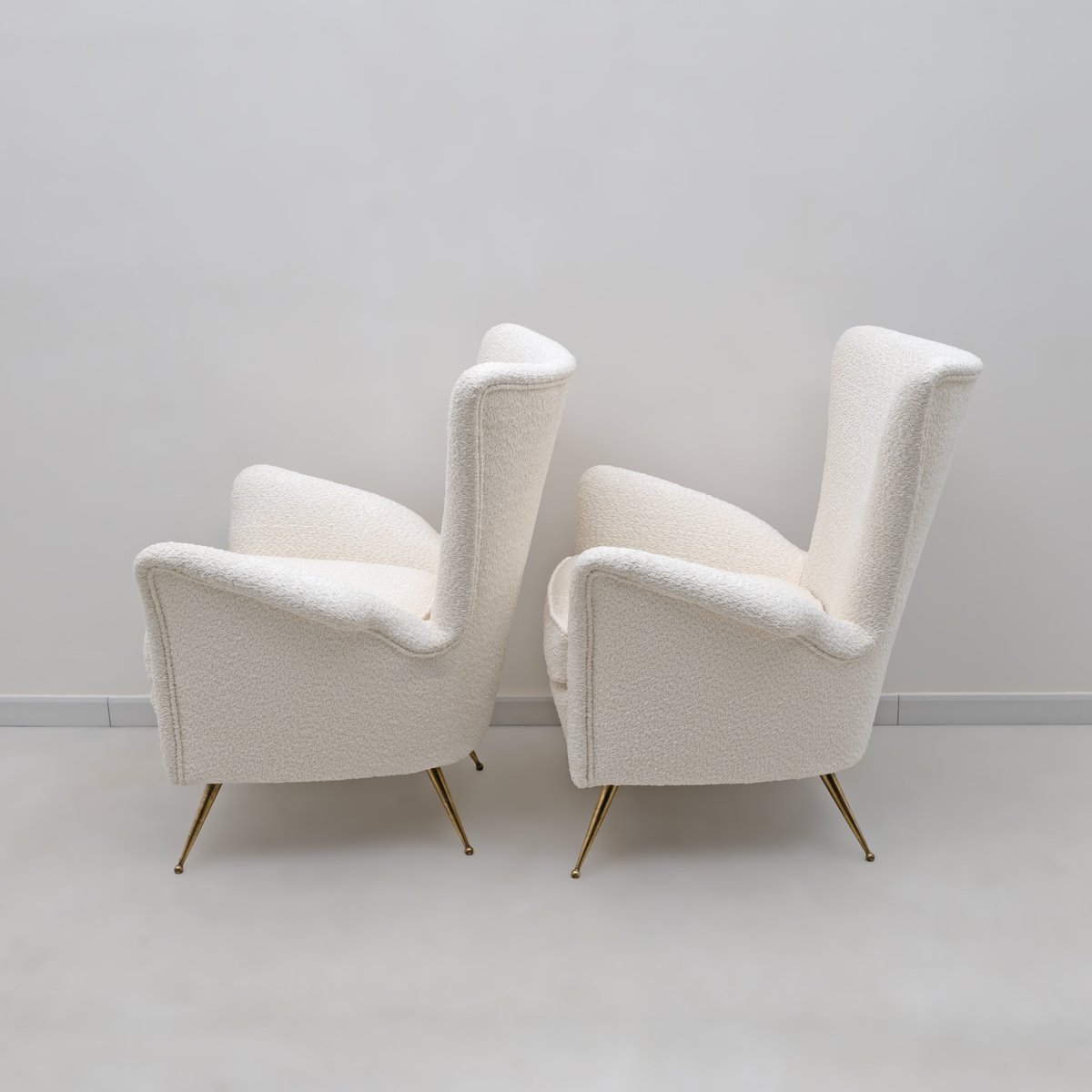 Die Sessel wurden Anfang der 1950er Jahre in Italien hergestellt und ruhen auf schlanken, sich verjüngenden Messingbeinen, die ihnen eine optische Leichtigkeit verleihen und einen raffinierten Kontrast zur Polsterung bilden. Das Paar wurde vollständig restauriert und mit cremefarbenem Bouclé-Stoff neu bezogen, der sorgfältig ausgewählt wurde, um die großzügigen Kurven und die skulpturale Präsenz des Designs zu unterstreichen.