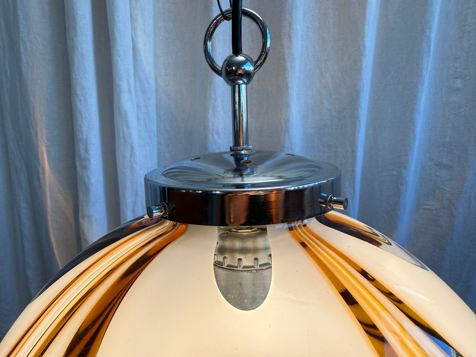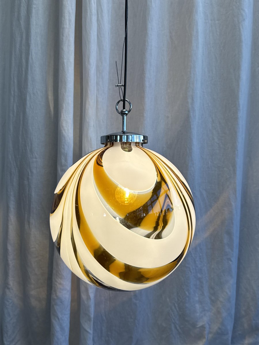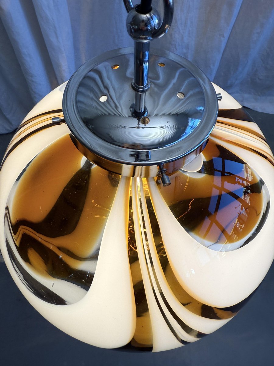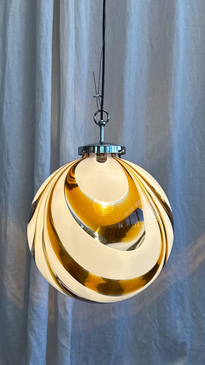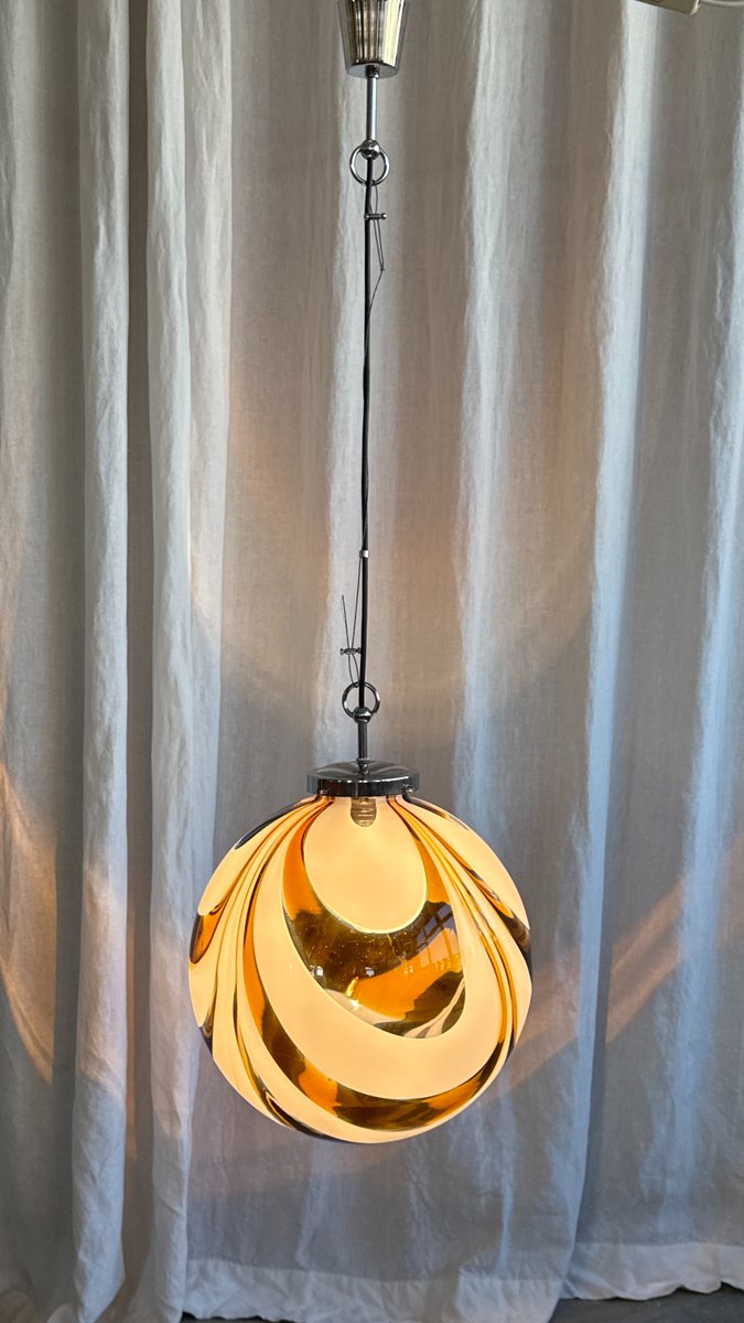 Italienische Mid-Century Hängelampe aus Muranoglas in Bernstein & Weiß mit verchromter Aufhängung, die Mazzega zugeschrieben wird, 1970er
