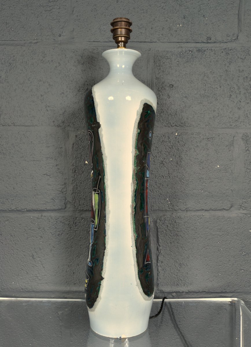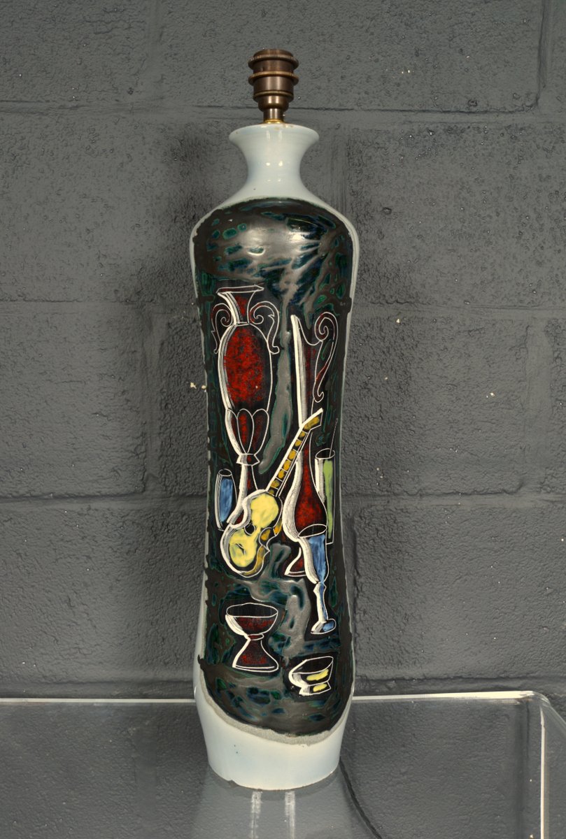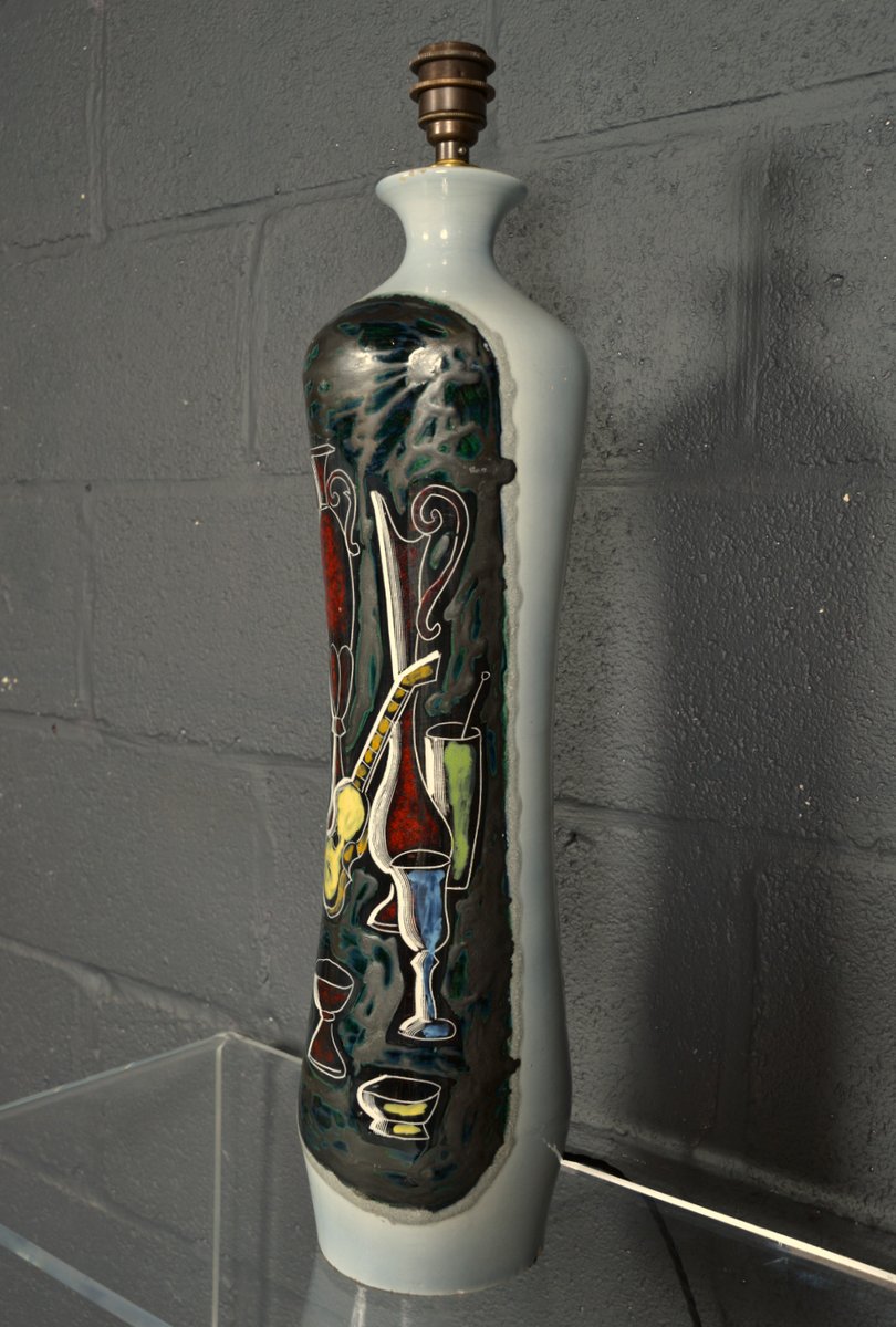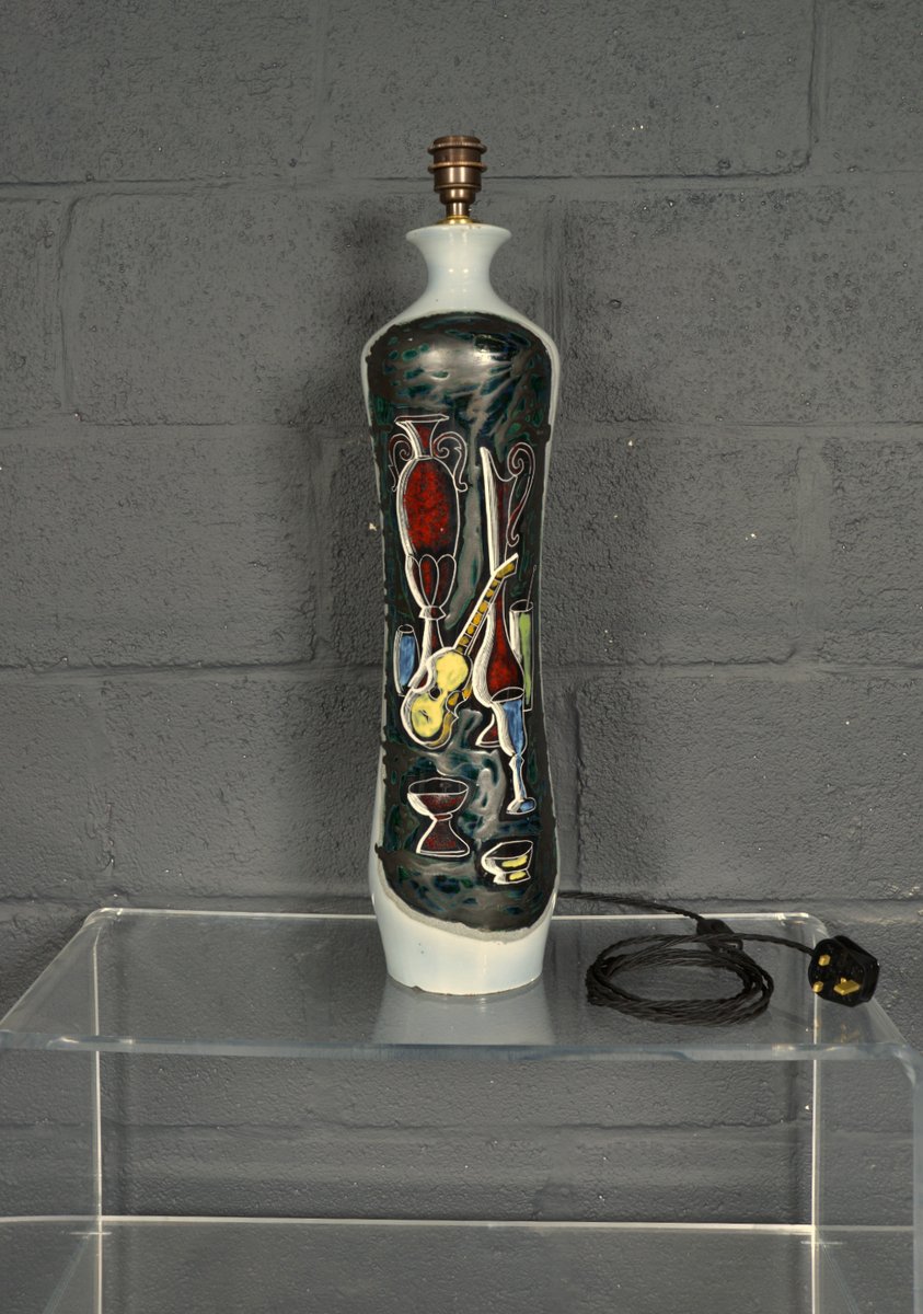 A large 1960s Italian Sgraffito Pottery Table Lamp in the style of Augusto Giulianelli, San Marino, depicting sgraffito images of a guitar, carafes and drinking vessels to one side, and an abstract design to the reverse. The pottery base colour has a whitish-blue glaze with a black iron oxide and dark green panel front and back, decorated in a cacophony of colours. There are a couple of nibbles to the top and the base (please see last images), but all-in-all do not detract from such a stunning piece. Signed to the base model '879 Italy'. Professionally rewired with black 2-core twisted cable with an inline switch and black plug. Measurements: 70cm H x 16cm Diameter, neck of lamp measures 10cm Diameter.