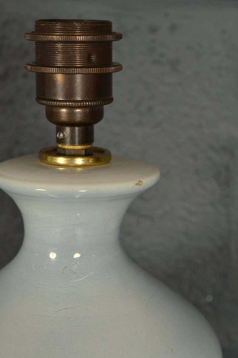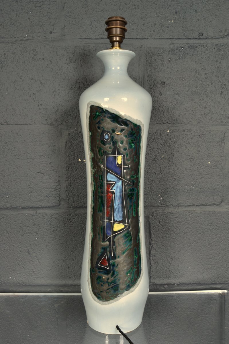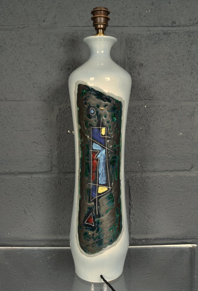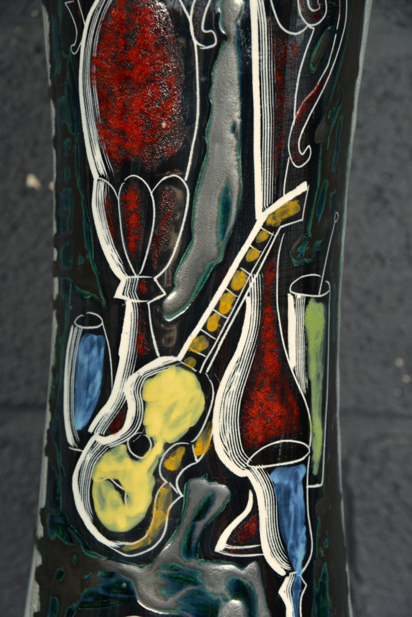 A large 1960s Italian Sgraffito Pottery Table Lamp in the style of Augusto Giulianelli, San Marino, depicting sgraffito images of a guitar, carafes and drinking vessels to one side, and an abstract design to the reverse. The pottery base colour has a whitish-blue glaze with a black iron oxide and dark green panel front and back, decorated in a cacophony of colours. There are a couple of nibbles to the top and the base (please see last images), but all-in-all do not detract from such a stunning piece. Signed to the base model '879 Italy'. Professionally rewired with black 2-core twisted cable with an inline switch and black plug. Measurements: 70cm H x 16cm Diameter, neck of lamp measures 10cm Diameter.
