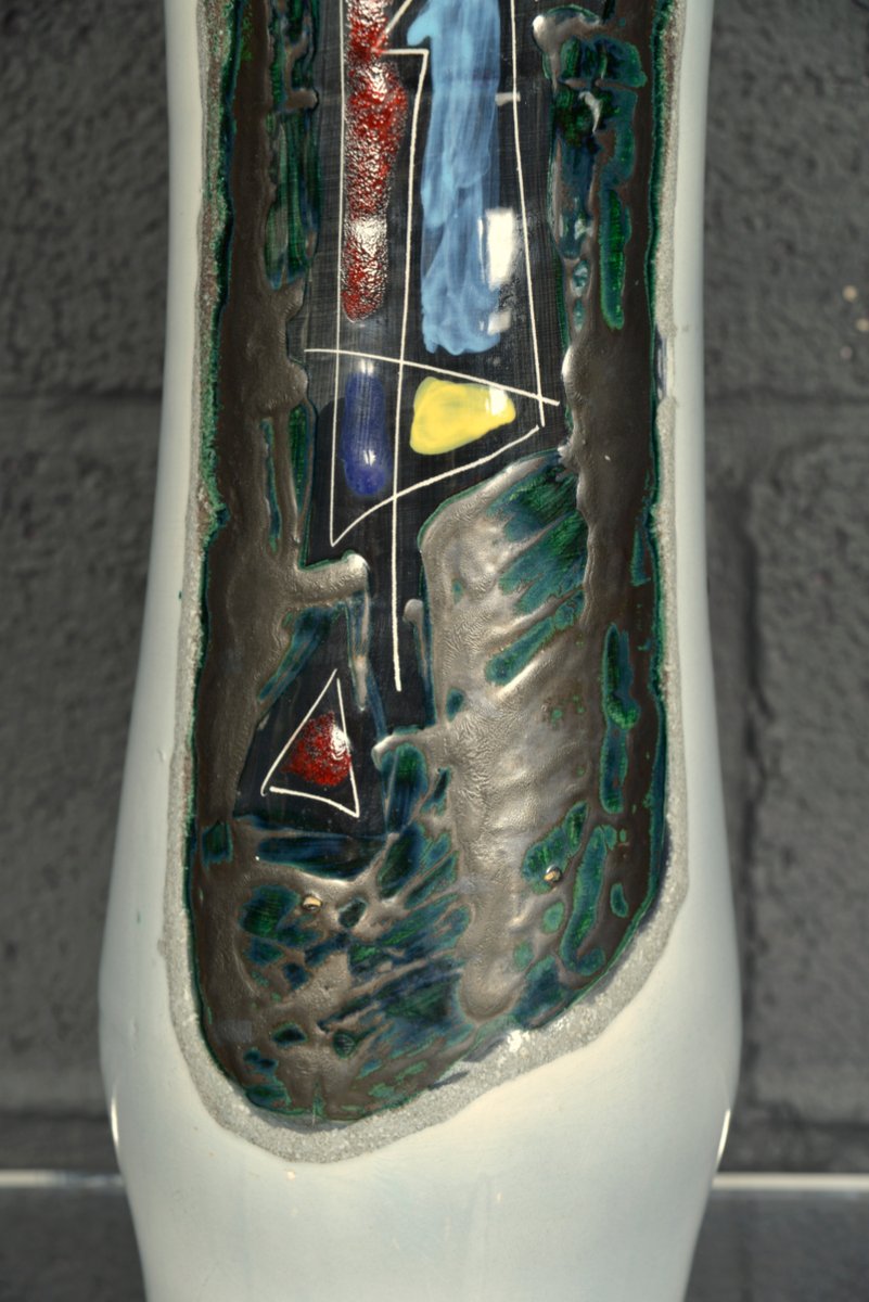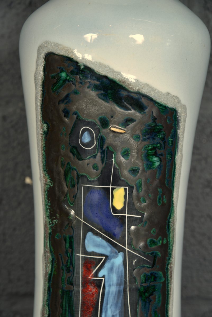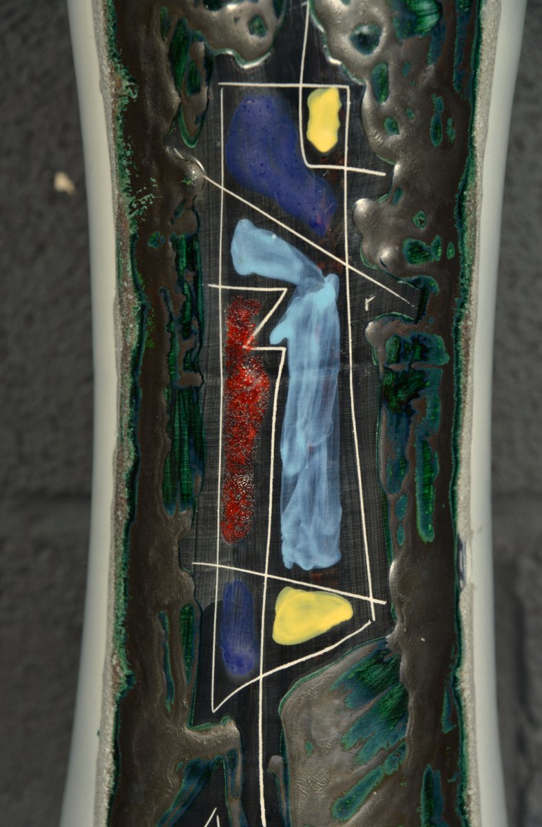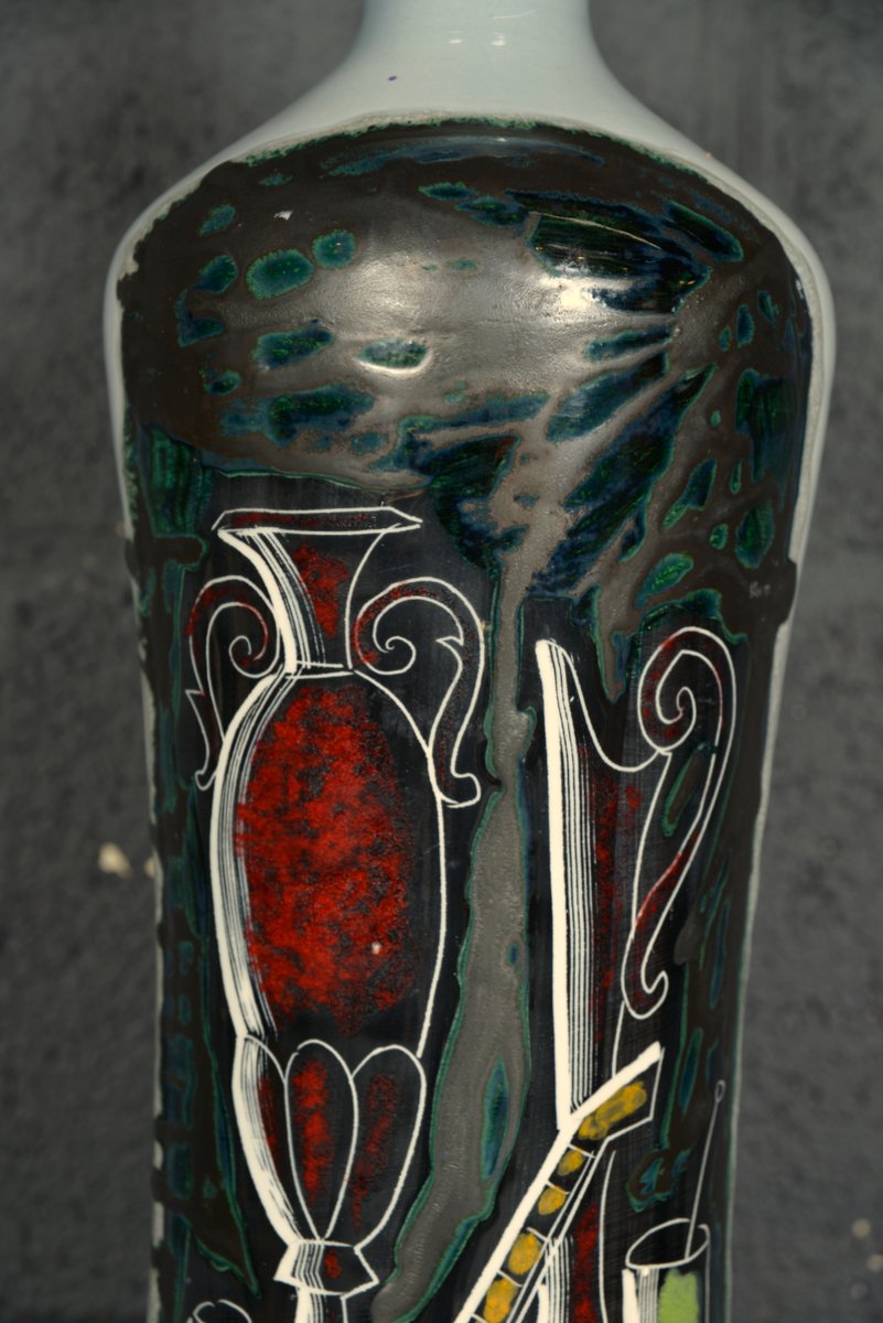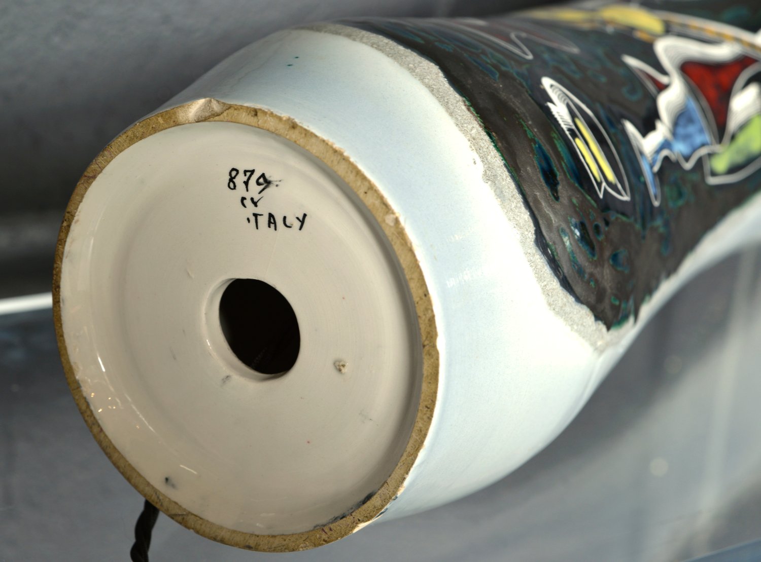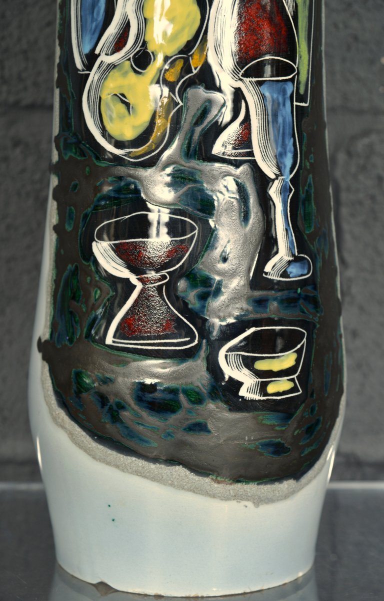 Eine große italienische Sgraffito-Keramik-Tischlampe aus den 1960er Jahren im Stil von Augusto Giulianelli, San Marino, mit Sgraffito-Darstellungen einer Gitarre, Karaffen und Trinkgefäßen auf der einen Seite und einem abstrakten Muster auf der Rückseite. Die Grundfarbe der Keramik ist eine weißblaue Glasur mit schwarzem Eisenoxid und einer dunkelgrünen Platte auf der Vorder- und Rückseite, die in einer Kakophonie von Farben verziert ist. Es gibt ein paar Nibbles auf die Oberseite und die Basis (siehe letzte Bilder), aber alles in allem nicht von einem solchen atemberaubenden Stück zu beeinträchtigen. Signiert auf dem Sockelmodell '879 Italy'. Professionell neu verkabelt mit schwarzem, 2-adrigem, verdrilltem Kabel mit einem Inline-Schalter und schwarzem Stecker. Abmessungen: 70cm H x 16cm Durchmesser, Hals der Lampe misst 10cm Durchmesser.