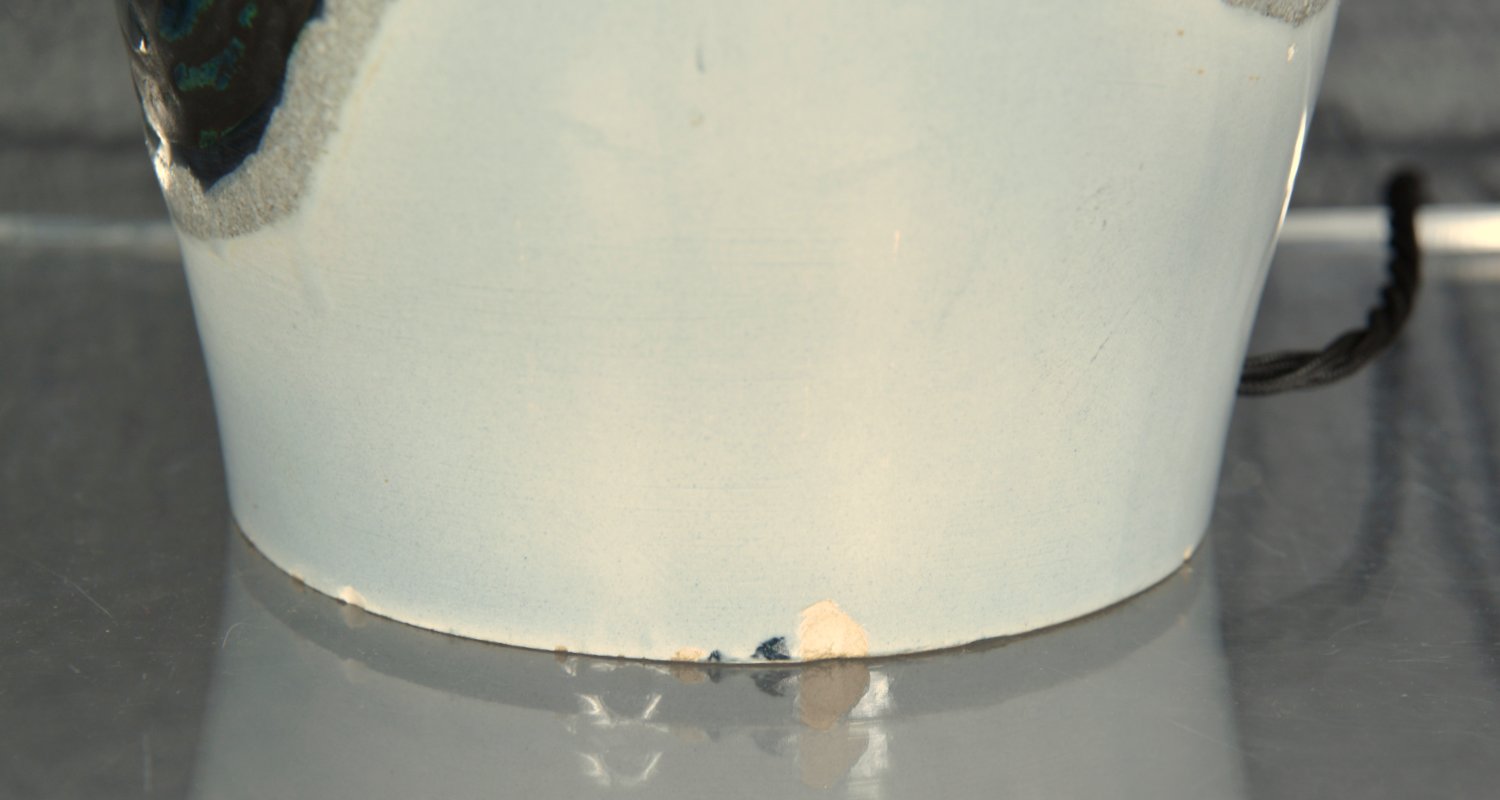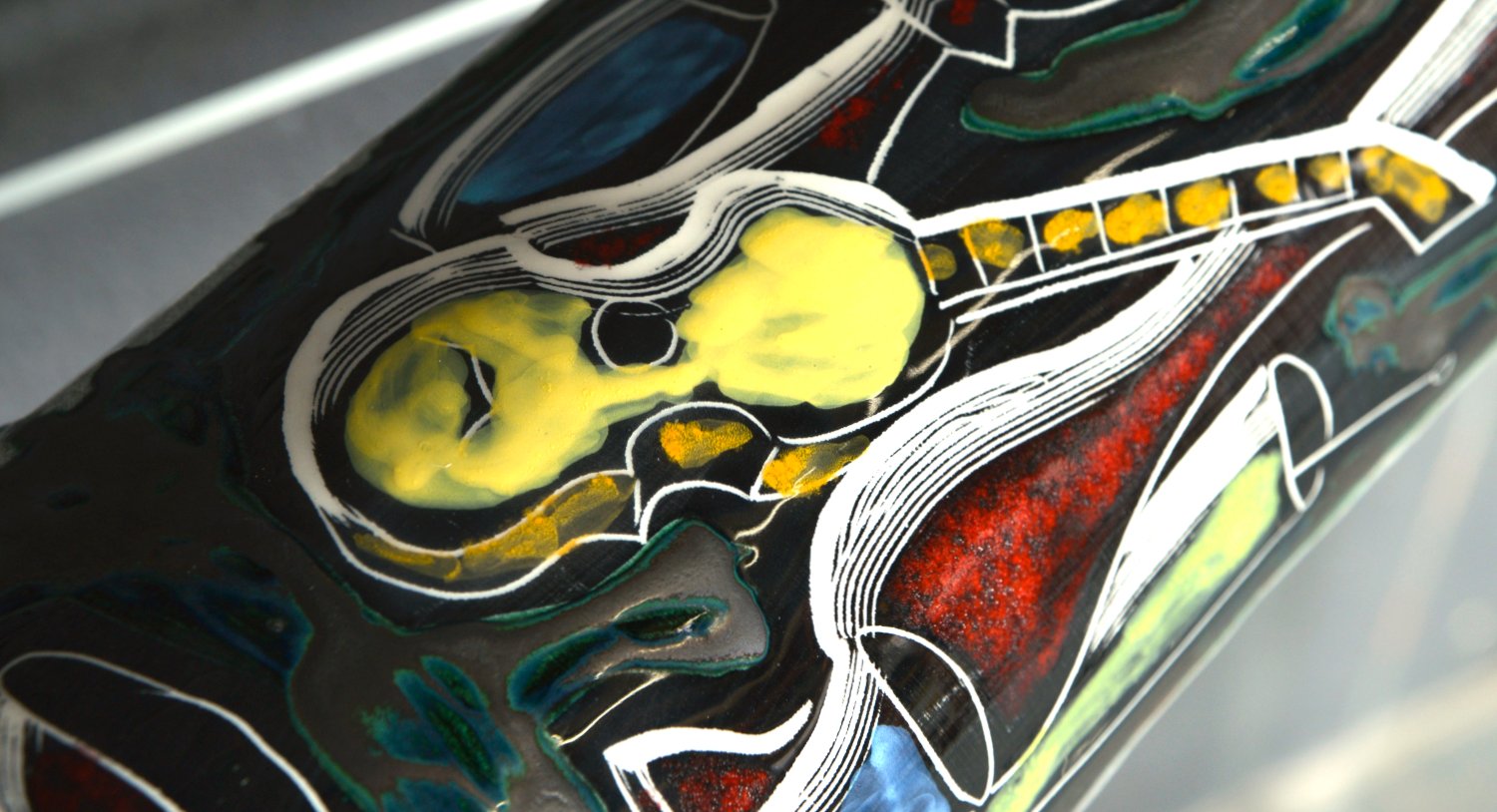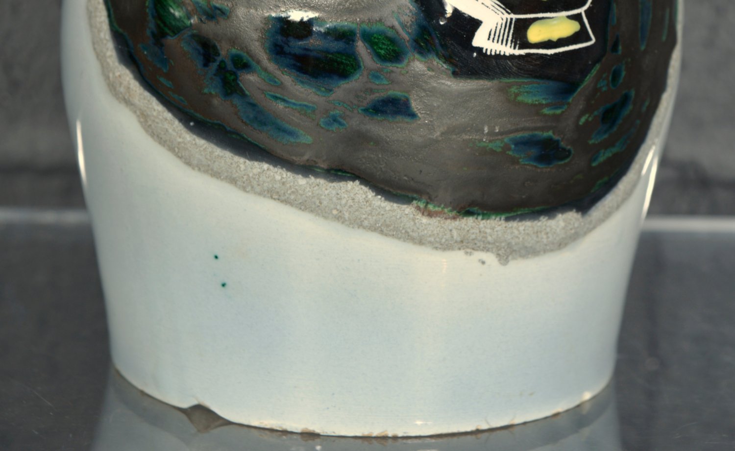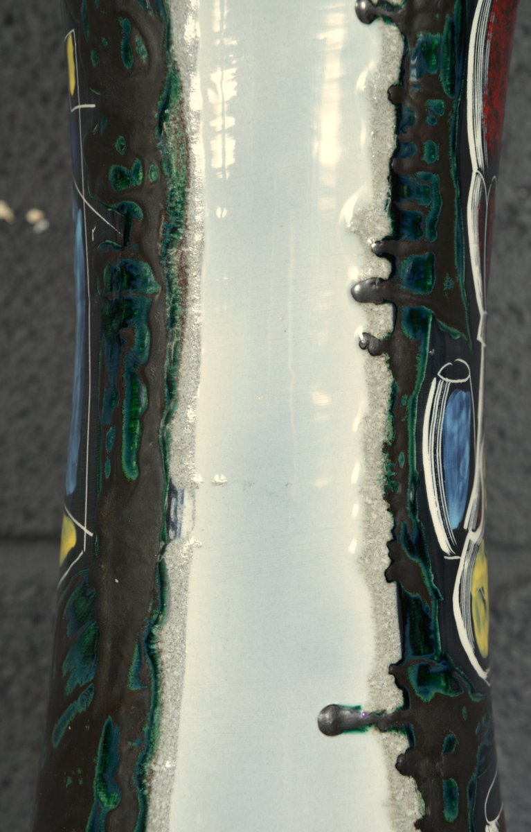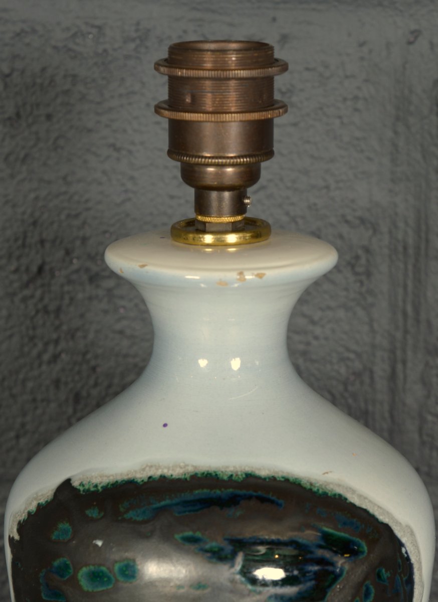 Eine große italienische Sgraffito-Keramik-Tischlampe aus den 1960er Jahren im Stil von Augusto Giulianelli, San Marino, mit Sgraffito-Darstellungen einer Gitarre, Karaffen und Trinkgefäßen auf der einen Seite und einem abstrakten Muster auf der Rückseite. Die Grundfarbe der Keramik ist eine weißblaue Glasur mit schwarzem Eisenoxid und einer dunkelgrünen Platte auf der Vorder- und Rückseite, die in einer Kakophonie von Farben verziert ist. Es gibt ein paar Nibbles auf die Oberseite und die Basis (siehe letzte Bilder), aber alles in allem nicht von einem solchen atemberaubenden Stück zu beeinträchtigen. Signiert auf dem Sockelmodell '879 Italy'. Professionell neu verkabelt mit schwarzem, 2-adrigem, verdrilltem Kabel mit einem Inline-Schalter und schwarzem Stecker. Abmessungen: 70cm H x 16cm Durchmesser, Hals der Lampe misst 10cm Durchmesser.