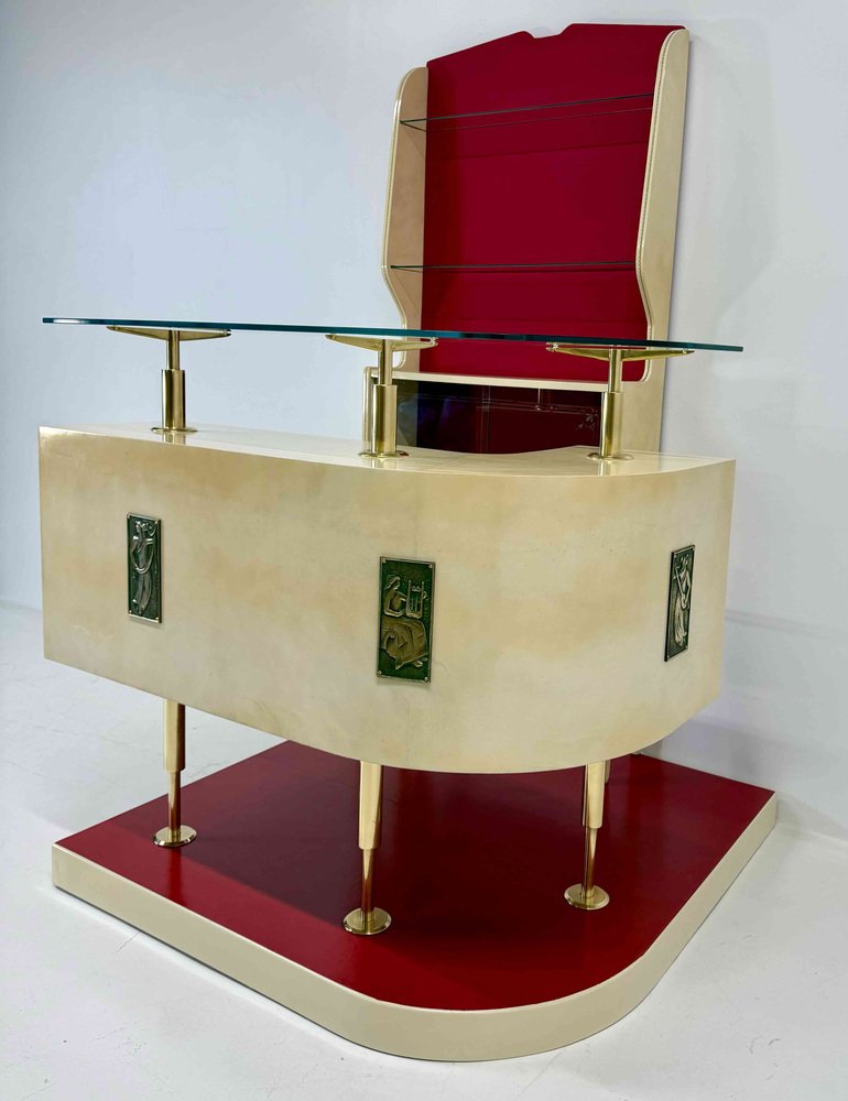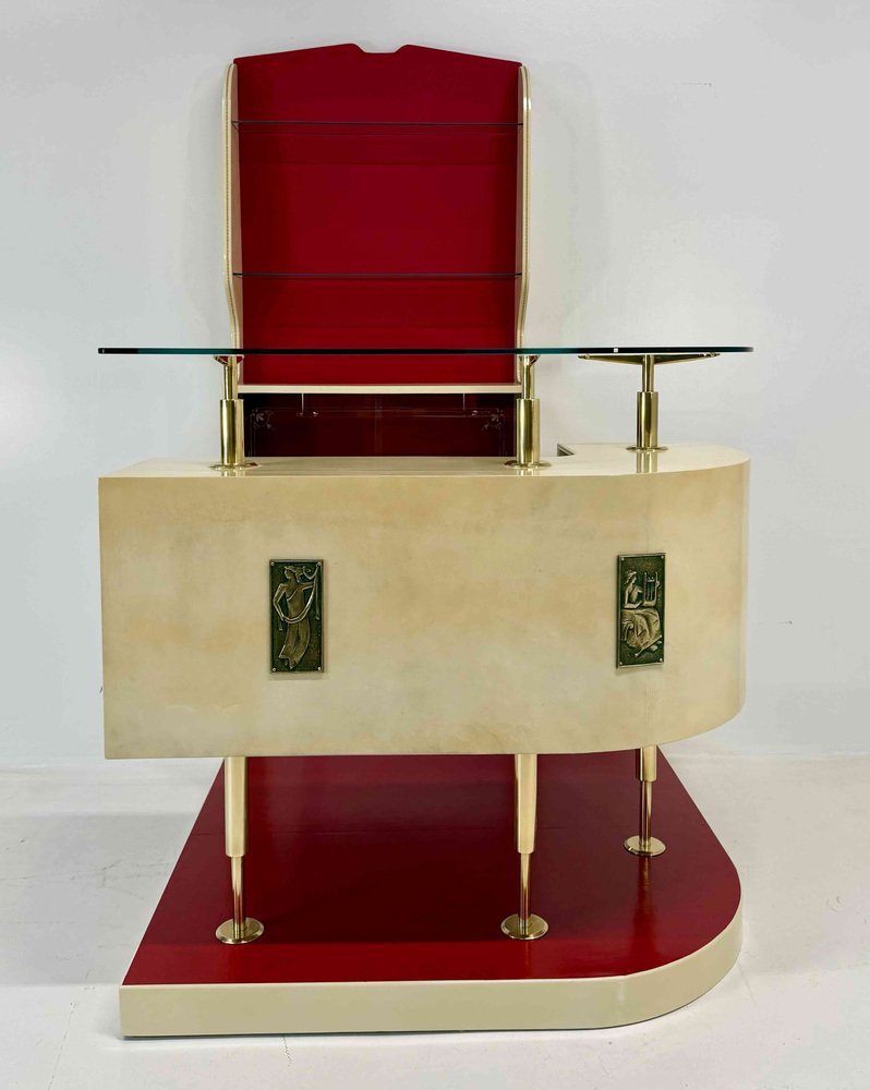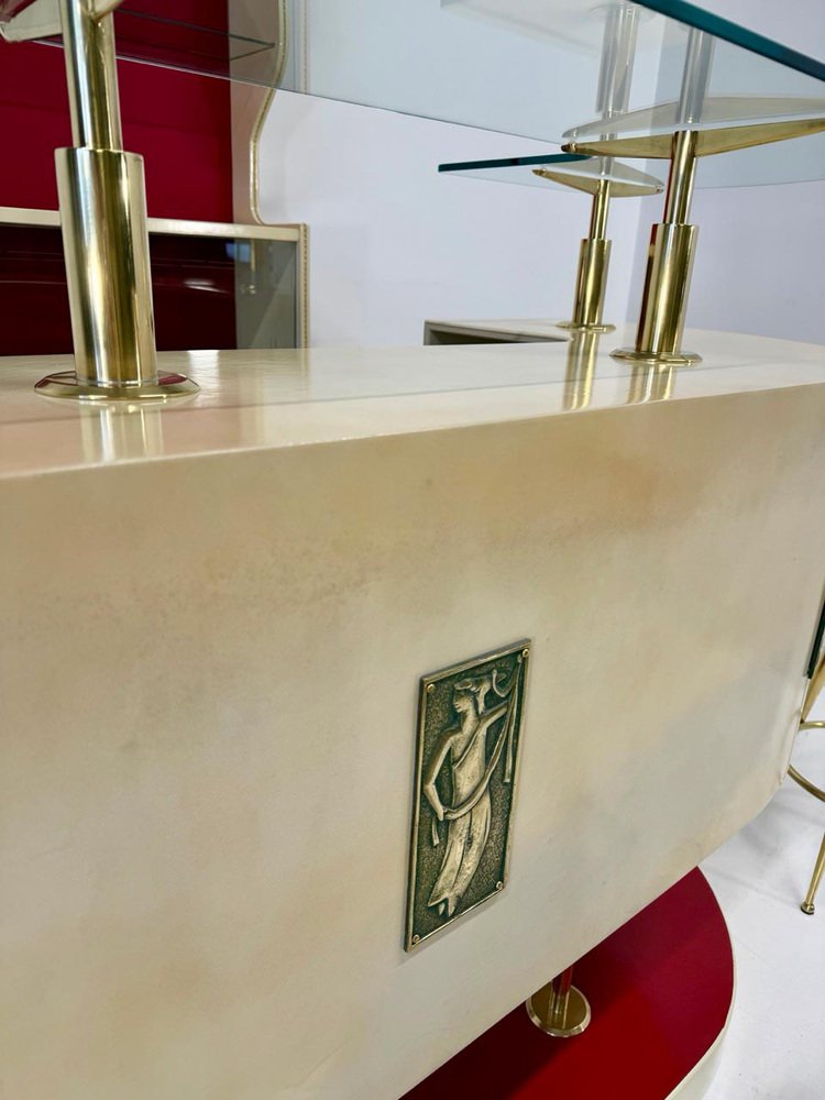 The external front of the bar is enriched with decorative bronze panels, sculptural elements that reinforce the architectural and decorative character of the piece.