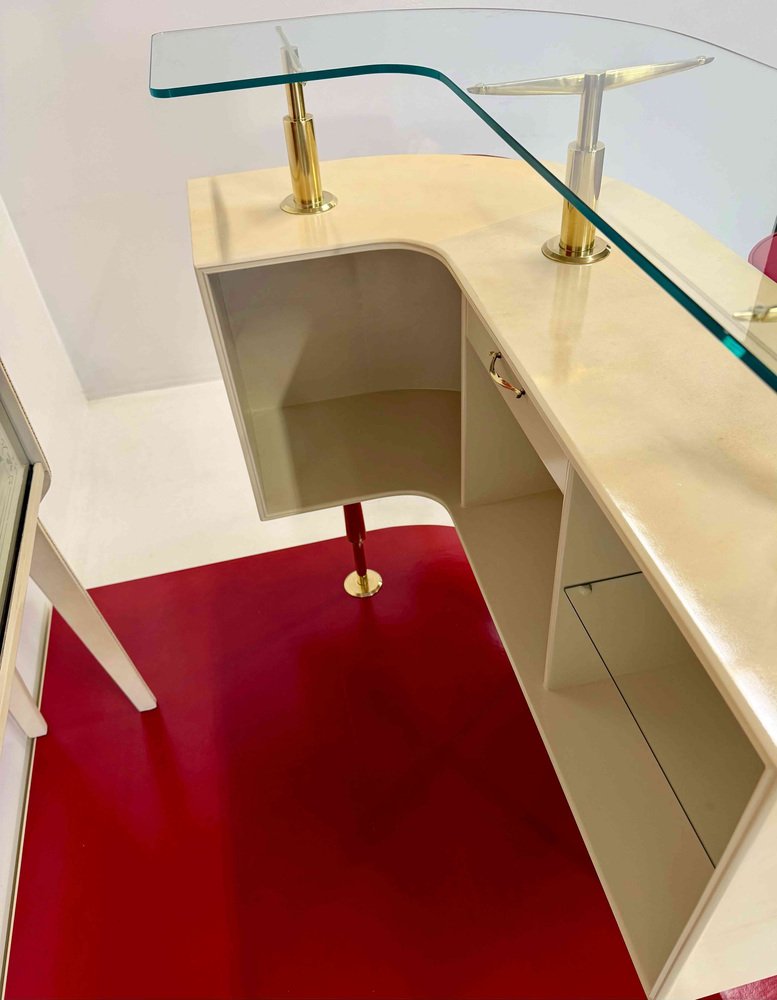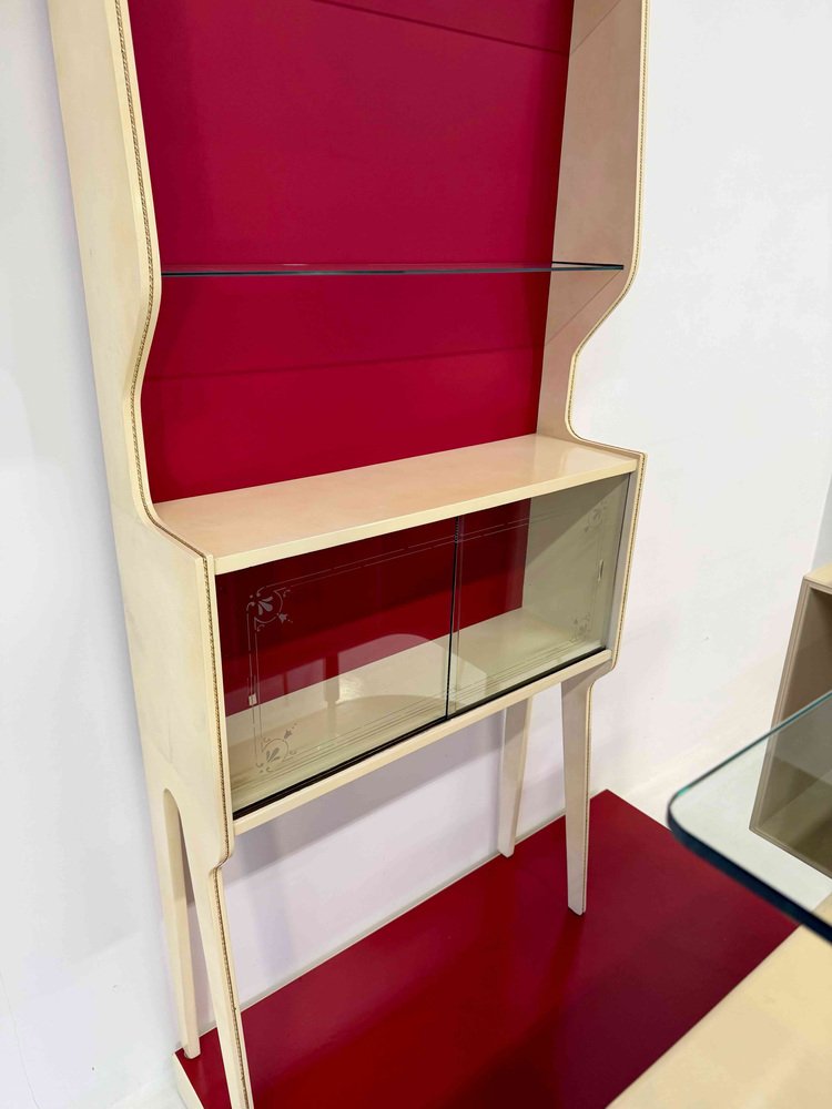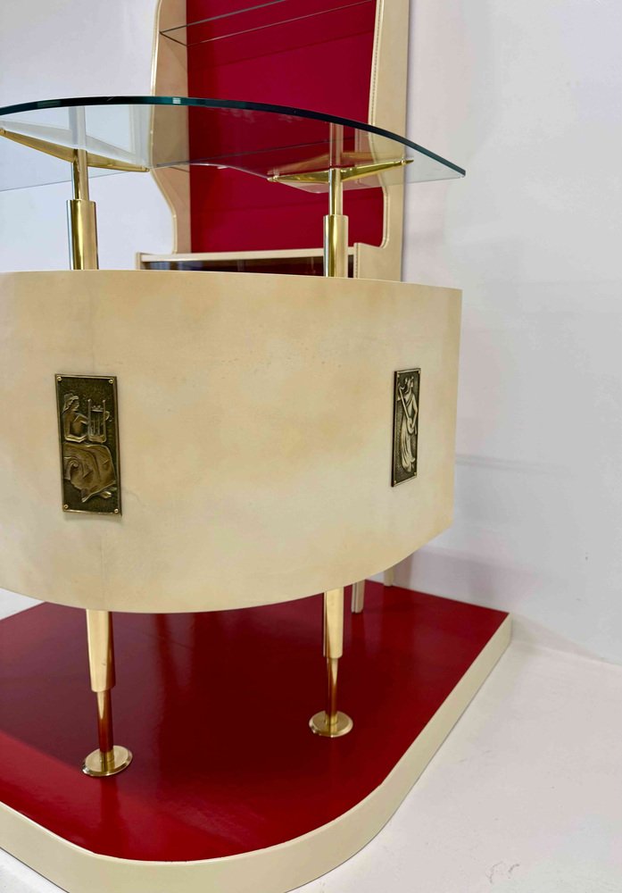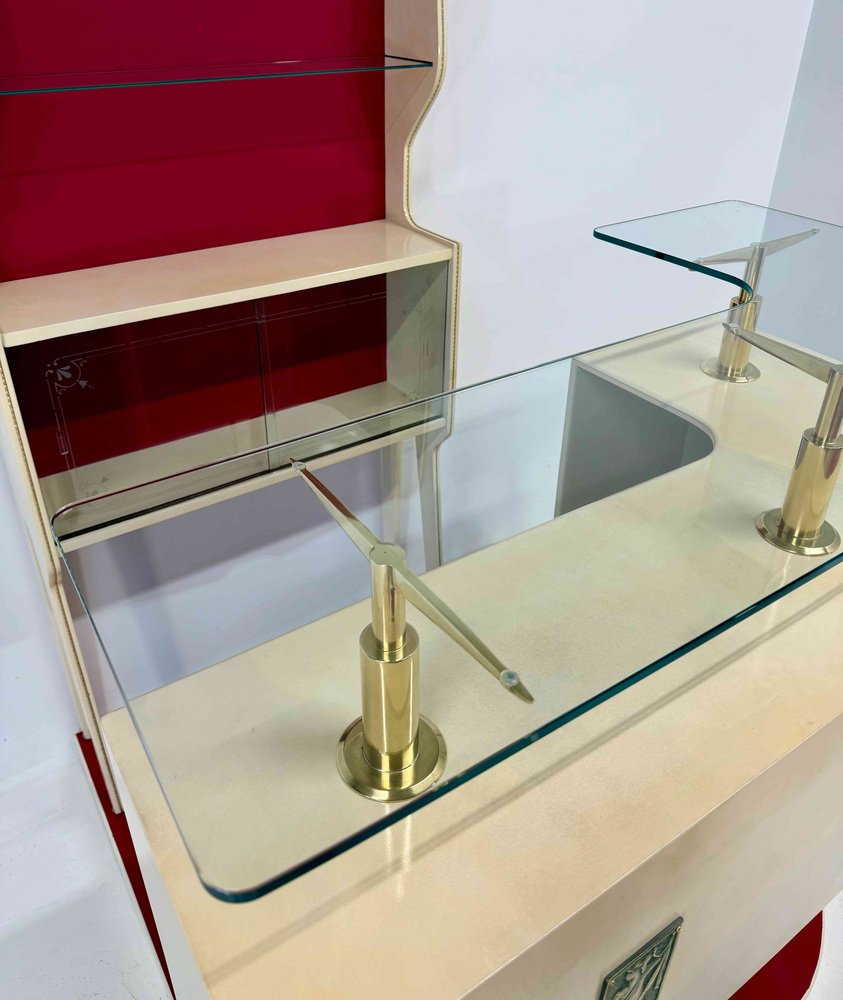 Bedeutende und skulpturale italienische Bar aus den 1950er Jahren, Gio Ponti zugeschrieben, die ein raffiniertes Beispiel für architektonisches Design im Möbelbau darstellt. Die gesamte Struktur ist vollständig mit Pergament verkleidet und mit Elfenbeinlack kombiniert, wodurch ein elegantes Gleichgewicht zwischen weichen Oberflächen, Licht und architektonischen Volumen entsteht. Die Bar ist als funktionales und gegliedertes Ensemble konzipiert, das aus einer Bar-Einheit, einer Plattform und einer separaten Vitrine besteht.
