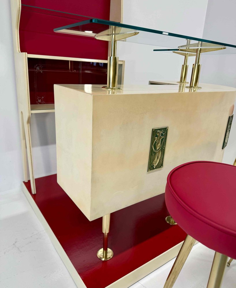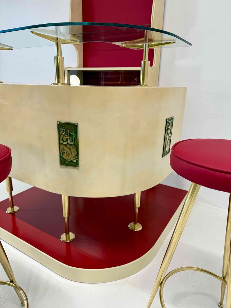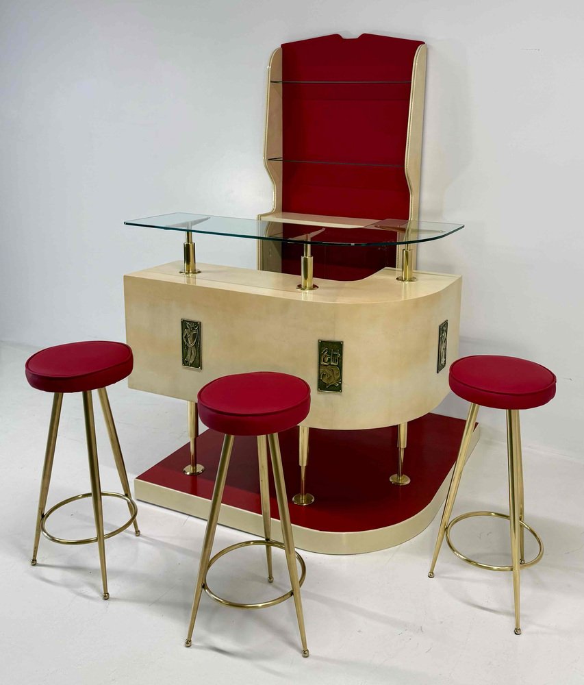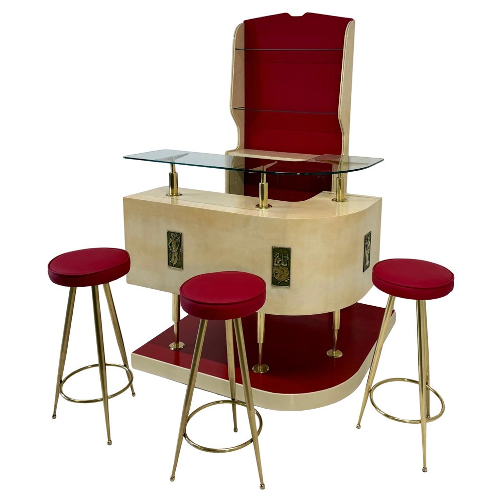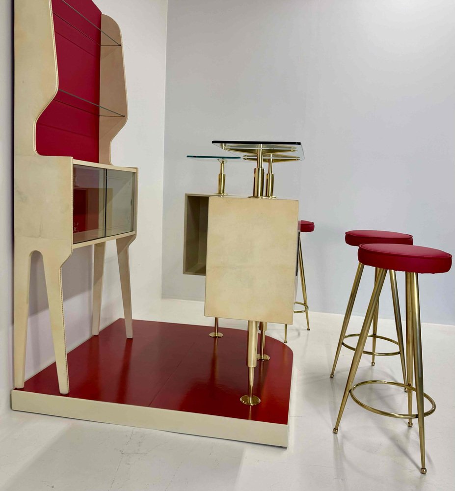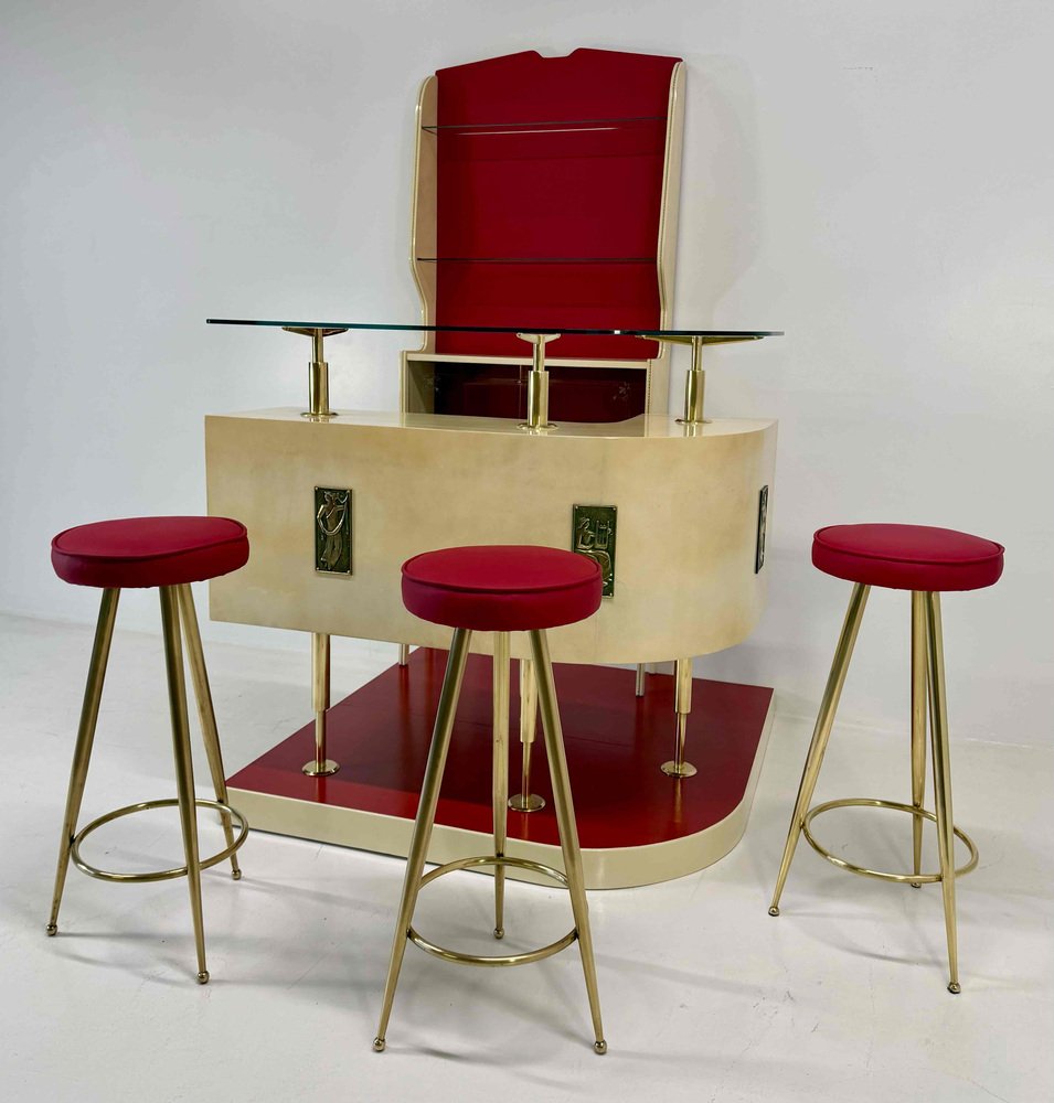 The ensemble is completed by three original stools, featuring recently reupholstered red leather seats with brass legs and footrests, perfectly coordinated with the formal language of the bar.
