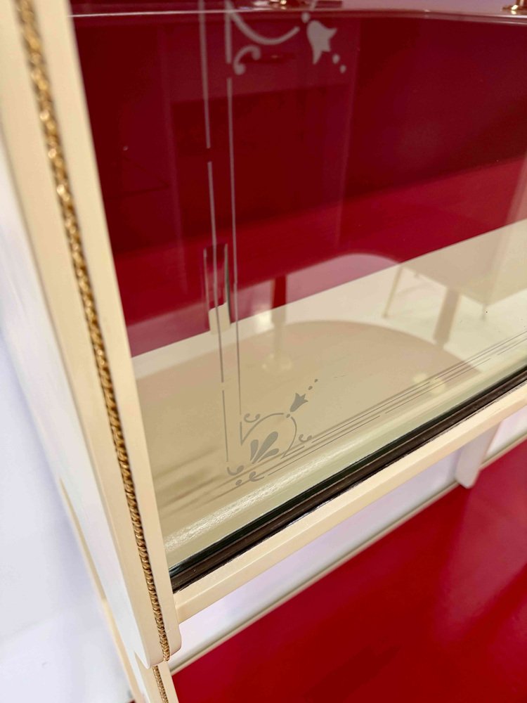The display cabinet features sandblasted etched sliding glass doors and is enhanced by a refined flush-set brass inlay embedded within the wooden structure, housed in a slim recessed groove and seamlessly integrated into the original design. A detail of outstanding craftsmanship, typical of high-quality Italian production of the period.