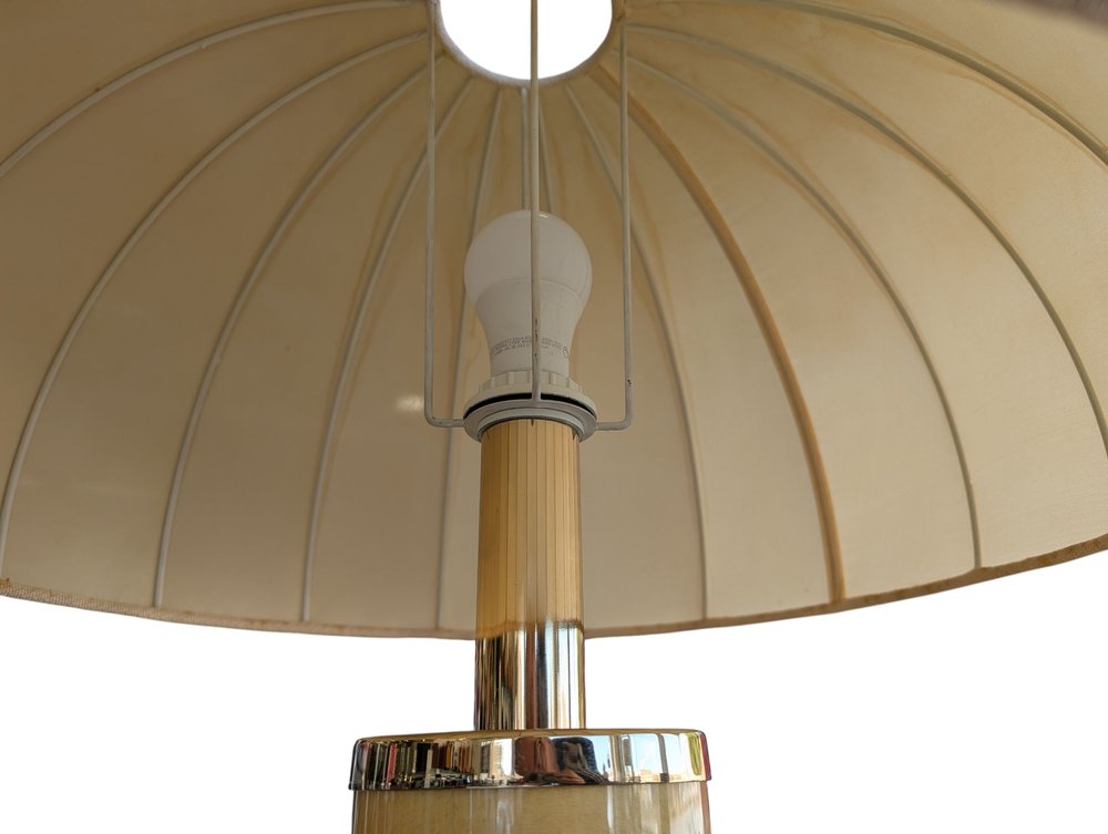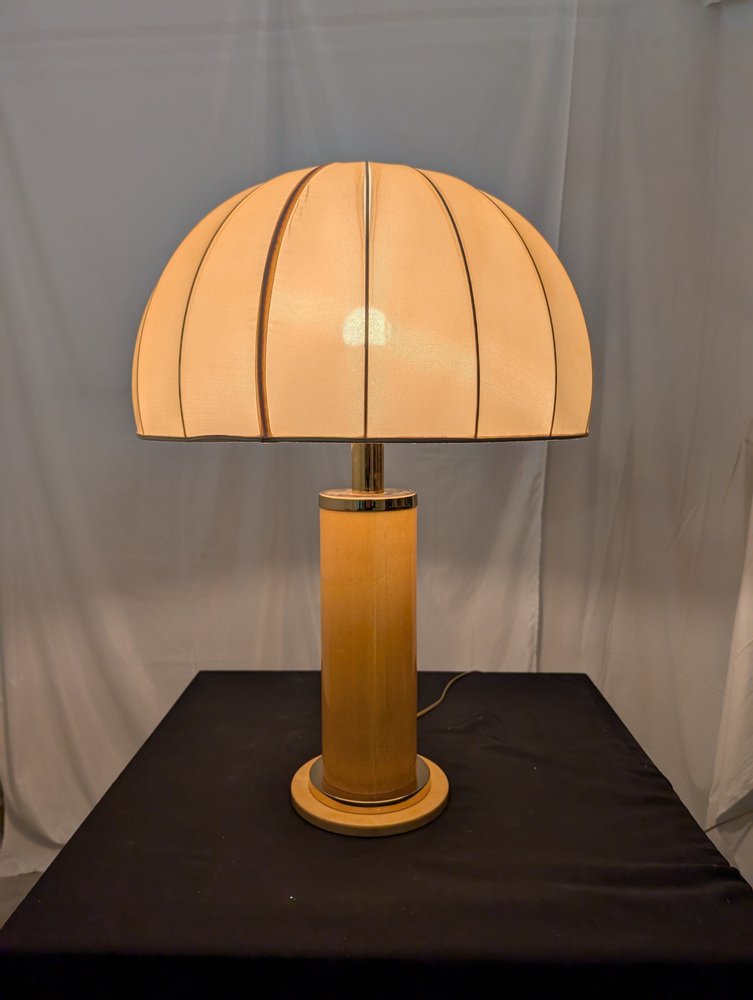 Eine raffinierte Tischleuchte der Spitzenklasse von TURA, ein authentisches Stück italienischen Designs, das für seine hervorragende Handwerkskunst und seine luxuriöse Ästhetik bekannt ist. Das Originaletikett auf dem Sockel bestätigt die Herkunft aus der Feder des renommierten Designers Aldo Tura, der für die Verwendung exotischer Materialien und tadelloser Verarbeitung bekannt ist.