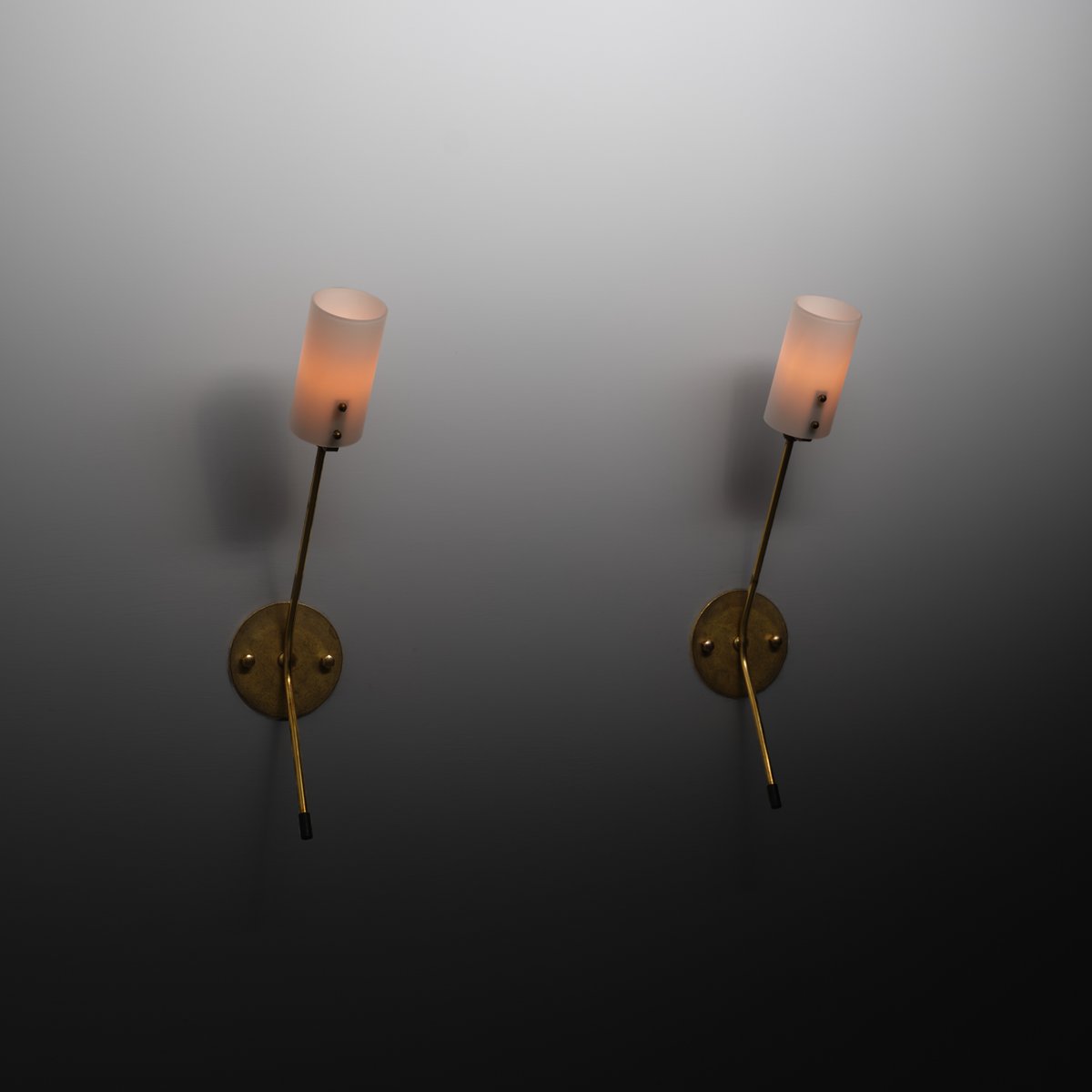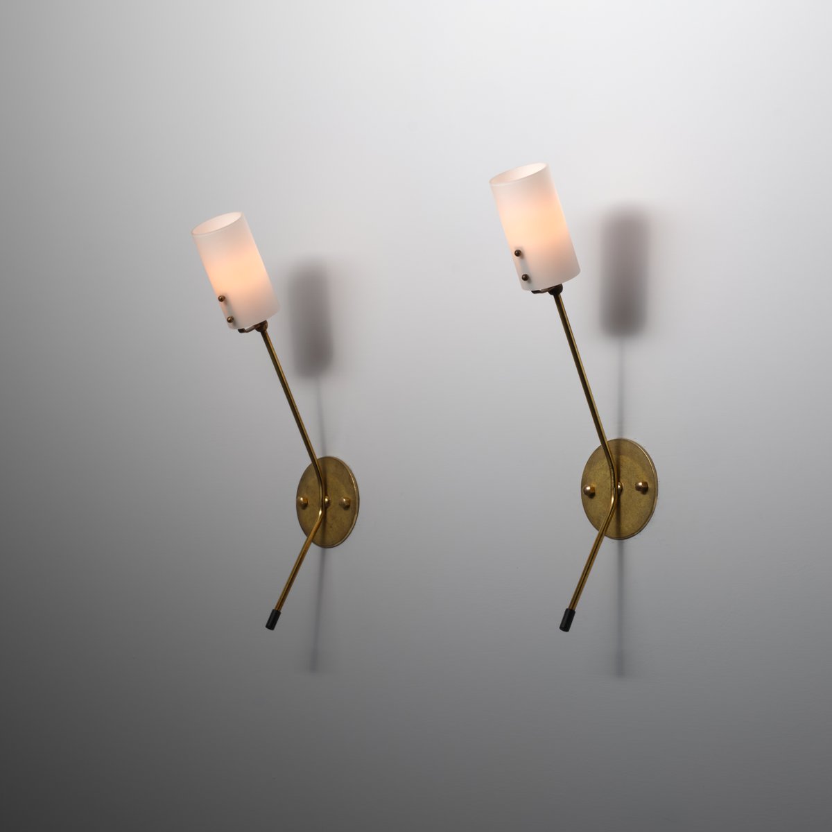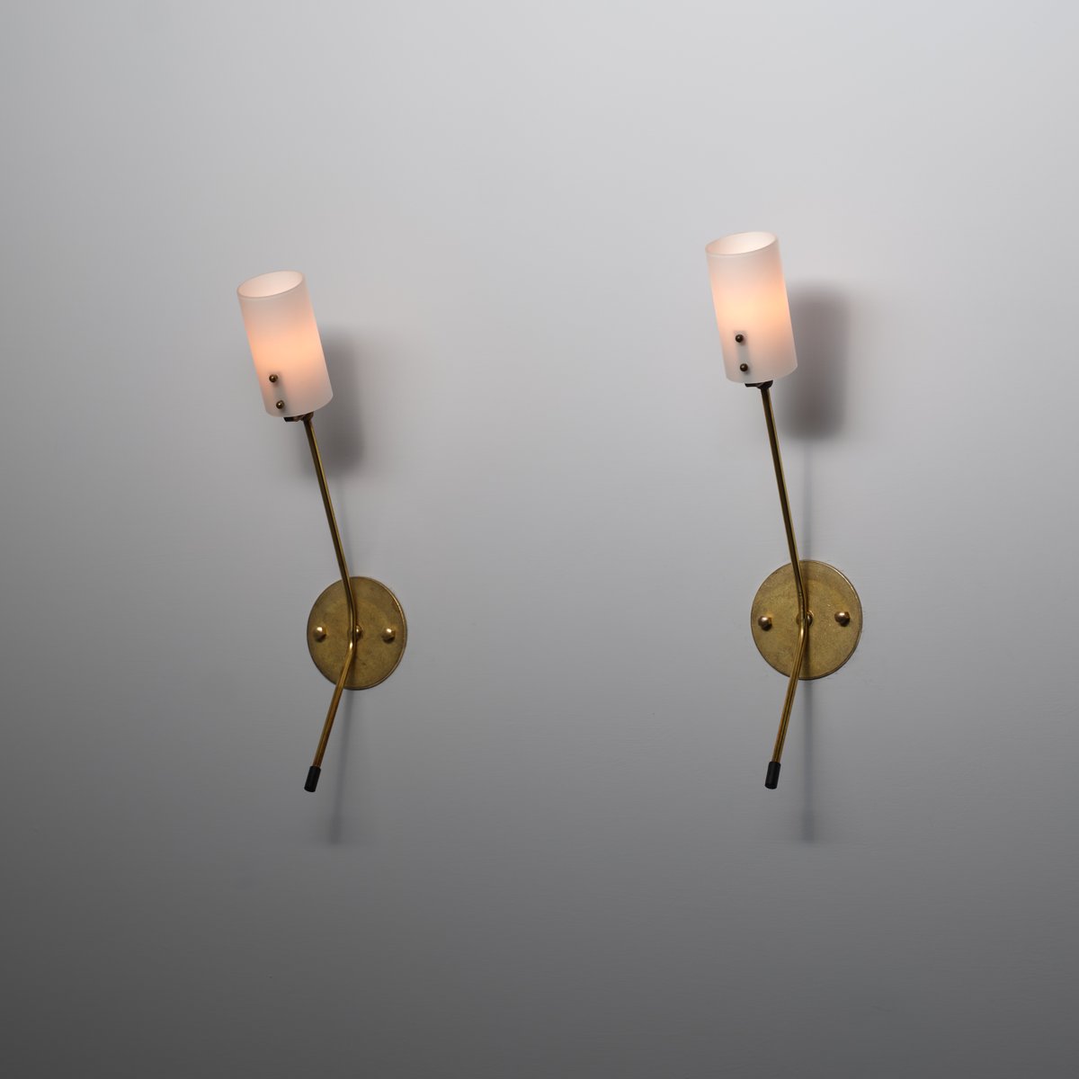 Ein Paar italienischer Wandleuchten aus den 1950er Jahren, die sich durch ein minimalistisches, lineares Design auszeichnen. Jede Leuchte hat einen zylindrischen Opalglasdiffusor, der von einem schlanken Messingarm getragen wird, der von einer runden Wandplatte ausgeht. Die Platte mit einem Durchmesser von 10 cm (3,93 Zoll) verankert die Leuchte an der Wand und ist mit zwei sichtbaren Messingverschlüssen befestigt.