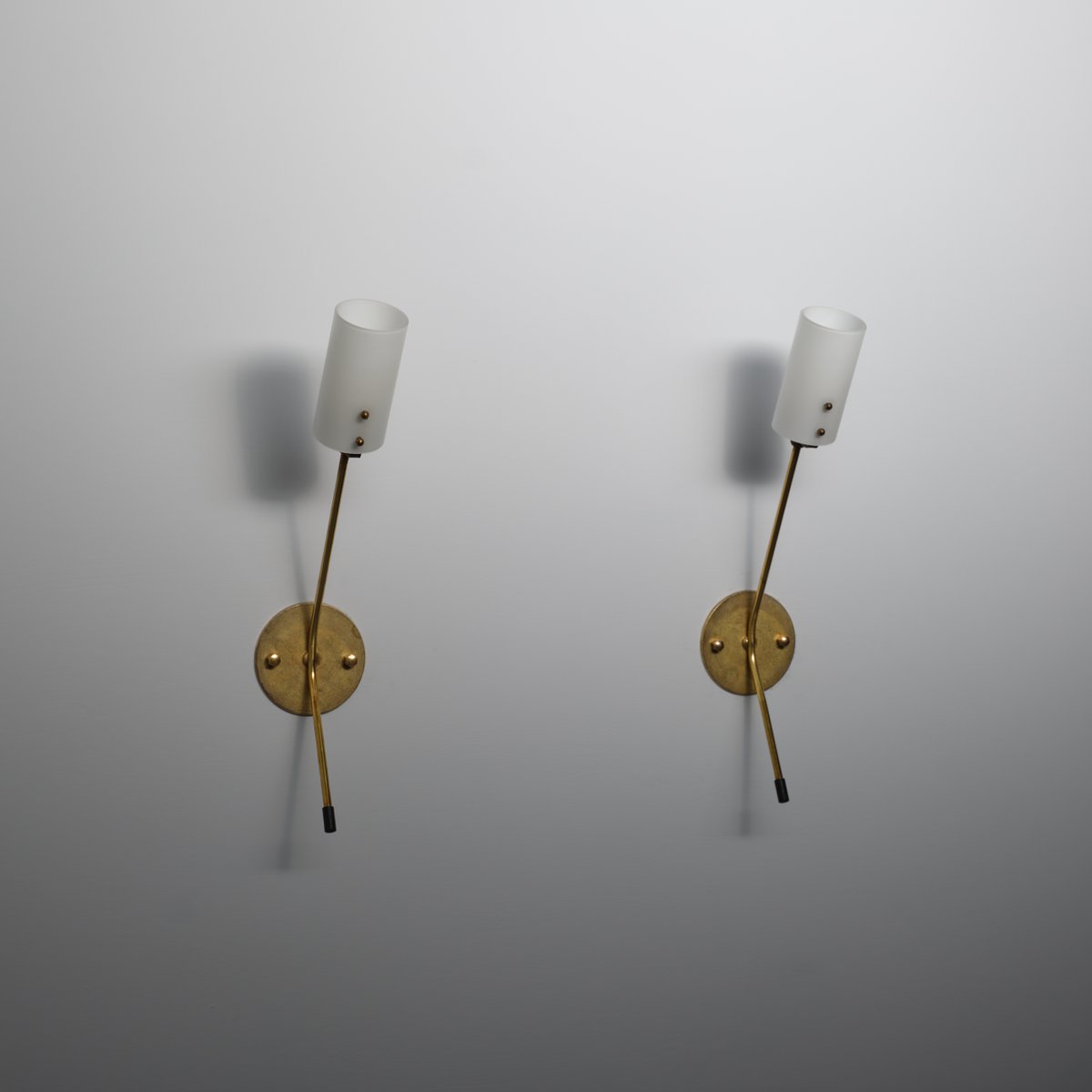Pair of Italian wall sconces produced in the 1950s, characterized by a minimalist linear design. Each lamp features a cylindrical opaline glass diffuser supported by a slender brass arm that extends from a circular wall plate. The plate, with a diameter of 10 cm (3.93 in), anchors the fixture to the wall and is secured with two visible brass fasteners.