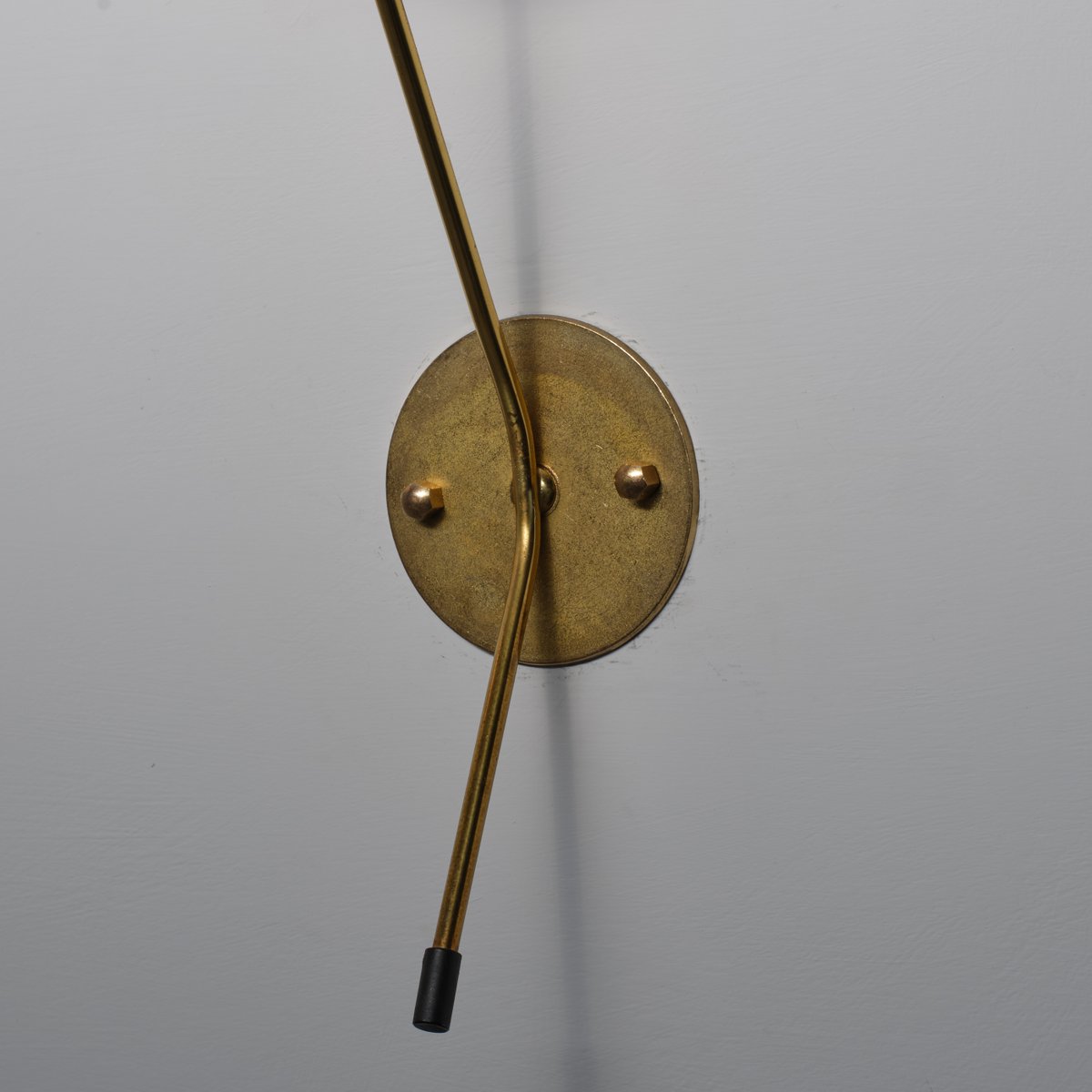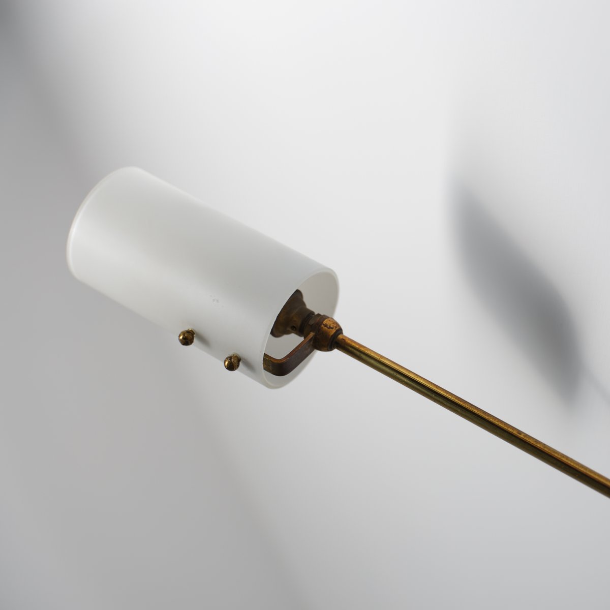 Der Stab verläuft diagonal und endet in einer kleinen schwarzen Kappe, die die visuelle Komposition ausbalanciert. Die Glasdiffusoren sind mit zwei kleinen Messingstiften befestigt, die eine saubere mechanische Verbindung zwischen den Metall- und Glaskomponenten herstellen.