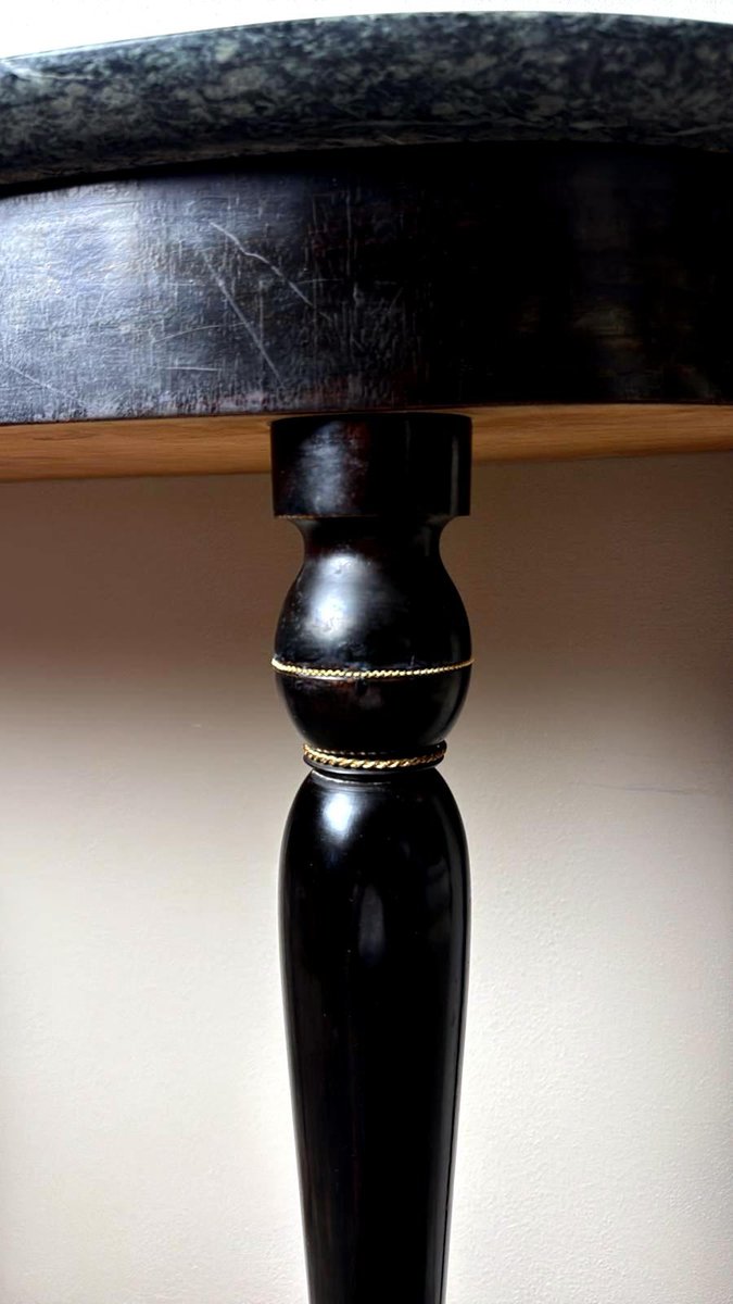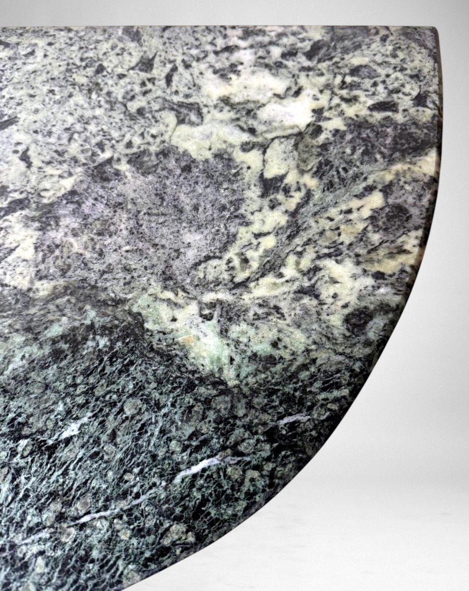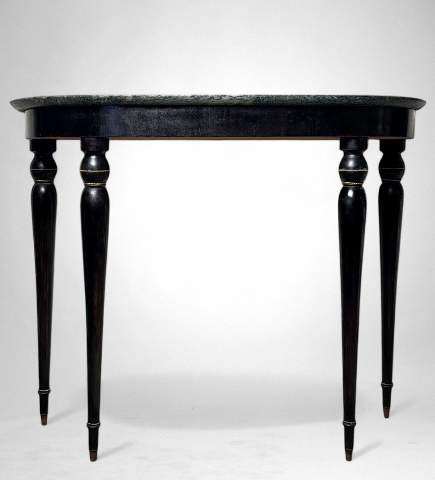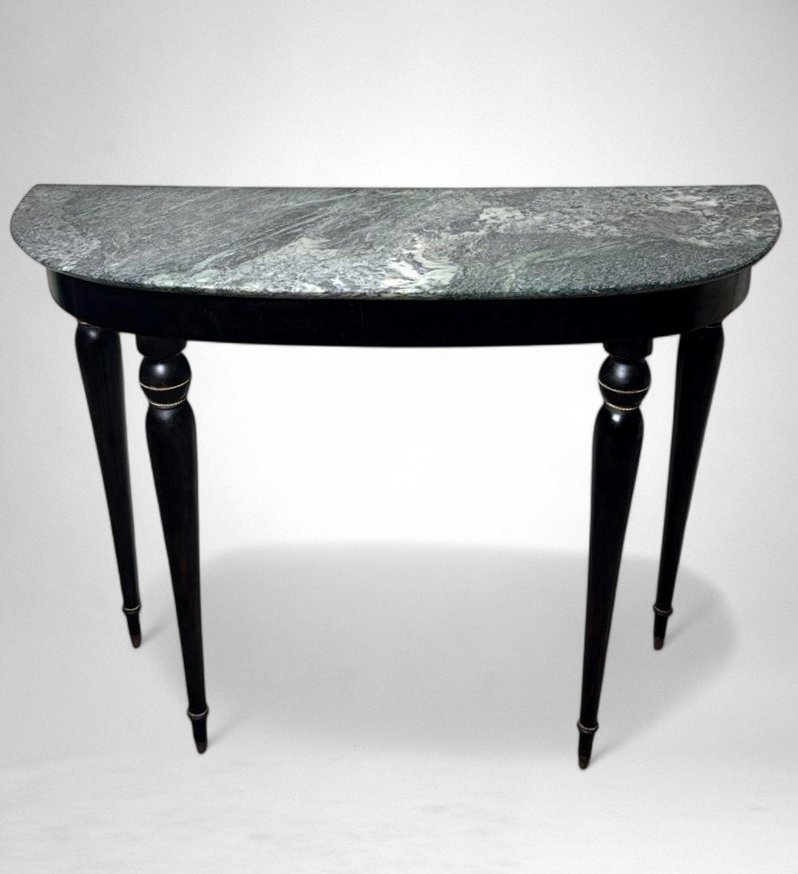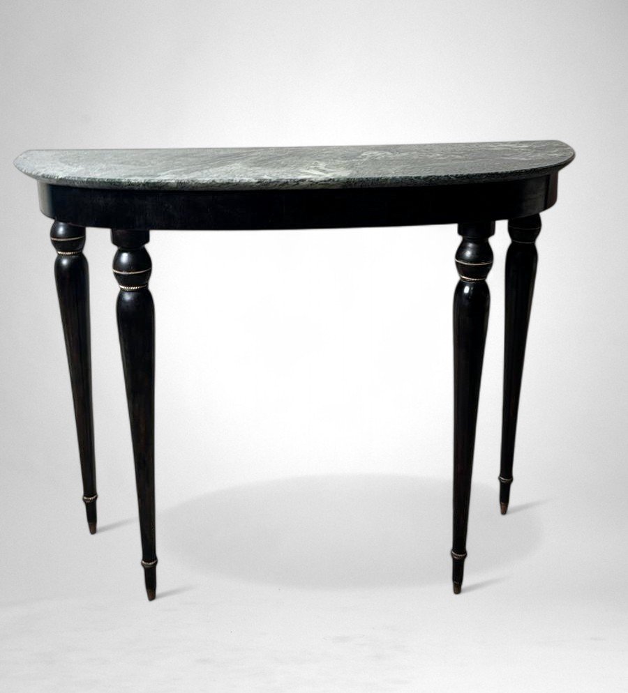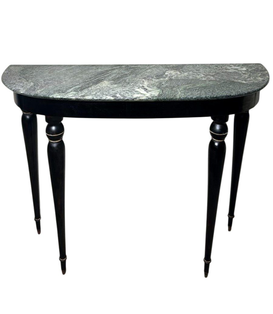 Elegant Italian console table from the 1950s, crafted from solid wood with an ebonized finish and featuring a fine “Verde Alpi” marble top. The demilune profile of the top, combined with four tapered legs, lends the piece a sense of lightness and timeless elegance, making it perfect for an entryway, hallway, or formal setting. The ebonized finish reflects the refined aesthetic of Italian postwar production, while the Verde Alpi marble — with its striking veins reminiscent of mountain landscapes and deep green tones — gives the surface remarkable visual impact and a luxurious tactile quality. Quarried in the Aosta Valley, this marble is also known for its use in Florence’s Santa Maria Novella train station. The slender, gently tapered legs showcase meticulous craftsmanship and a sophisticated design language, subtly evoking neoclassical references reinterpreted through a modern lens. Though unsigned, this console perfectly embodies the spirit of 1950s Italian design: noble materials, balanced proportions, restrained elegance, and high-quality finishes. Its likely origin is Northern Italy, considering the materials and construction techniques used; regions such as Lombardy — particularly Milan, Como, and the Brianza area — were well known for producing fine furniture in the postwar years. The use of marble, often sourced from Alpine quarries in Northern Italy, further supports this attribution. Its compact dimensions (108 cm / 42.5 in wide) make it ideal even for smaller spaces or as a refined accent piece along an entryway wall. The contrast between the glossy black ebonized finish and the natural tones of the marble creates a graphic and contemporary visual effect — perfect for interiors that reference Italian mid-century design while maintaining a sense of understated sophistication. Paired with a mirror or wall sconces, its demilune shape can be further highlighted to enhance the decorative impact of a foyer or hallway. The marble top offers excellent resistance to everyday use and can support art objects, medium-height plants, or architecture books, while the solid wood structure ensures lasting stability and durability. A fine choice for collectors and interior designers seeking authentic Italian mid-century pieces distinguished by charm, craftsmanship, and style. Excellent vintage condition consistent with age and use, and ready for placement in an elegant interior. Dimensions: Width 108 cm (42.5 in), Depth 38 cm (15 in), Height 85 cm (33.5 in).