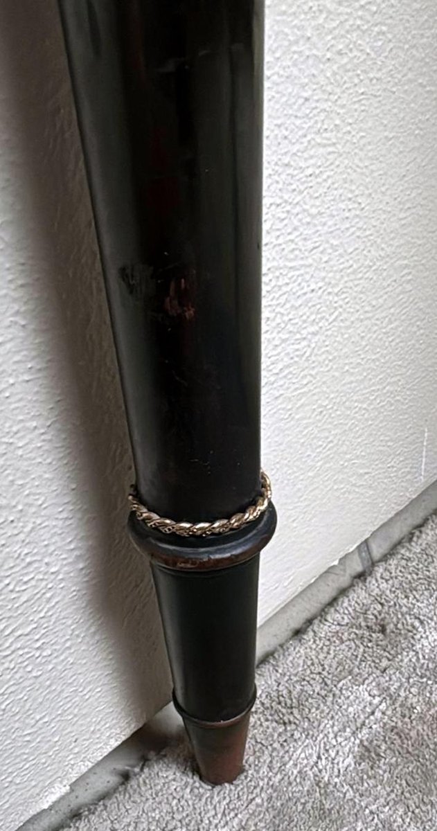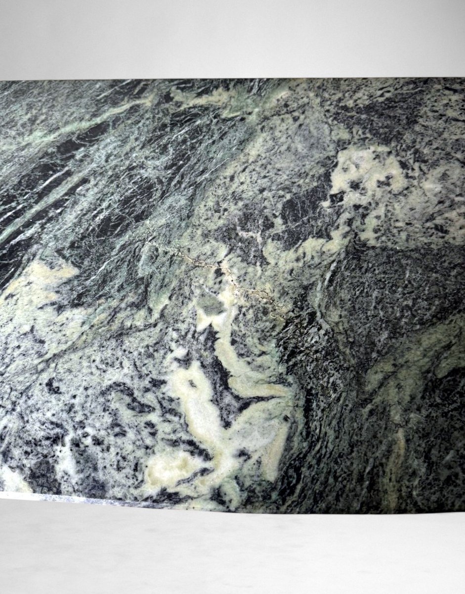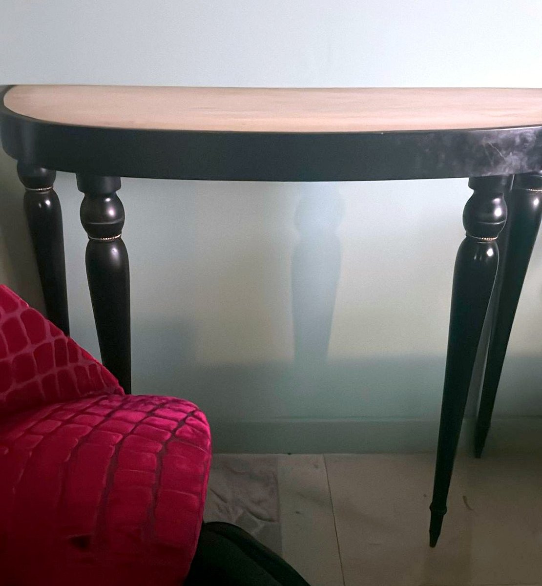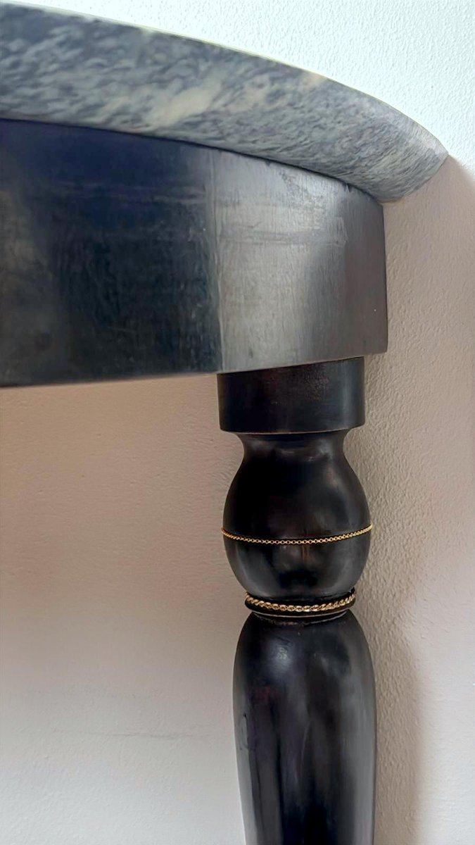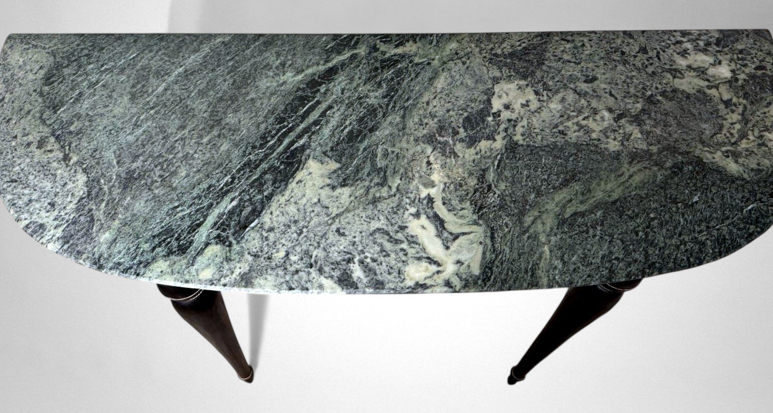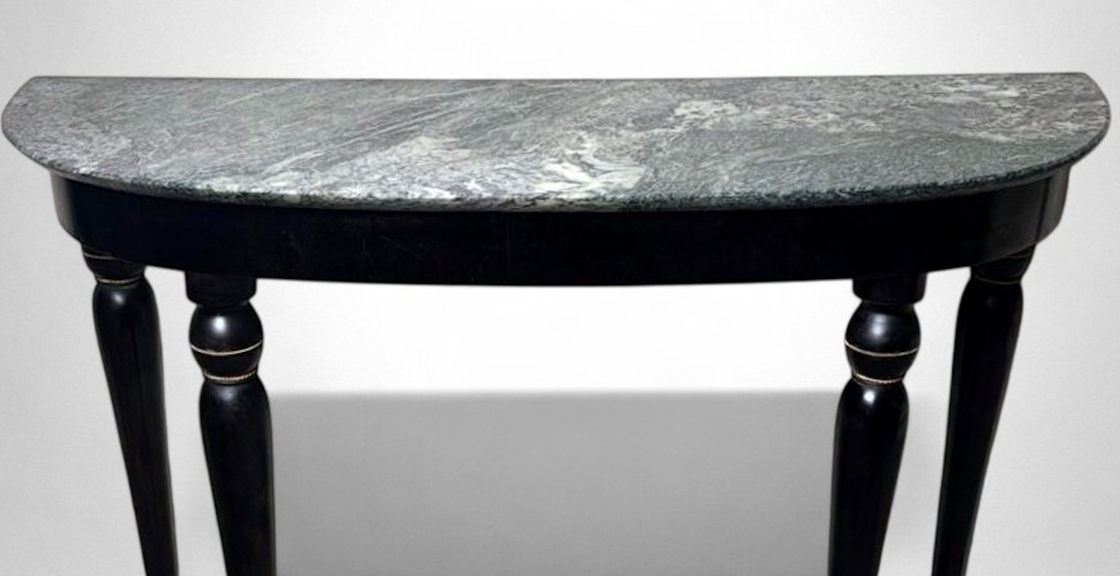 Elegant Italian console table from the 1950s, crafted from solid wood with an ebonized finish and featuring a fine “Verde Alpi” marble top. The demilune profile of the top, combined with four tapered legs, lends the piece a sense of lightness and timeless elegance, making it perfect for an entryway, hallway, or formal setting. The ebonized finish reflects the refined aesthetic of Italian postwar production, while the Verde Alpi marble — with its striking veins reminiscent of mountain landscapes and deep green tones — gives the surface remarkable visual impact and a luxurious tactile quality. Quarried in the Aosta Valley, this marble is also known for its use in Florence’s Santa Maria Novella train station. The slender, gently tapered legs showcase meticulous craftsmanship and a sophisticated design language, subtly evoking neoclassical references reinterpreted through a modern lens. Though unsigned, this console perfectly embodies the spirit of 1950s Italian design: noble materials, balanced proportions, restrained elegance, and high-quality finishes. Its likely origin is Northern Italy, considering the materials and construction techniques used; regions such as Lombardy — particularly Milan, Como, and the Brianza area — were well known for producing fine furniture in the postwar years. The use of marble, often sourced from Alpine quarries in Northern Italy, further supports this attribution. Its compact dimensions (108 cm / 42.5 in wide) make it ideal even for smaller spaces or as a refined accent piece along an entryway wall. The contrast between the glossy black ebonized finish and the natural tones of the marble creates a graphic and contemporary visual effect — perfect for interiors that reference Italian mid-century design while maintaining a sense of understated sophistication. Paired with a mirror or wall sconces, its demilune shape can be further highlighted to enhance the decorative impact of a foyer or hallway. The marble top offers excellent resistance to everyday use and can support art objects, medium-height plants, or architecture books, while the solid wood structure ensures lasting stability and durability. A fine choice for collectors and interior designers seeking authentic Italian mid-century pieces distinguished by charm, craftsmanship, and style. Excellent vintage condition consistent with age and use, and ready for placement in an elegant interior. Dimensions: Width 108 cm (42.5 in), Depth 38 cm (15 in), Height 85 cm (33.5 in).