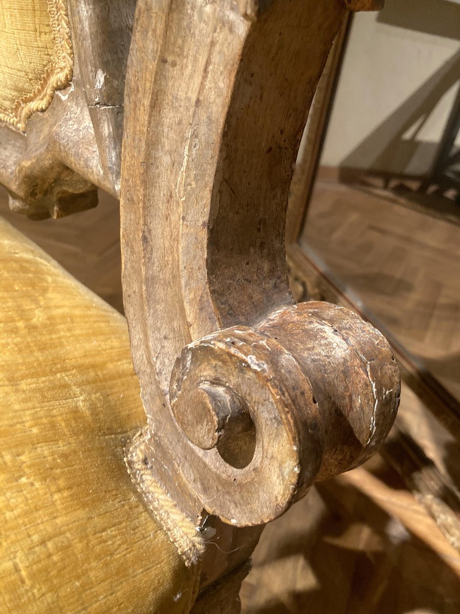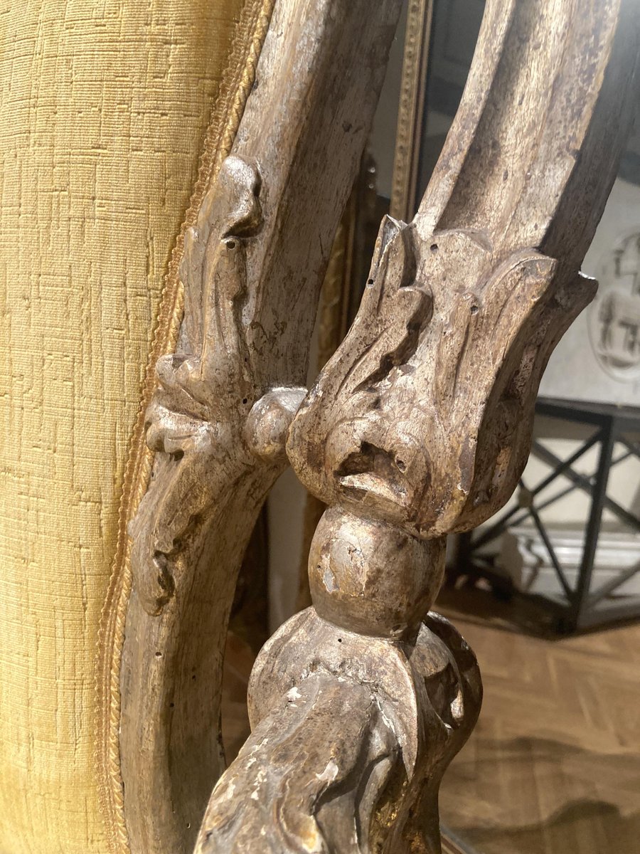 This antique Italian Rococo 18th century (1740 circa) throne armchair sourced in a palazzo in Rome, features swirls, curls and foliate motif richly hand carved throughout, the solid wood deeply carved and pierced boasts a super chic mecca gilding with silver leaf. The high backrest and the slightly curved armrests are beyond decorative with the important crest worked on top and its rocaille design. Overstuffed back and seat upholstered in mustard yellow velvet guarantee full comfort. Solid and sturdy, X stretcher solid wood connecting the cabriolet legs strengthen the seating stability. Elegant and large, this solid wood armchair with wide seat finished in mecca gilding is decorative and extremely scenographic, a wondeful addition to any room especially in a library, study or office as a luxurious desk chair. Perfect structural condition, very good antique condition considering age and use, wonderful original patina and mecca gilding. In our opinion some minor wear to the gilding do nothing but accentuates the solemn character of this antique piece of furniture, upon your request we can provide a conservative restoration service with a little extra. The velevet uphoster is in very good condition with only a minor wear on the right side of the seat as shown in the last photo. Measures: H. 126, W. 67, D. 51, Seat H. 46 cm.