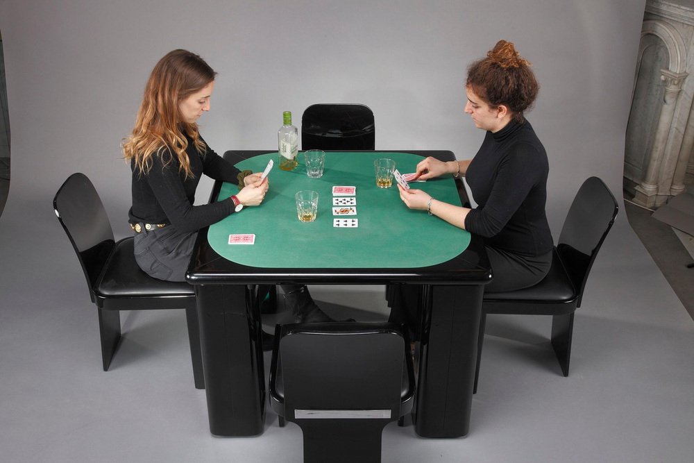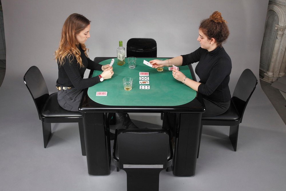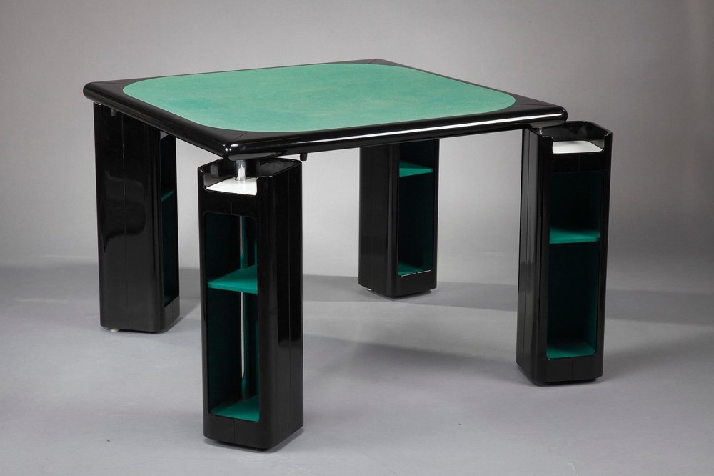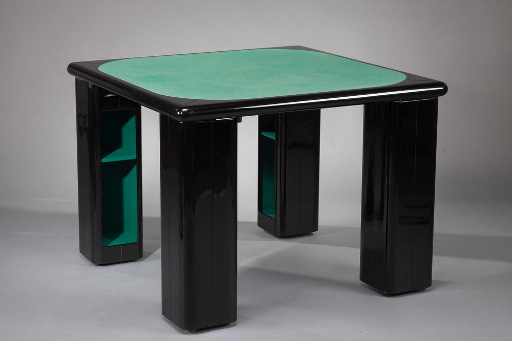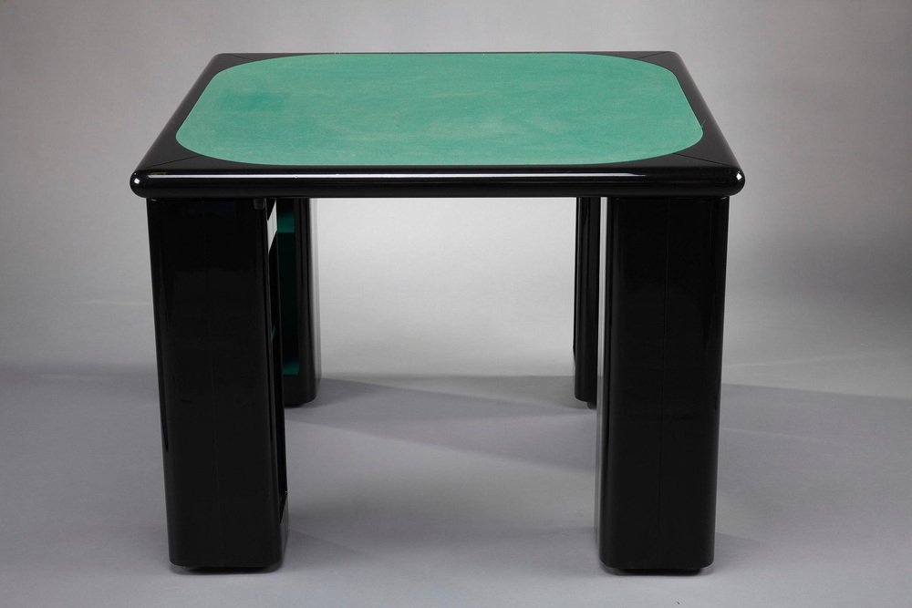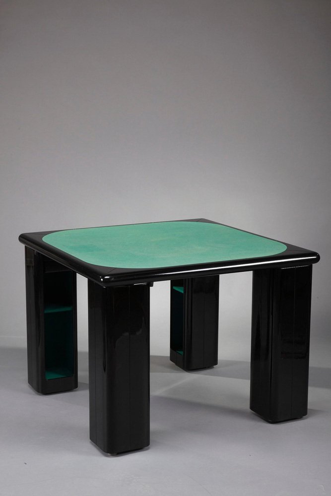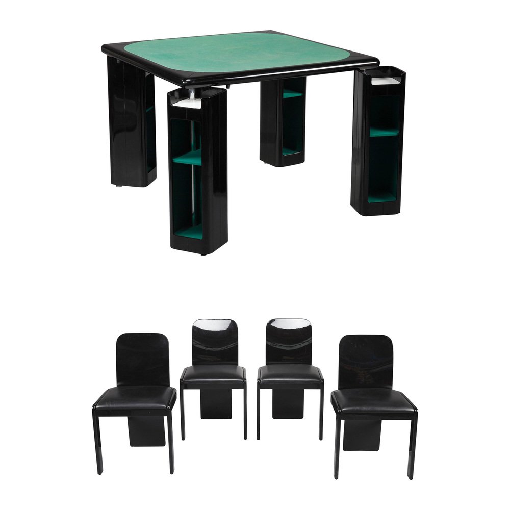 Italienischer Spieltisch für Bridge, Karten und Poker von Pierluigi Molinari (Mailand, 1938) für Pozzi Milano. Struktur aus lackiertem Ebenholz. Die vier würfelförmigen Beine können um ein Chromrohr gedreht werden, um Ablagefächer für Spiele, Karten oder Flaschen zu öffnen. Die Platte ist mit einer originalen Spielmatte aus grünem Filz bezogen. Das Set besteht aus 4 Stühlen, die aus lackiertem Holz gefertigt sind. Circa :1970 Abmessungen: Tisch: B: 102cm, T: 102cm, H: 76cm. / B: 40,2 Zoll, T: 40,2 Zoll, H: 29,9 Zoll. Abmessung: Stühle: B: 48cm, T: 48cm, H: 81cm.
