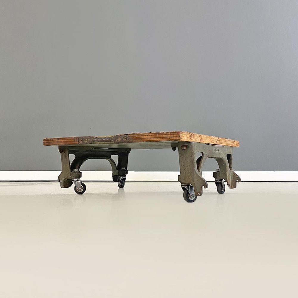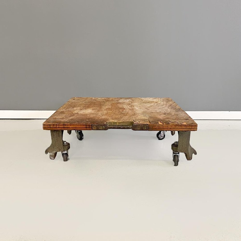 Italienischer Lagerwagen der Italienischen Staatsbahn aus Gusseisen und Holz mit Rädern, 1930er Jahre. Aufbewahrungswagen der Staatsbahn, mit gusseisernem Sockel und Rädern, mit quadratischer Holzplatte und einem Griff an einer der 4 Seiten, ebenfalls aus Gusseisen. Nicht-originale Räder. 1930 ca. Vintage-Zustand, unrestauriertes Klavier und Räder müssen überprüft werden. Maße in cm 68x58x23h Erinnerung, ein Augenblick aus der Vergangenheit, ein Stück italienischer Geschichte in einem Möbelwagen aus der Zeit um 1930. Ein Arbeitsgerät, das sich leicht in einen Couchtisch für ein modernes Wohnzimmer, für das Wohnzimmer eines Clubs oder für die Taverne einer großen Familie verwandeln lässt. Mit diesem Stück holen Sie sich italienische Geschichte in Ihr Zuhause.