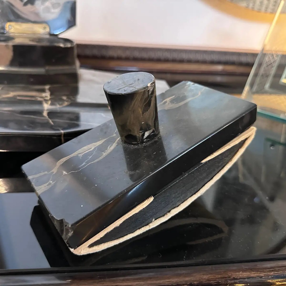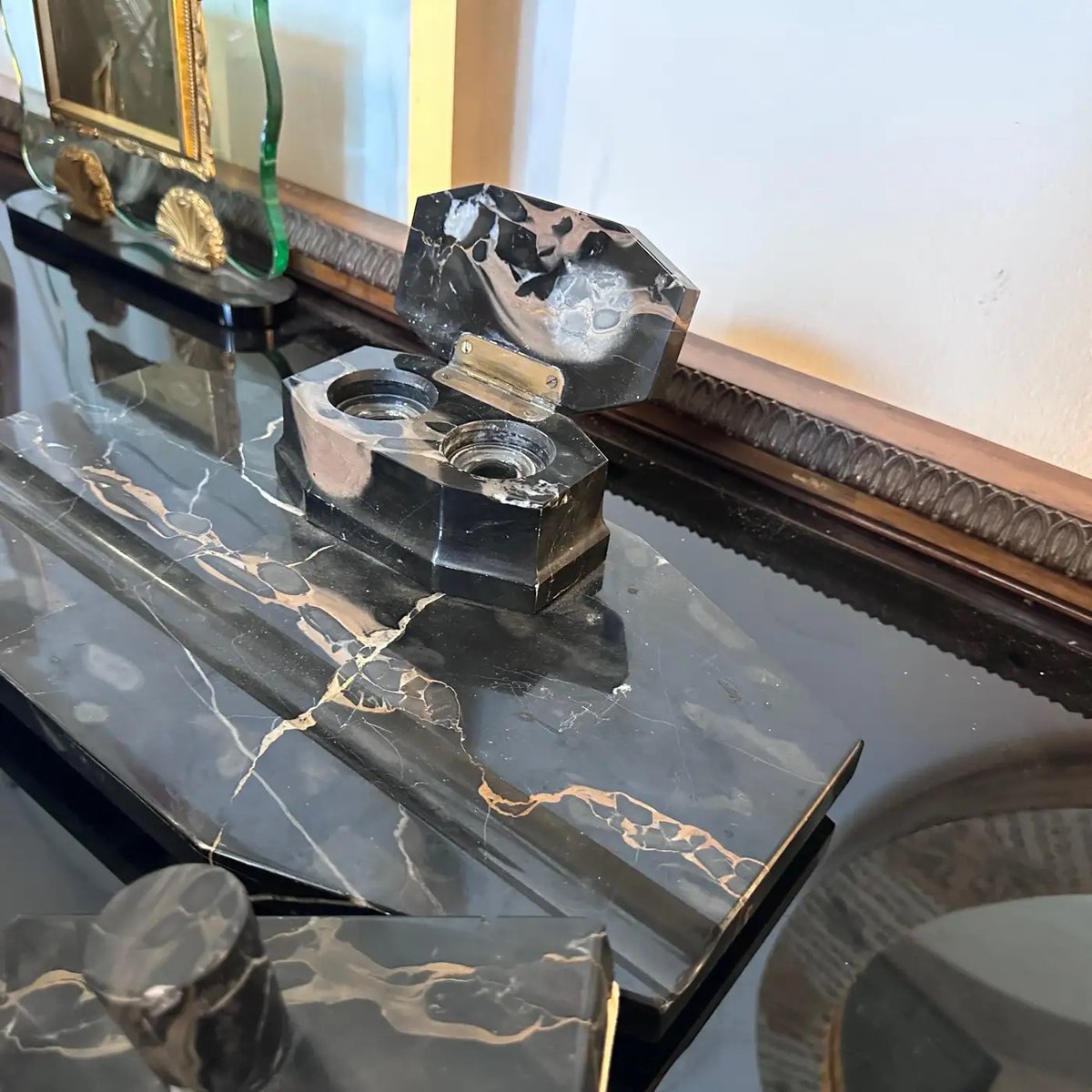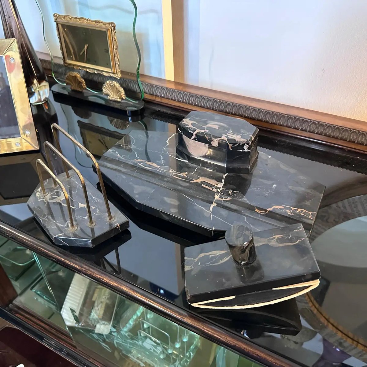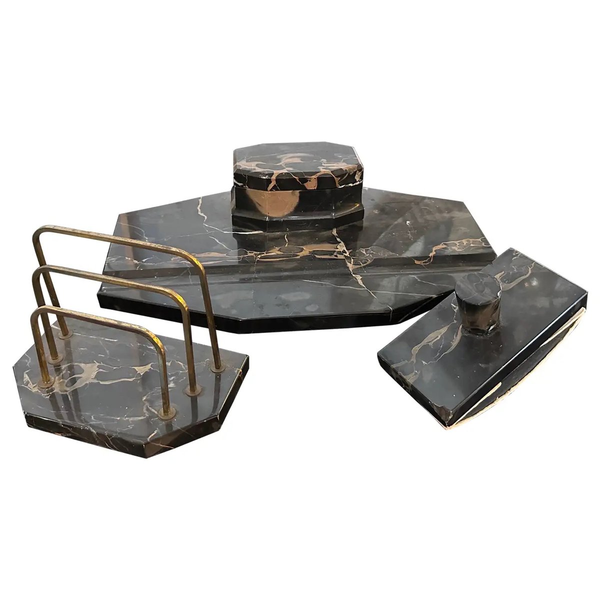 An art deco desk set manufactured in Italy in the Thirties, in original conditions with small signs of use and age, brass it's in original patina. Dimensions are of the Inkstand. This Desk Set is an exquisite embodiment of the opulent and geometric design aesthetic that defined the Art Deco movement during that era. Crafted with meticulous attention to detail, this desk set exudes luxury, sophistication, and a sense of timeless elegance. The set includes an inkstand, a paper holder and a signature pad, each thoughtfully designed to harmonize with the overall aesthetic. The primary material, Portoro marble, is a striking black marble with distinctive veins of gold or brass-like hues, adding a sense of drama and contrast to the ensemble. The marble is carefully cut and polished to showcase its natural beauty and unique veining patterns. Brass, a quintessential material of the Art Deco era, is incorporated into the design to create a stunning juxtaposition with the dark marble. The brass accents, often featuring geometric shapes and sleek lines, exude a sense of luxury and sophistication while complementing the marble's inherent elegance. The Italian origin of the desk set reflects the country's longstanding tradition of producing high-quality, luxurious goods. Italian artisans of the 1930s were known for their expertise in working with marble and metals, and this desk set is a testament to their skill and creativity. Placing this 1930s Art Deco Portoro Marble and Brass Italian Desk Set on a workspace would transform it into a luxurious and inspiring environment.
