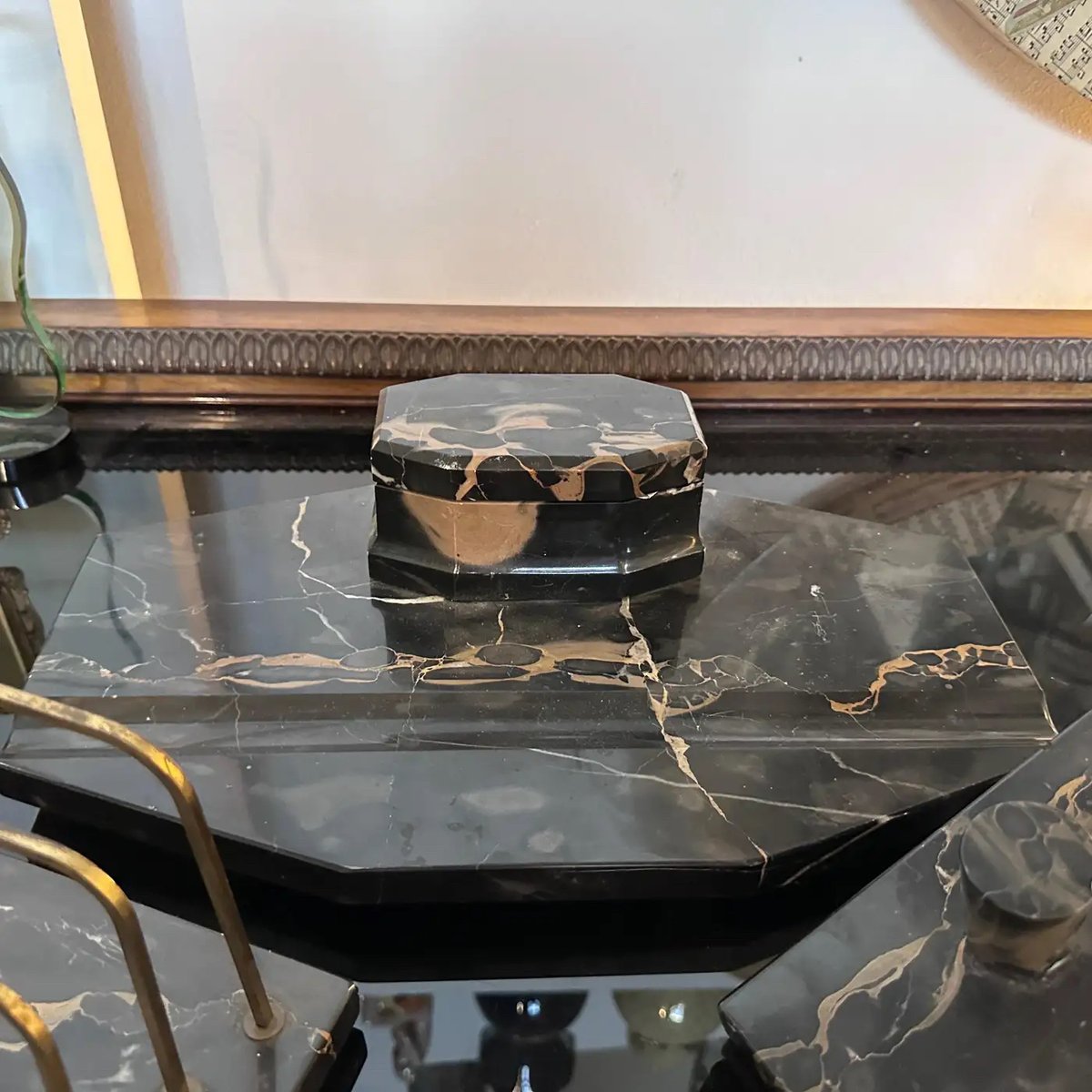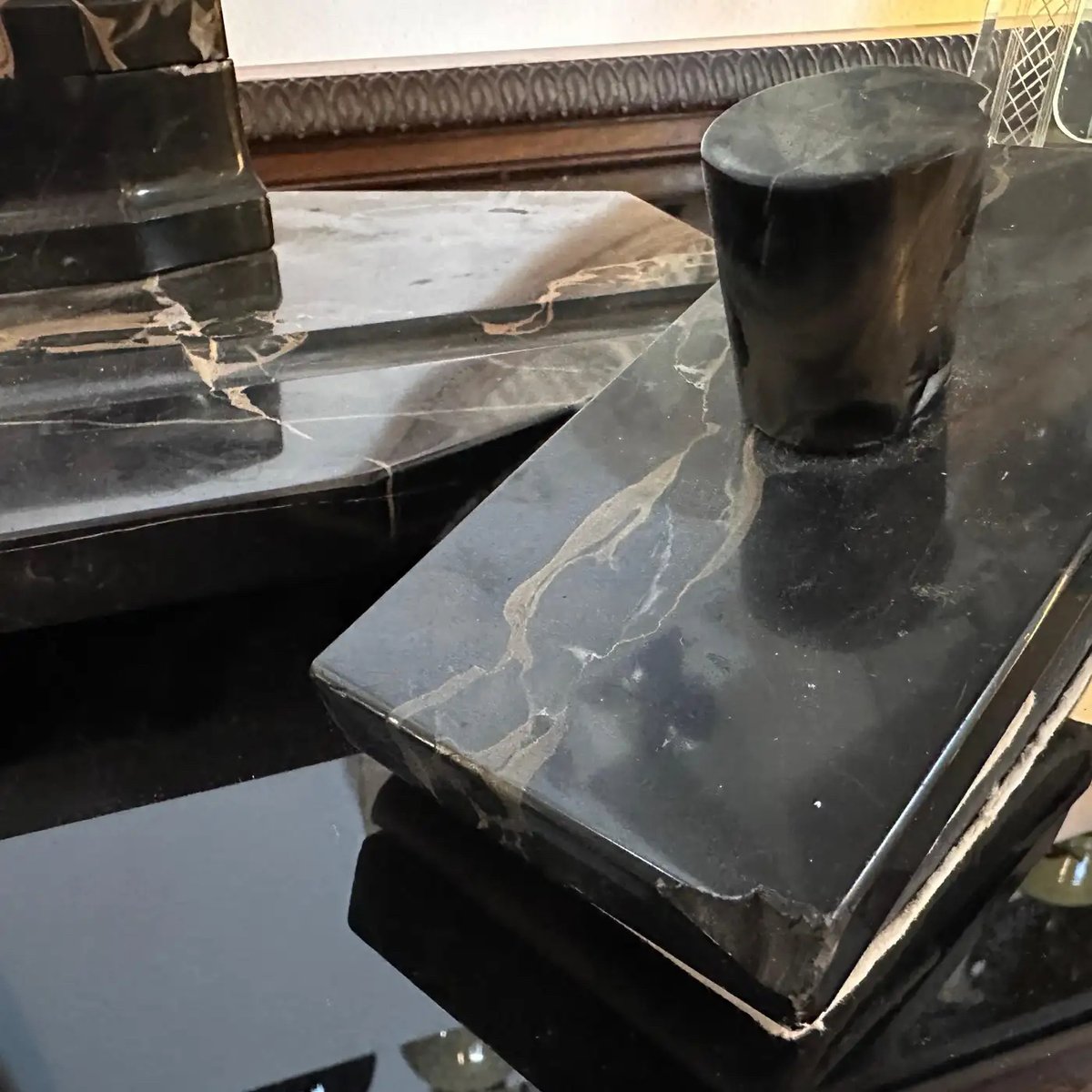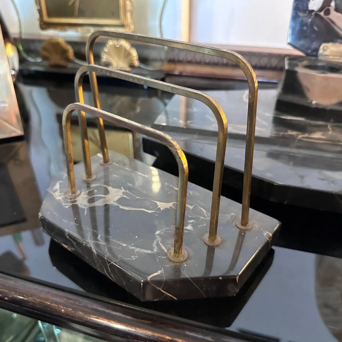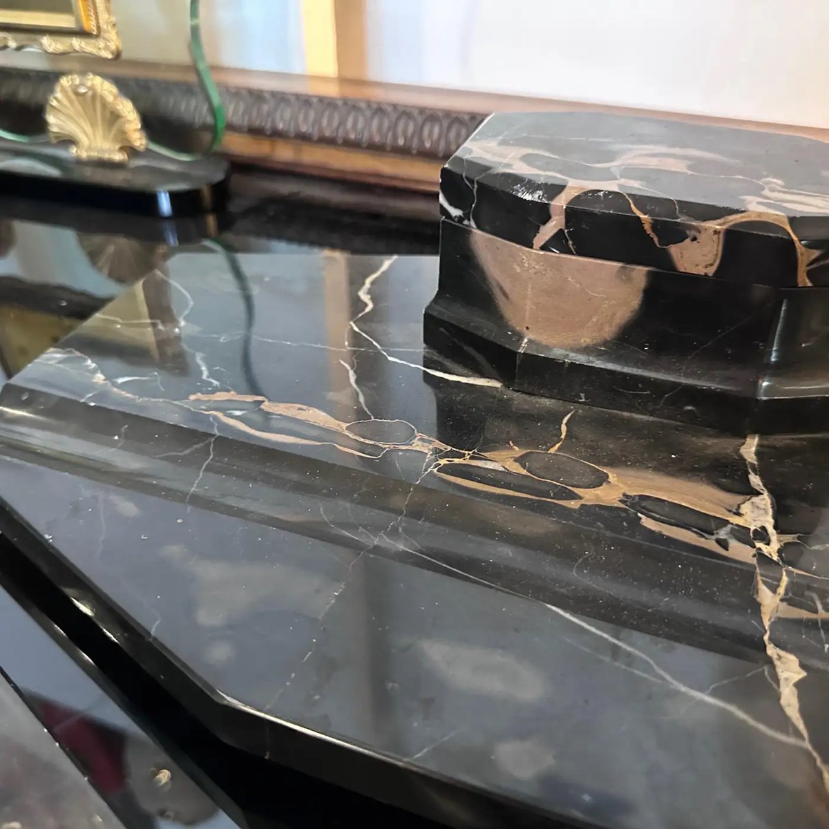 An art deco desk set manufactured in Italy in the Thirties, in original conditions with small signs of use and age, brass it's in original patina. Dimensions are of the Inkstand. This Desk Set is an exquisite embodiment of the opulent and geometric design aesthetic that defined the Art Deco movement during that era. Crafted with meticulous attention to detail, this desk set exudes luxury, sophistication, and a sense of timeless elegance. The set includes an inkstand, a paper holder and a signature pad, each thoughtfully designed to harmonize with the overall aesthetic. The primary material, Portoro marble, is a striking black marble with distinctive veins of gold or brass-like hues, adding a sense of drama and contrast to the ensemble. The marble is carefully cut and polished to showcase its natural beauty and unique veining patterns. Brass, a quintessential material of the Art Deco era, is incorporated into the design to create a stunning juxtaposition with the dark marble. The brass accents, often featuring geometric shapes and sleek lines, exude a sense of luxury and sophistication while complementing the marble's inherent elegance. The Italian origin of the desk set reflects the country's longstanding tradition of producing high-quality, luxurious goods. Italian artisans of the 1930s were known for their expertise in working with marble and metals, and this desk set is a testament to their skill and creativity. Placing this 1930s Art Deco Portoro Marble and Brass Italian Desk Set on a workspace would transform it into a luxurious and inspiring environment.