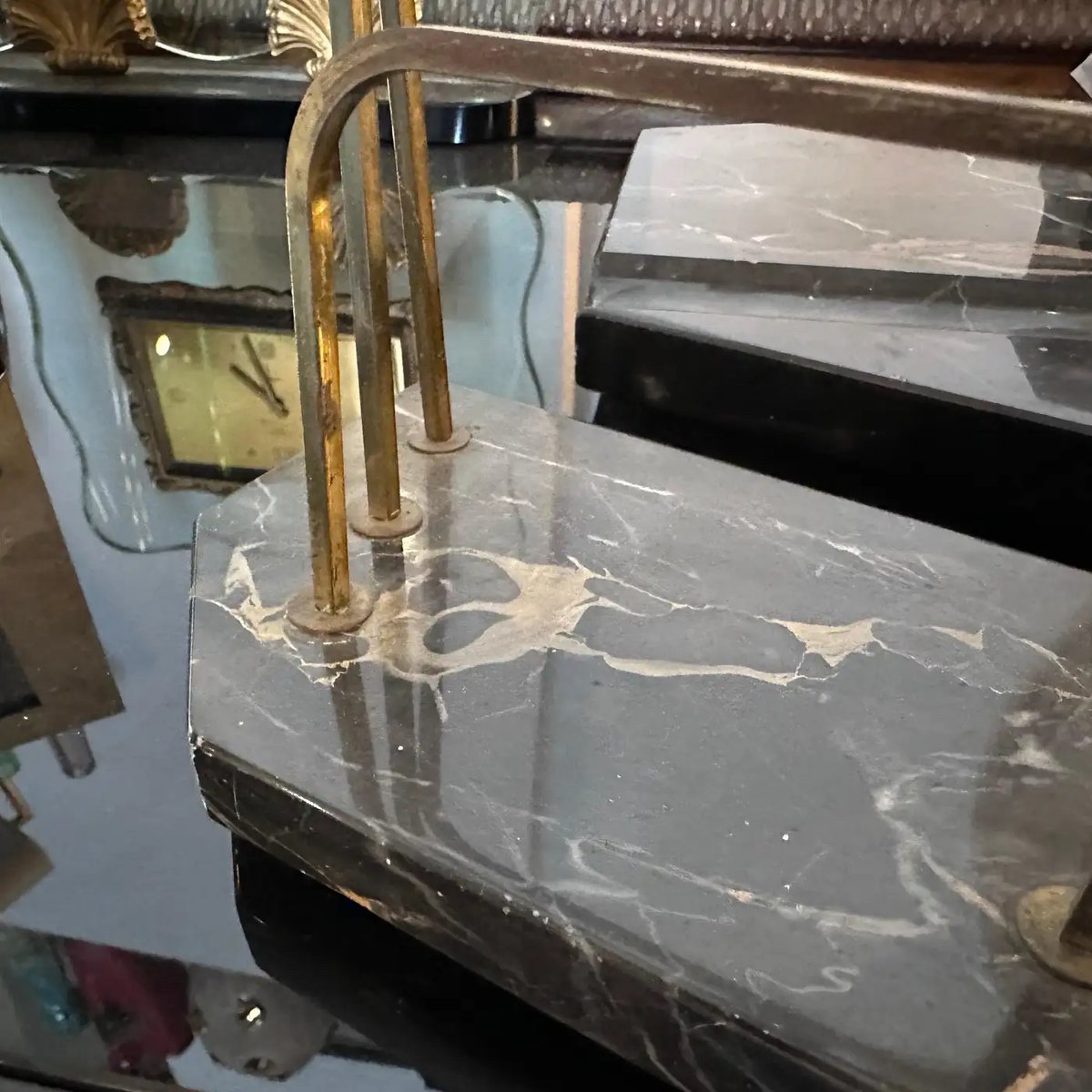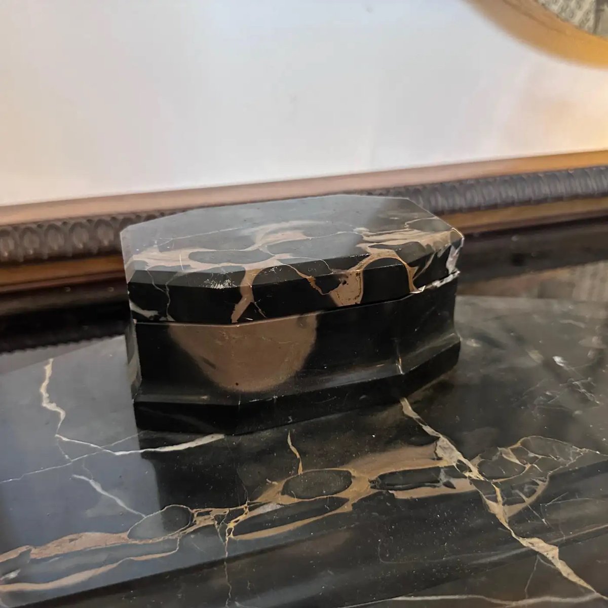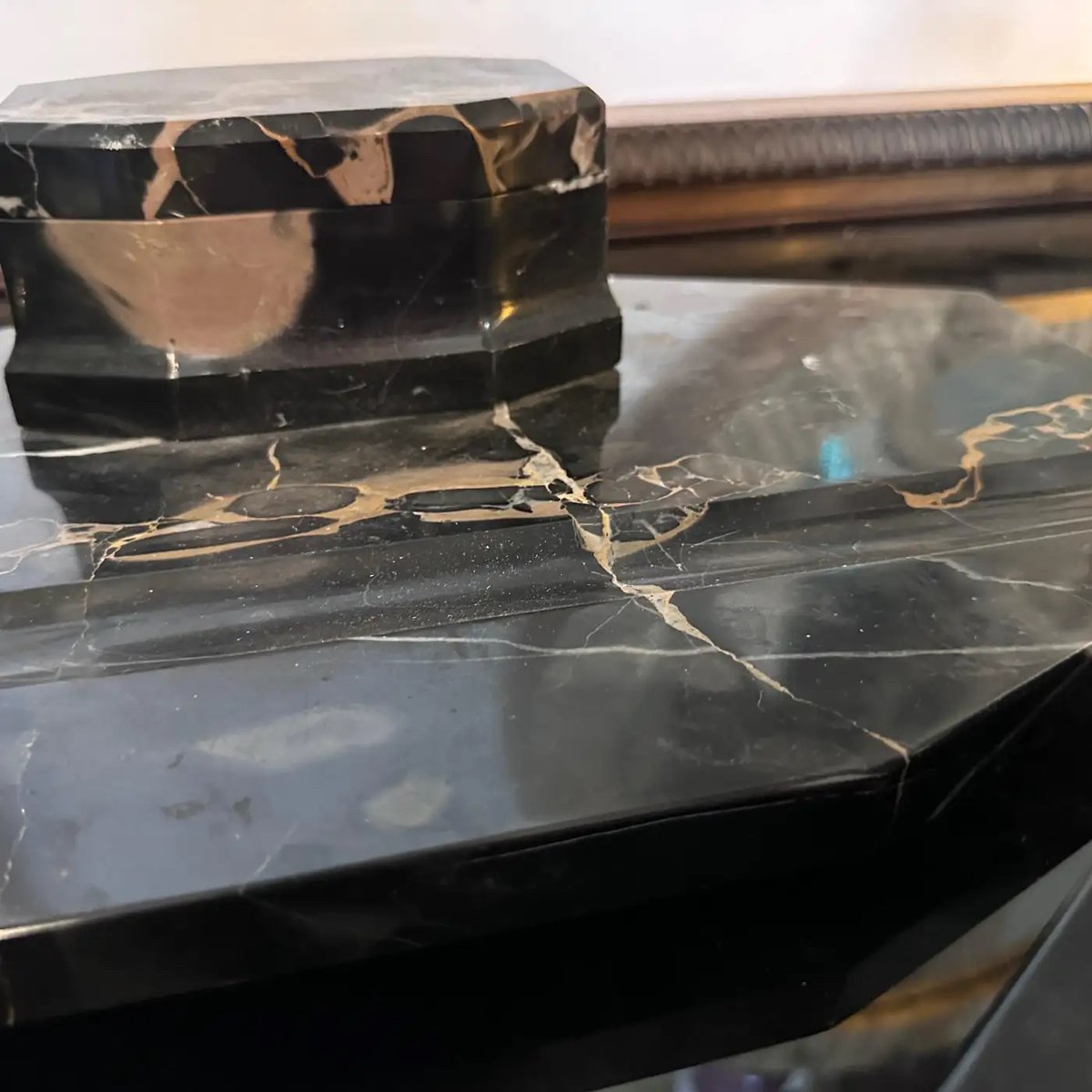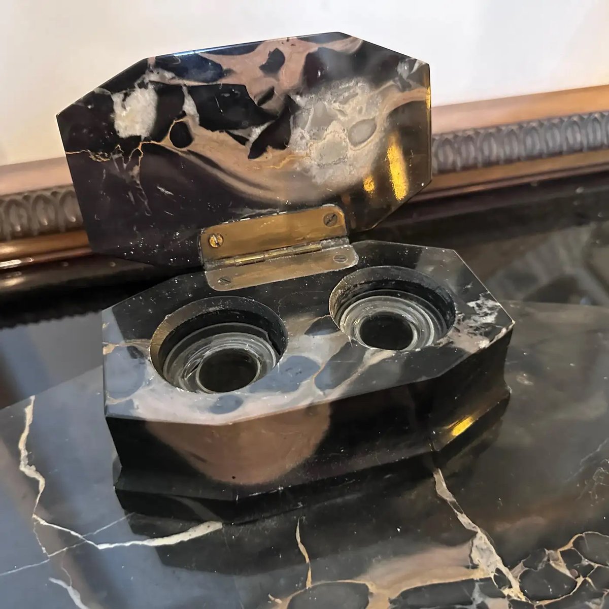 An art deco desk set manufactured in Italy in the Thirties, in original conditions with small signs of use and age, brass it's in original patina. Dimensions are of the Inkstand. This Desk Set is an exquisite embodiment of the opulent and geometric design aesthetic that defined the Art Deco movement during that era. Crafted with meticulous attention to detail, this desk set exudes luxury, sophistication, and a sense of timeless elegance. The set includes an inkstand, a paper holder and a signature pad, each thoughtfully designed to harmonize with the overall aesthetic. The primary material, Portoro marble, is a striking black marble with distinctive veins of gold or brass-like hues, adding a sense of drama and contrast to the ensemble. The marble is carefully cut and polished to showcase its natural beauty and unique veining patterns. Brass, a quintessential material of the Art Deco era, is incorporated into the design to create a stunning juxtaposition with the dark marble. The brass accents, often featuring geometric shapes and sleek lines, exude a sense of luxury and sophistication while complementing the marble's inherent elegance. The Italian origin of the desk set reflects the country's longstanding tradition of producing high-quality, luxurious goods. Italian artisans of the 1930s were known for their expertise in working with marble and metals, and this desk set is a testament to their skill and creativity. Placing this 1930s Art Deco Portoro Marble and Brass Italian Desk Set on a workspace would transform it into a luxurious and inspiring environment.