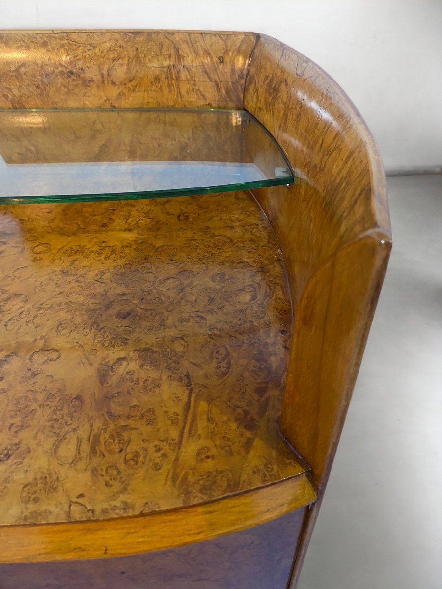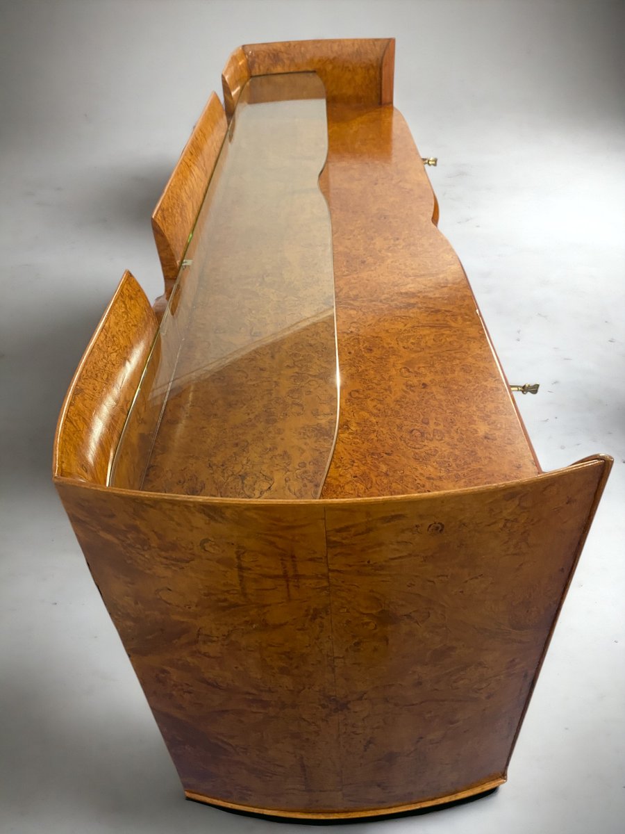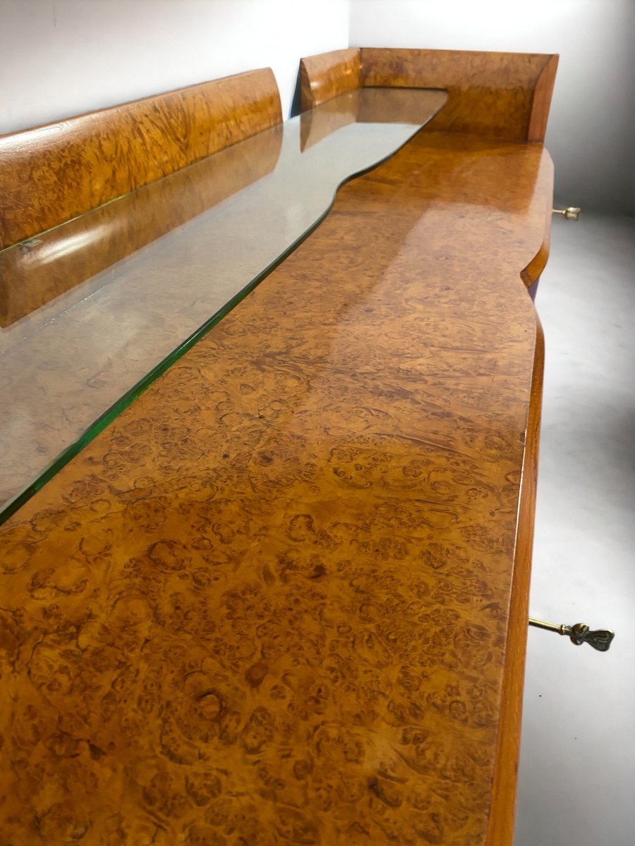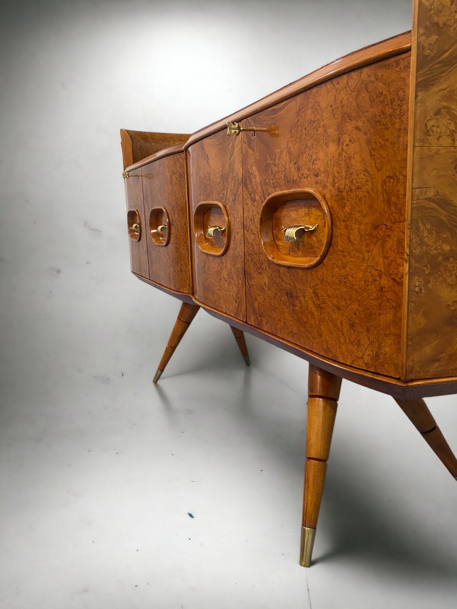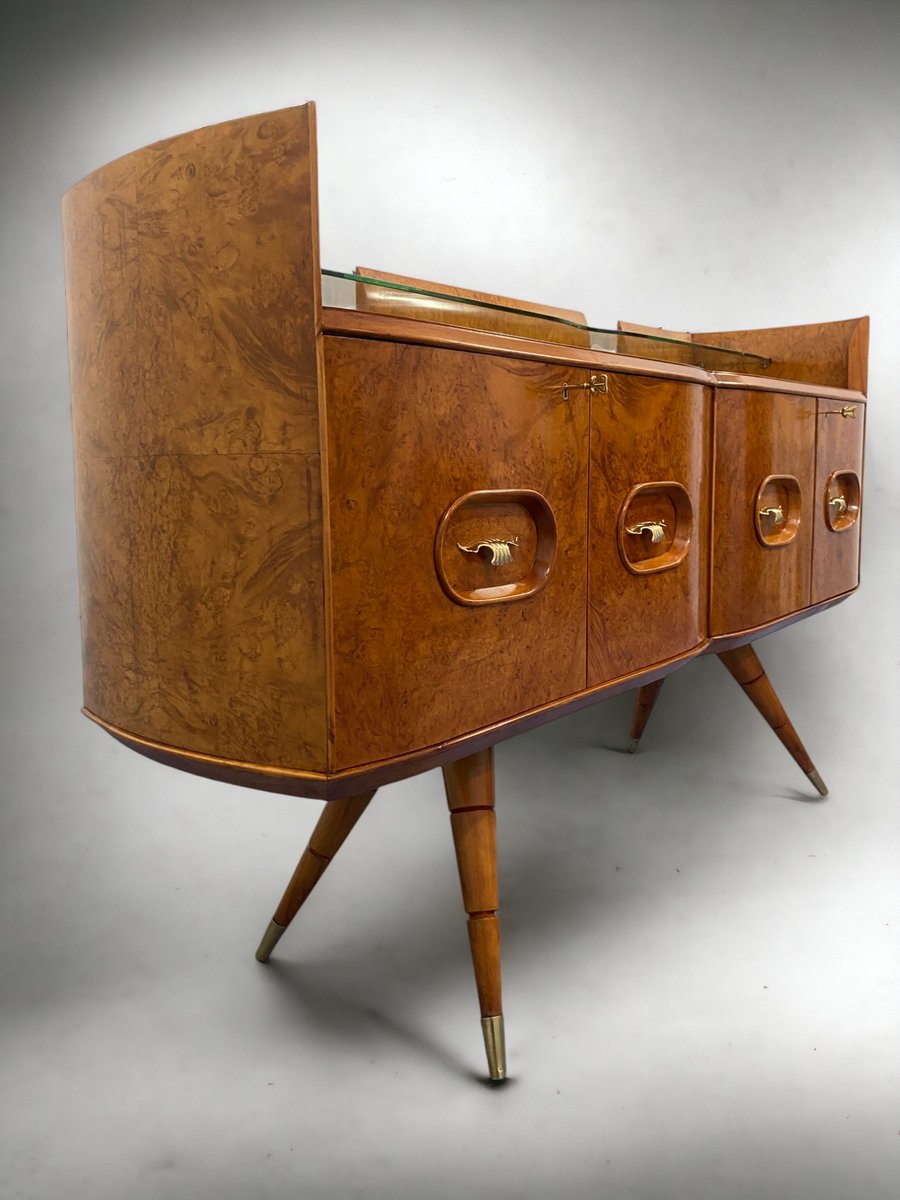 ieses italienische Mid-Century-Sideboard besteht aus elegantem Birkenholz, das dem Möbelstück eine warme und einladende Honigfarbe verleiht. Dieses exquisite Stück zeichnet sich durch ein raffiniertes Design mit einer sanft geschwungenen Front und abgerundeten Seiten aus, die ein harmonisches und visuell auffälliges Ensemble bilden. Besonders originell und raffiniert ist das spitz zulaufende Design der eleganten Beine, das dem Möbelstück einen Hauch von Raffinesse und Eleganz verleiht.