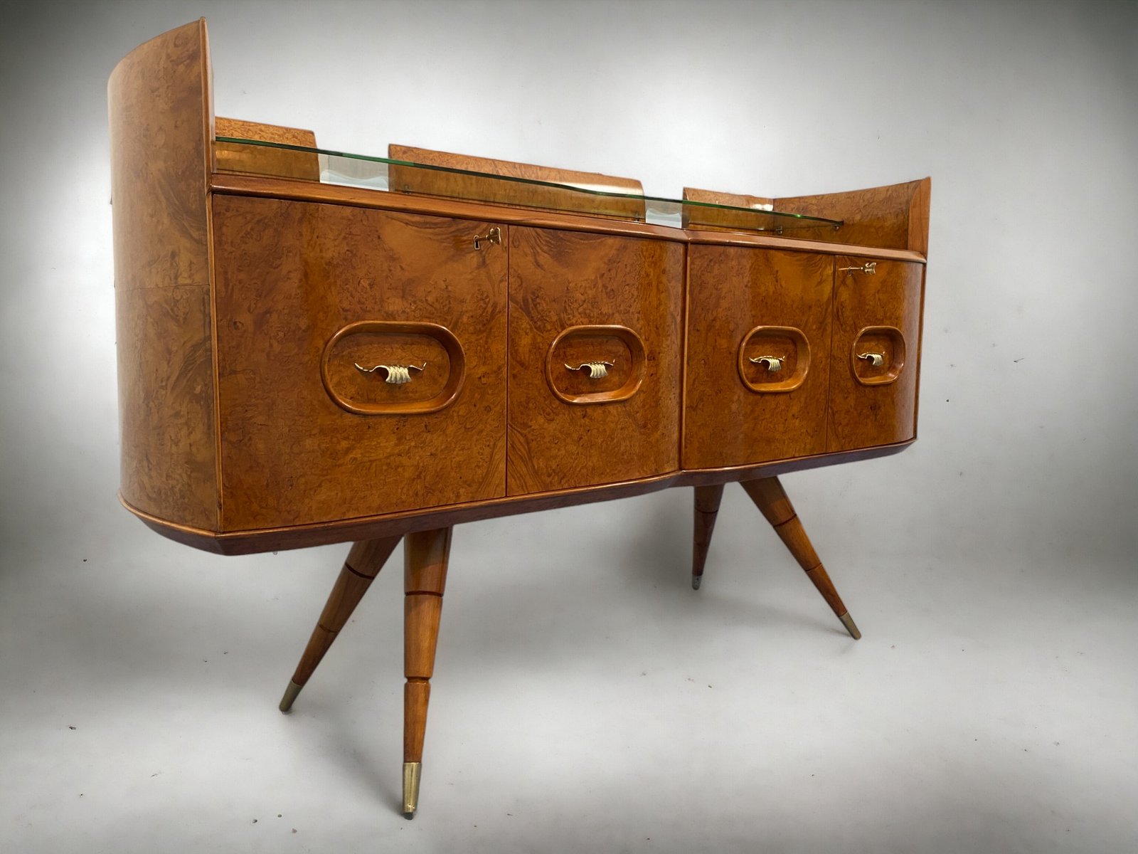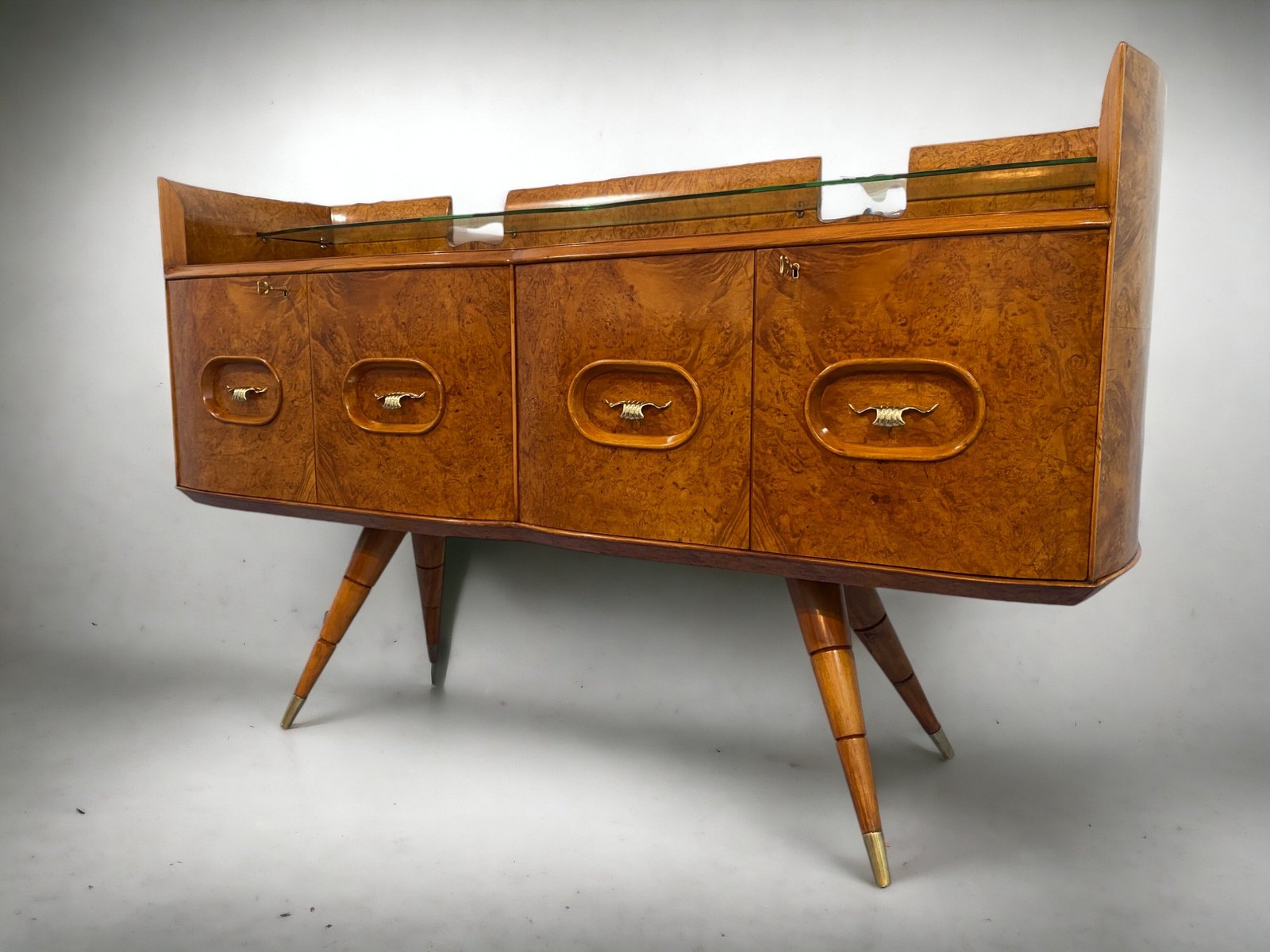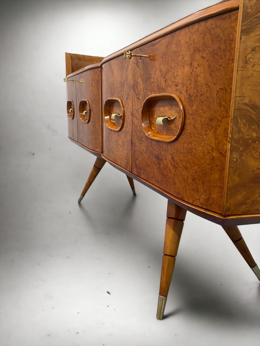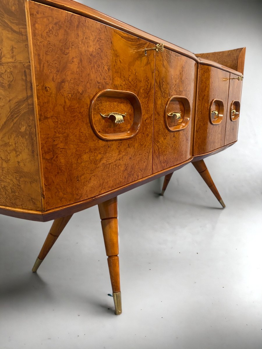 orgeous Italian Mid-Century sideboard made of elegant birch wood that gives the piece a warm and welcoming honey color. This exquisite piece features a refined design with a softly curved front and rounded sides, creating a harmonious and visually striking ensemble. Particularly original and sophisticated is the spiked design of the elegant legs, which adds a touch of refinement and elegance to the piece.