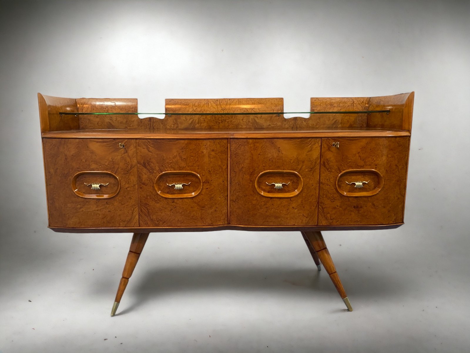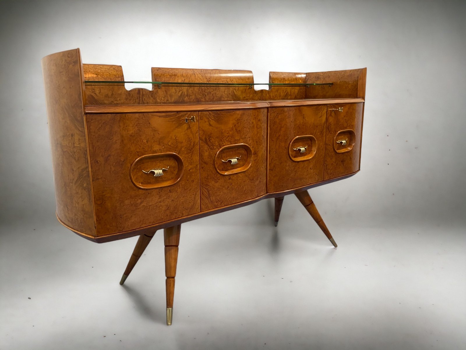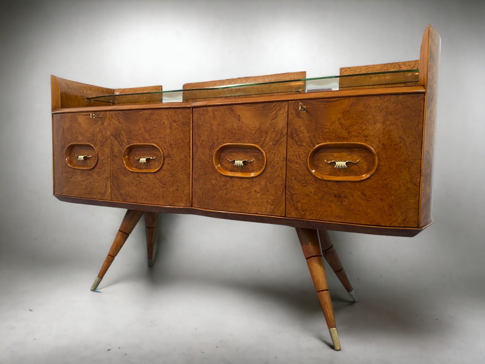 orgeous Italian Mid-Century sideboard made of elegant birch wood that gives the piece a warm and welcoming honey color. This exquisite piece features a refined design with a softly curved front and rounded sides, creating a harmonious and visually striking ensemble. Particularly original and sophisticated is the spiked design of the elegant legs, which adds a touch of refinement and elegance to the piece.