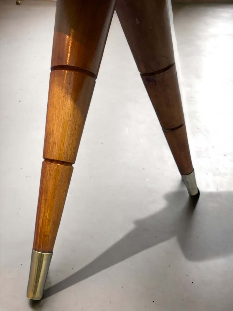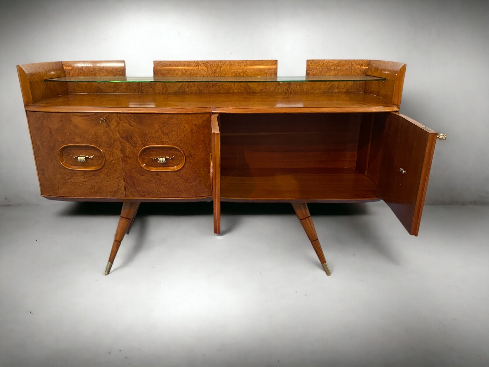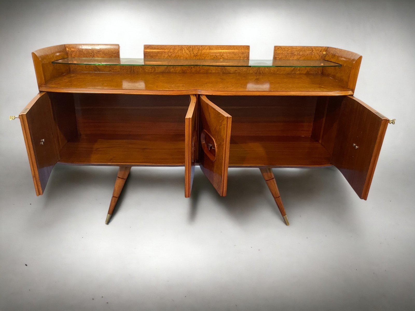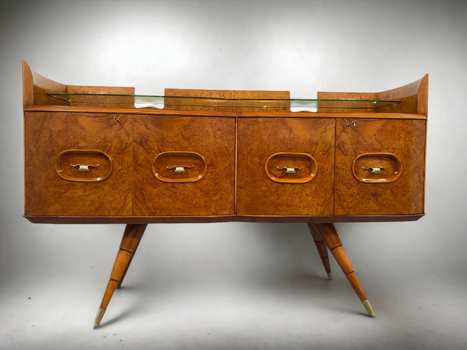 orgeous Italian Mid-Century sideboard made of elegant birch wood that gives the piece a warm and welcoming honey color. This exquisite piece features a refined design with a softly curved front and rounded sides, creating a harmonious and visually striking ensemble. Particularly original and sophisticated is the spiked design of the elegant legs, which adds a touch of refinement and elegance to the piece.