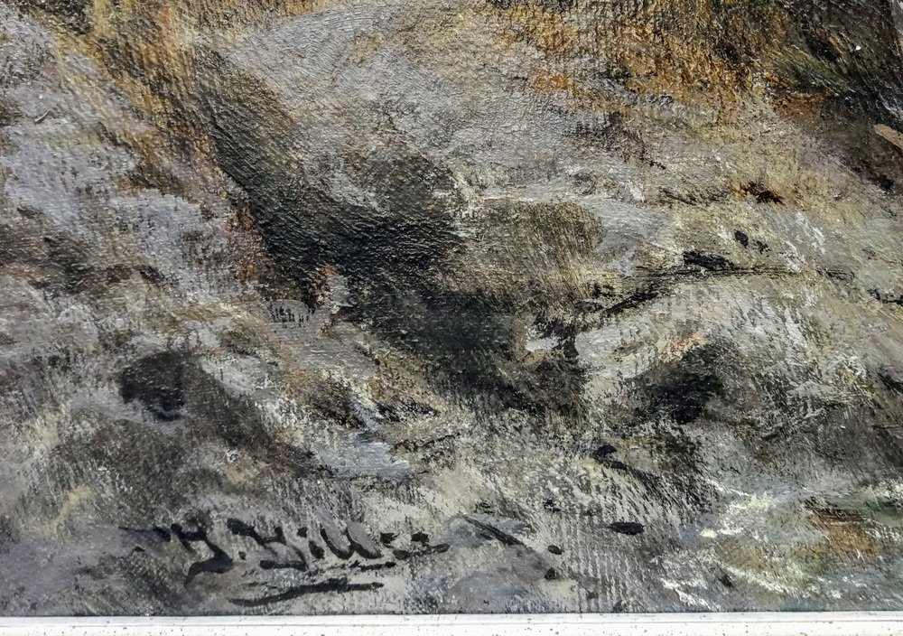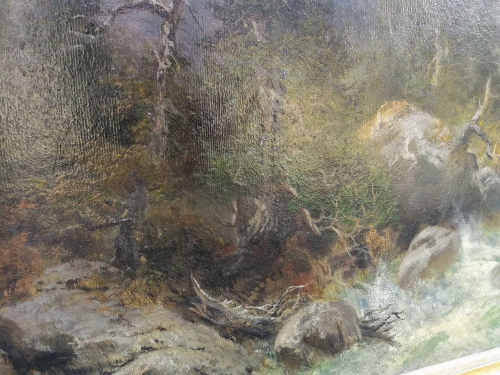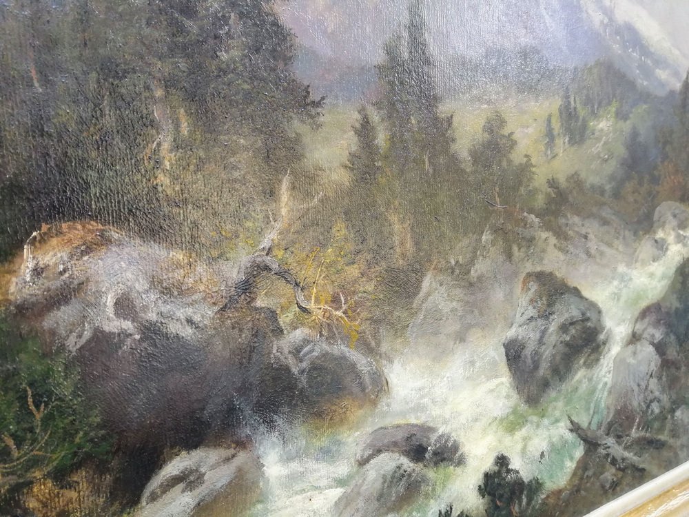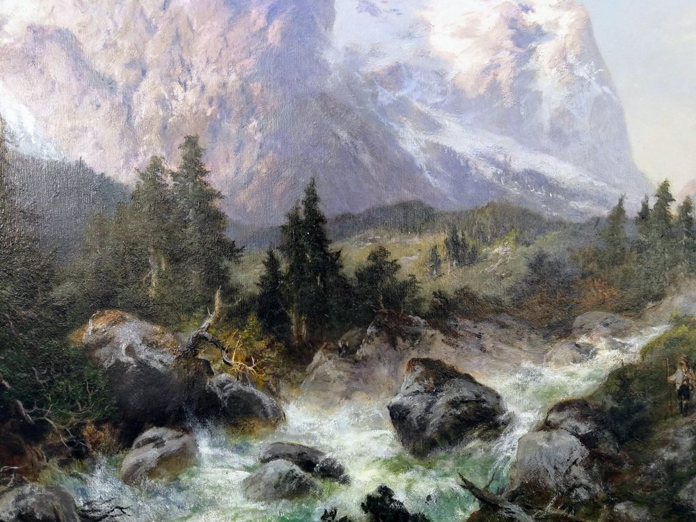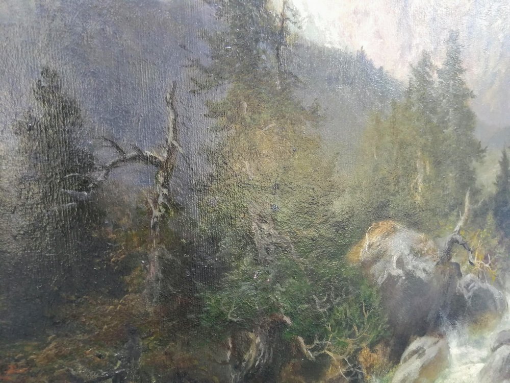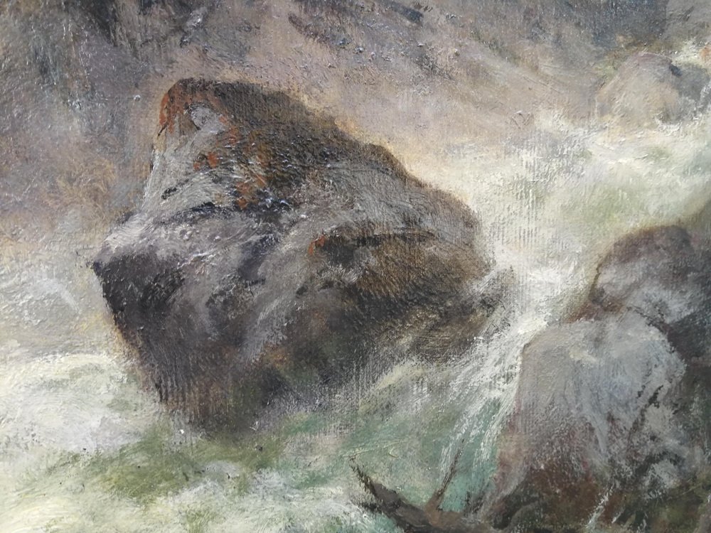 It has been divided into three main zones, each of them paying homage to the painted nature in its own, unusual and different way. The lower part of the painting is occupied by a rapid, foamy river whose bed and banks are filled with mossy boulders and broken fragments of trees. On the left bank, slightly above the river, there are conifers, the darkest and most mysterious part of the painting. The whole thing is crowned with a wonderful view of the snow-capped, steep mountain peaks in the distance with a pastel-painted sky.