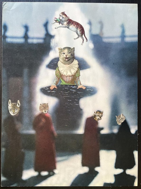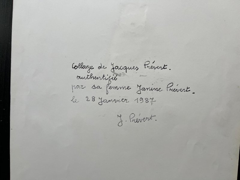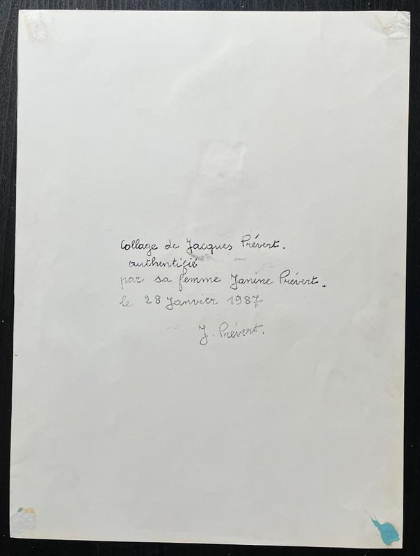 Jacques PREVERT (1900 - 1977), French poet and screenwriter The Cat Fountain Rare original collage on unsigned paper. Shows mounting marks on the back, creases in the upper left corner. Good condition. Dimensions: 43 x 32 cm Posthumous authentication dated January 28, 1987 by Janine Prévert, widow of Jacques Prévert, on the back of the collage. Jacques Prévert, a cat lover, gives free rein to his imagination to give us a magical spectacle, tinged with poetry, at the cat fountain. Jacques Prévert built his reputation as a visual artist around his splendid surrealist collages, tinged with poetry, which have been the subject of several exhibitions, notably at the Maeght Foundation in Saint Paul de Vence.