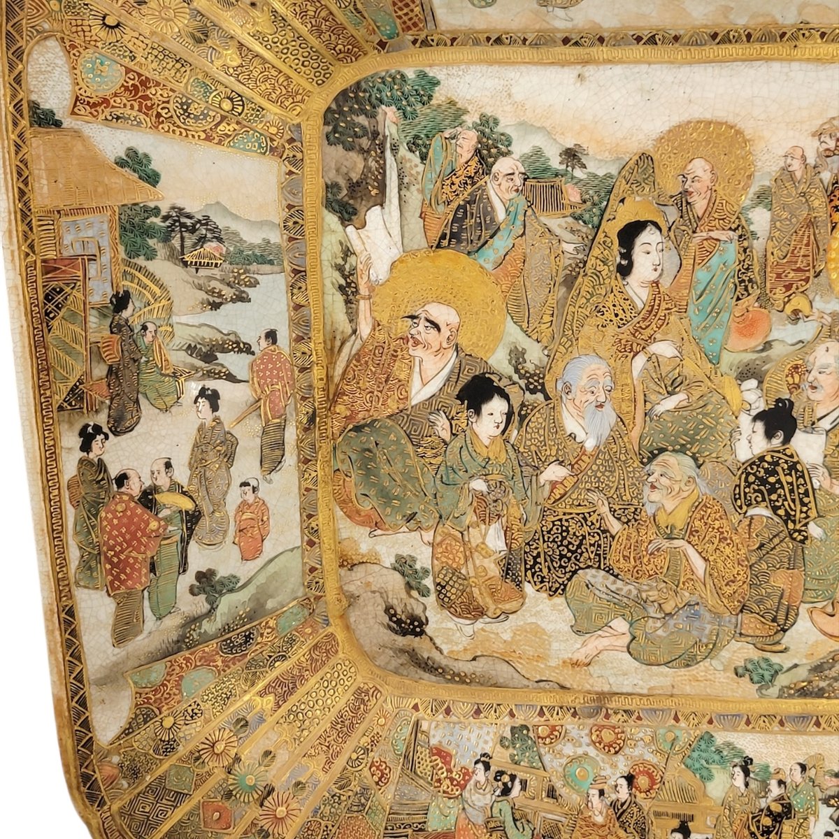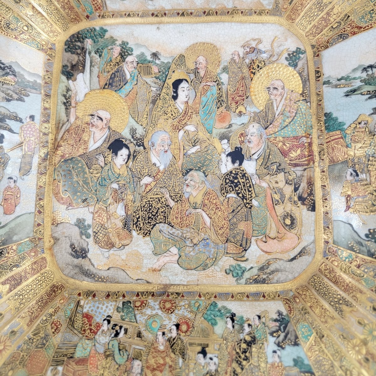 In der Mitte ist eine Versammlung buddhistischer Rakan dargestellt, jeder mit unverwechselbarem Ausdruck und vergoldeten Gewändern, daneben eine heitere weibliche Figur, möglicherweise Kannon. Die umliegenden fächerförmigen Tafeln zeigen das höfische Leben und zeremonielle Szenen, die dicht im Kyotoer Awata-Stil gemustert sind.