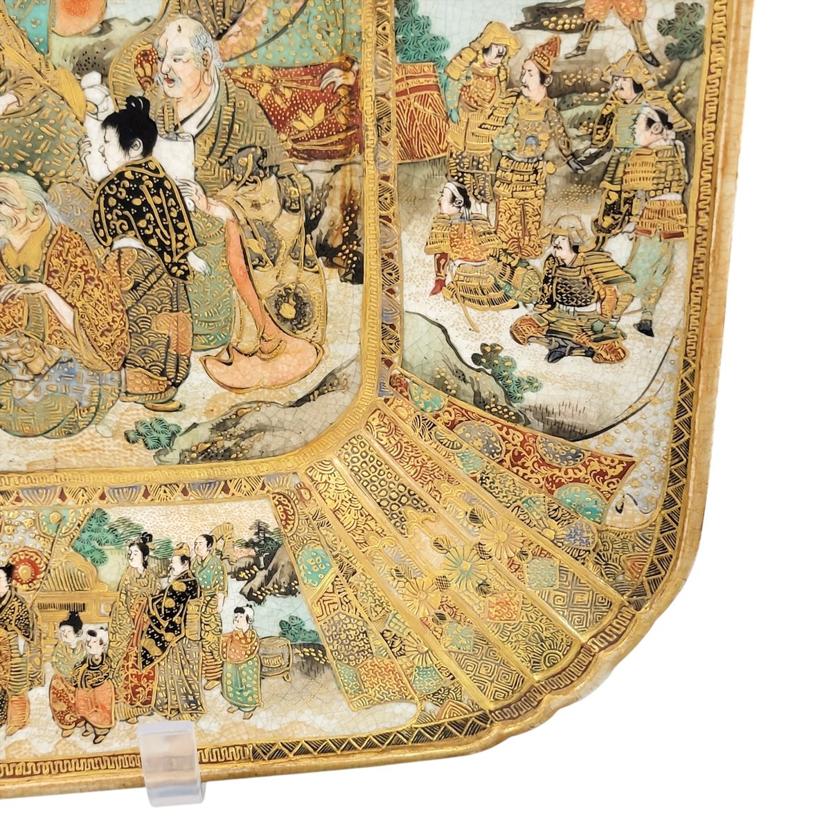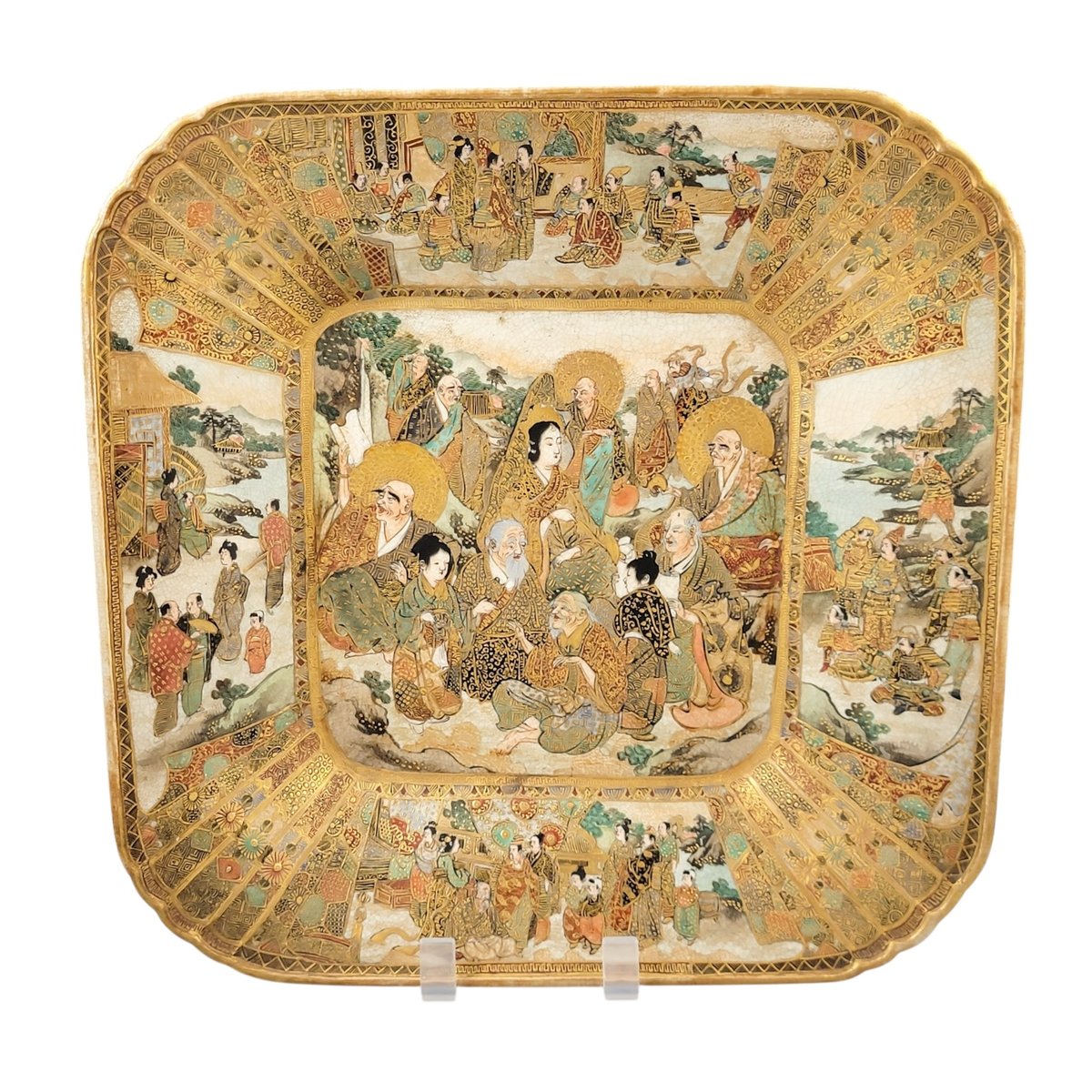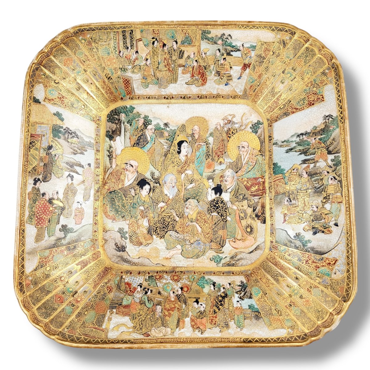 An exceptional late-Meiji Kyoto Satsuma dish of square flared form, lavishly painted with intricate scenes in enamel and raised gilding.