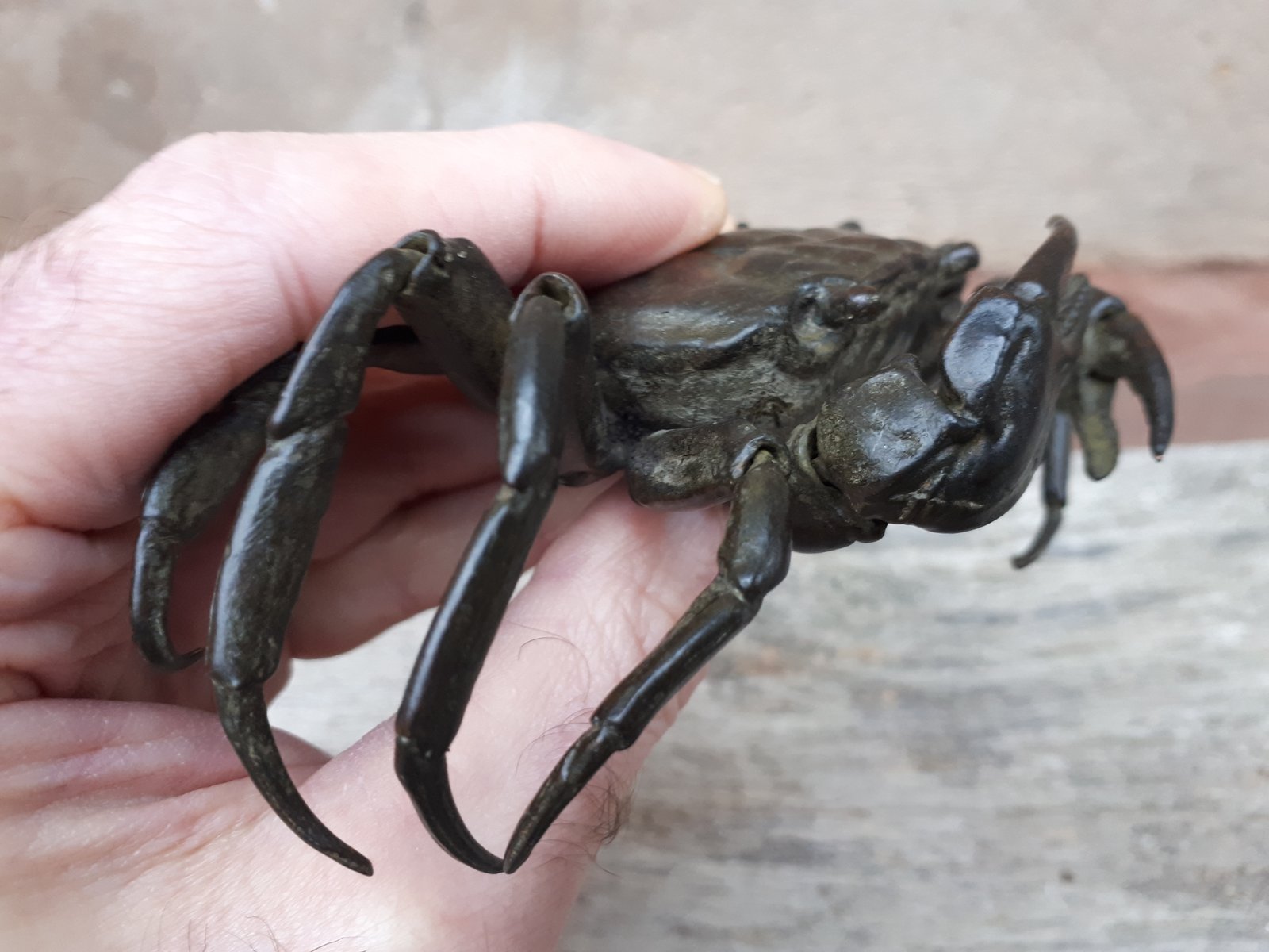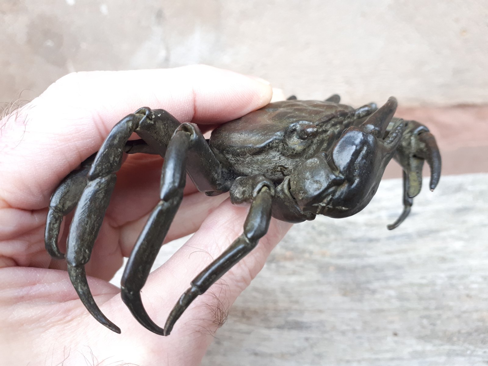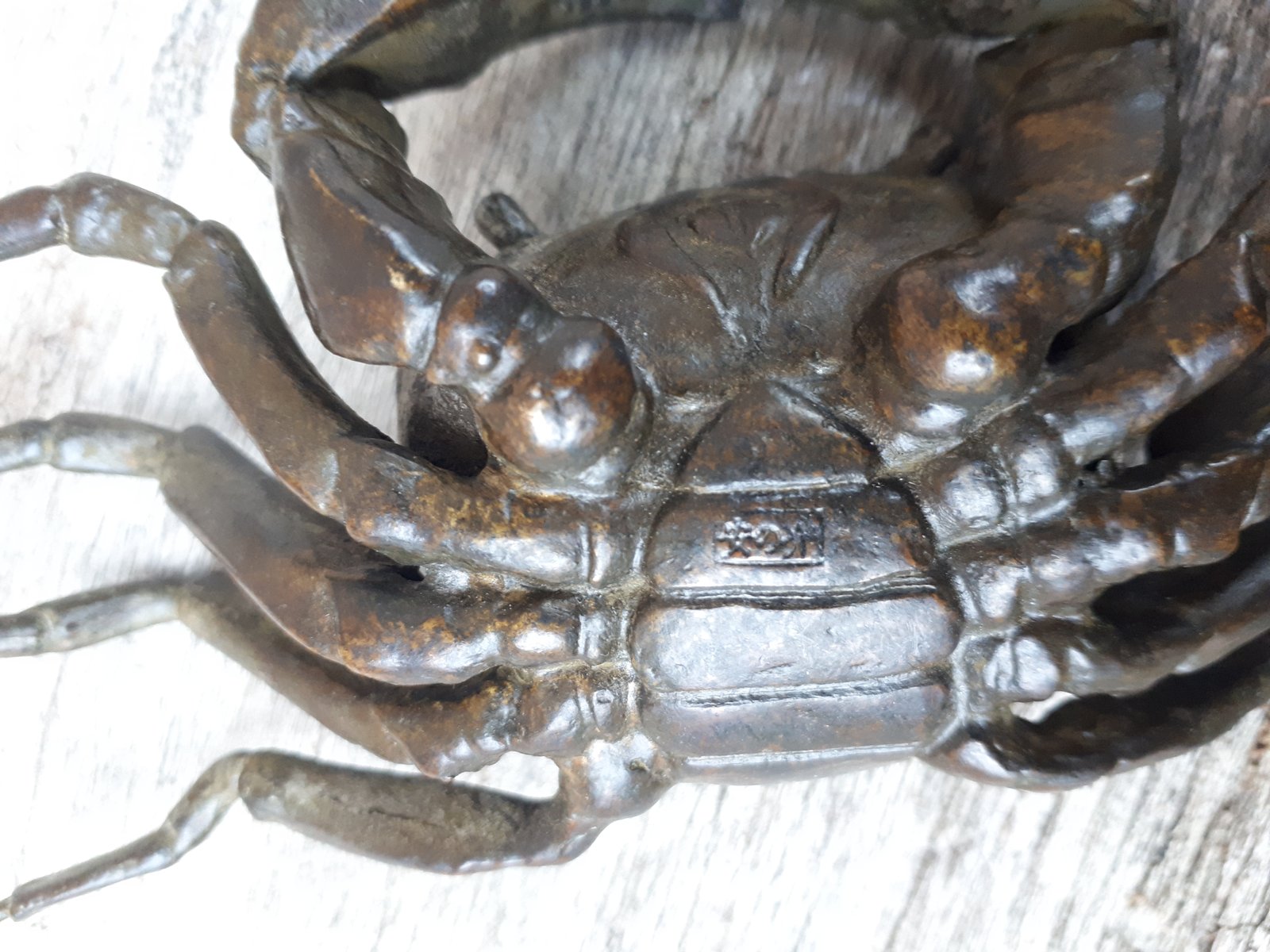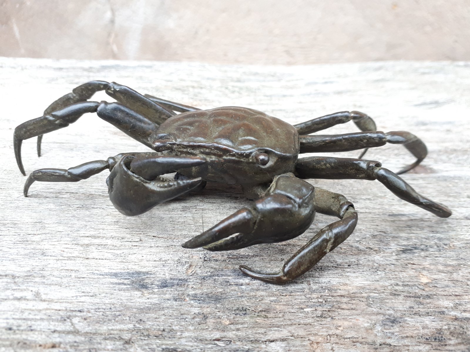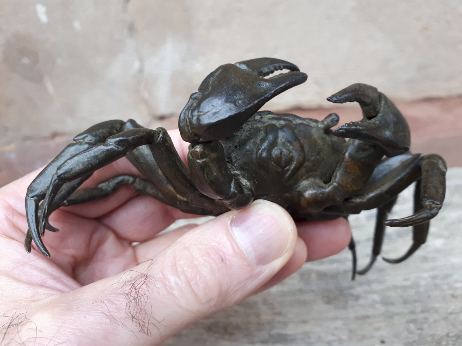 Rare articulated okimono in bronze with brown patina representing a crab, identical to those found in nature.