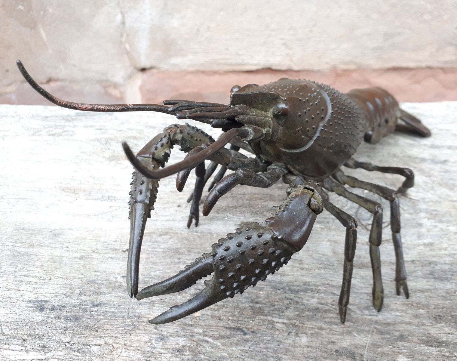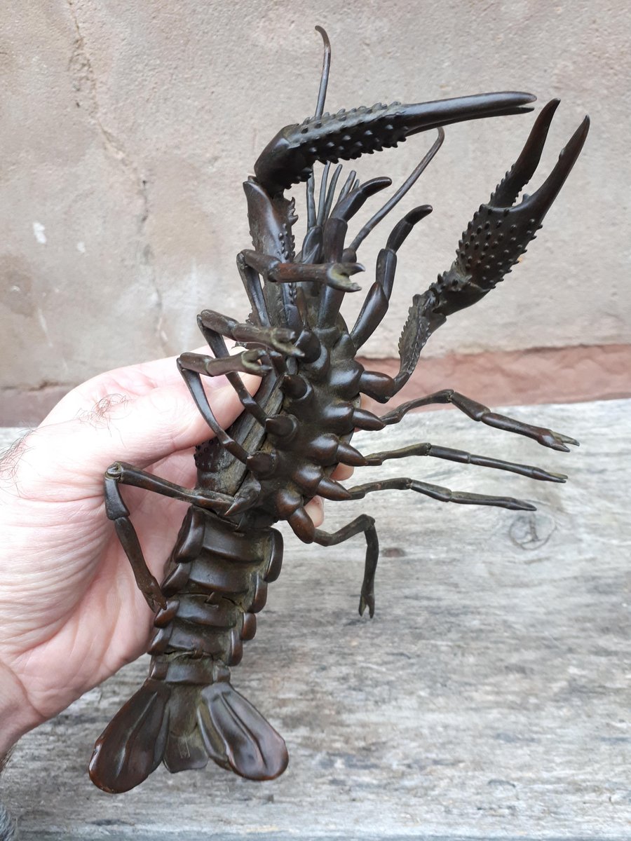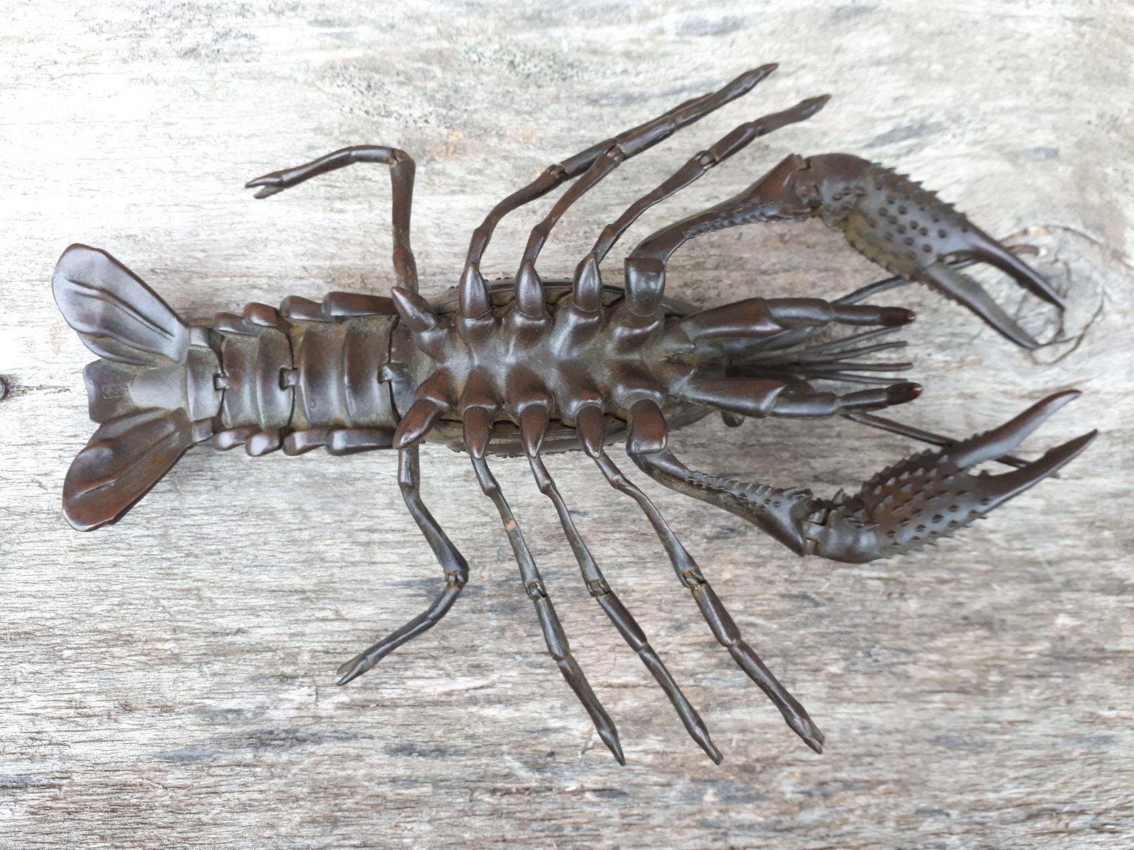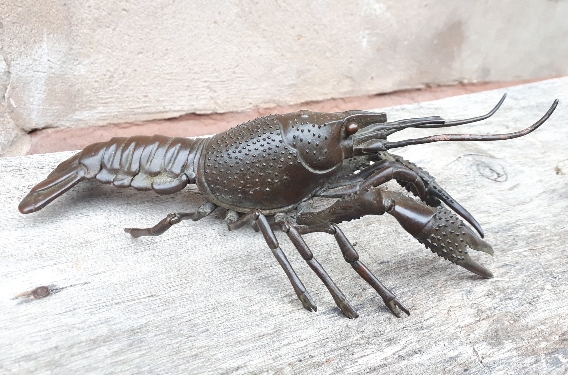 Rare articulated okimono in bronze with brown patina representing a crayfish, identical to those that can be found in nature.